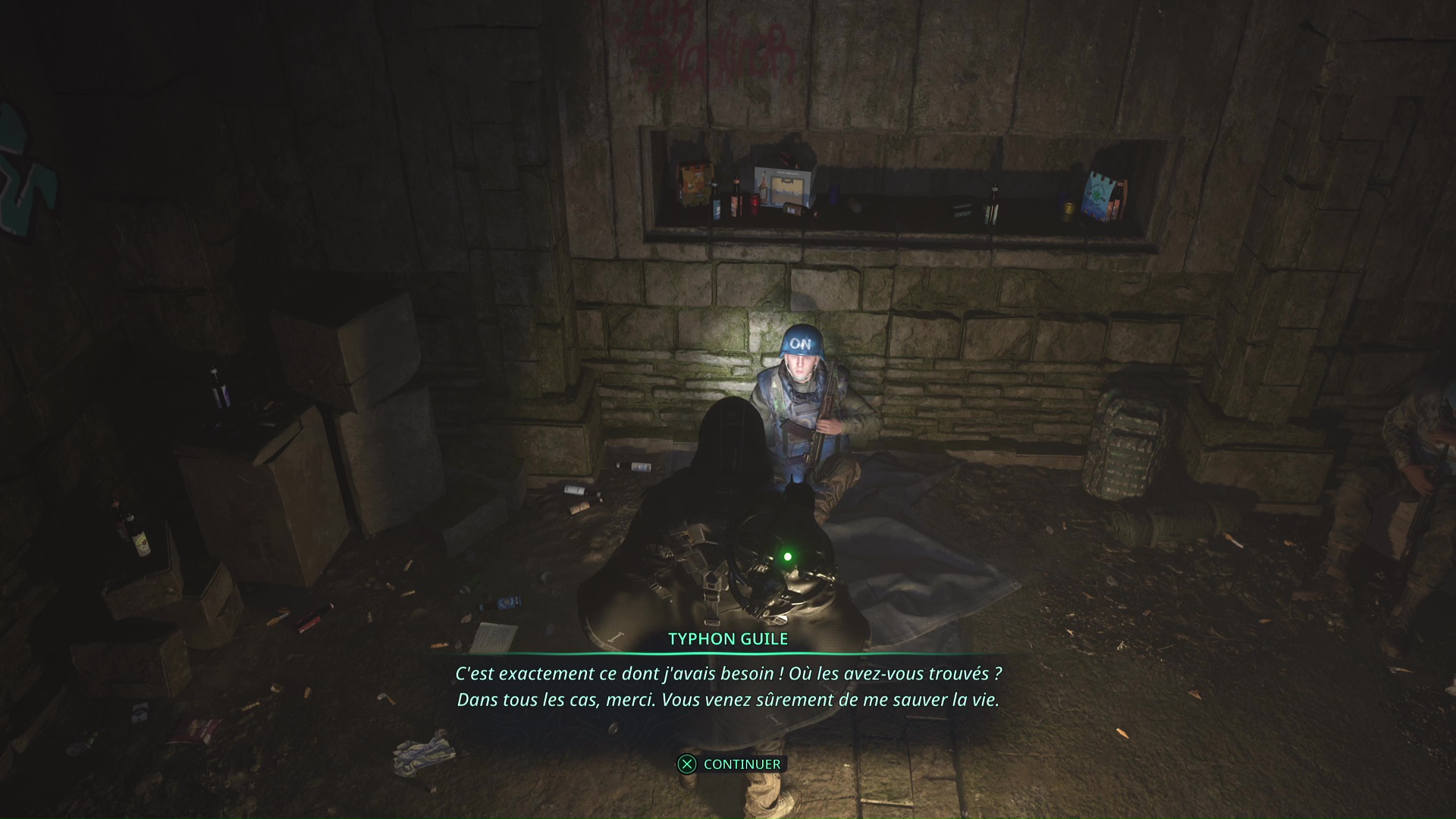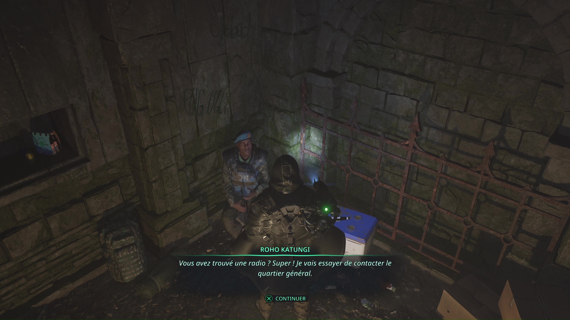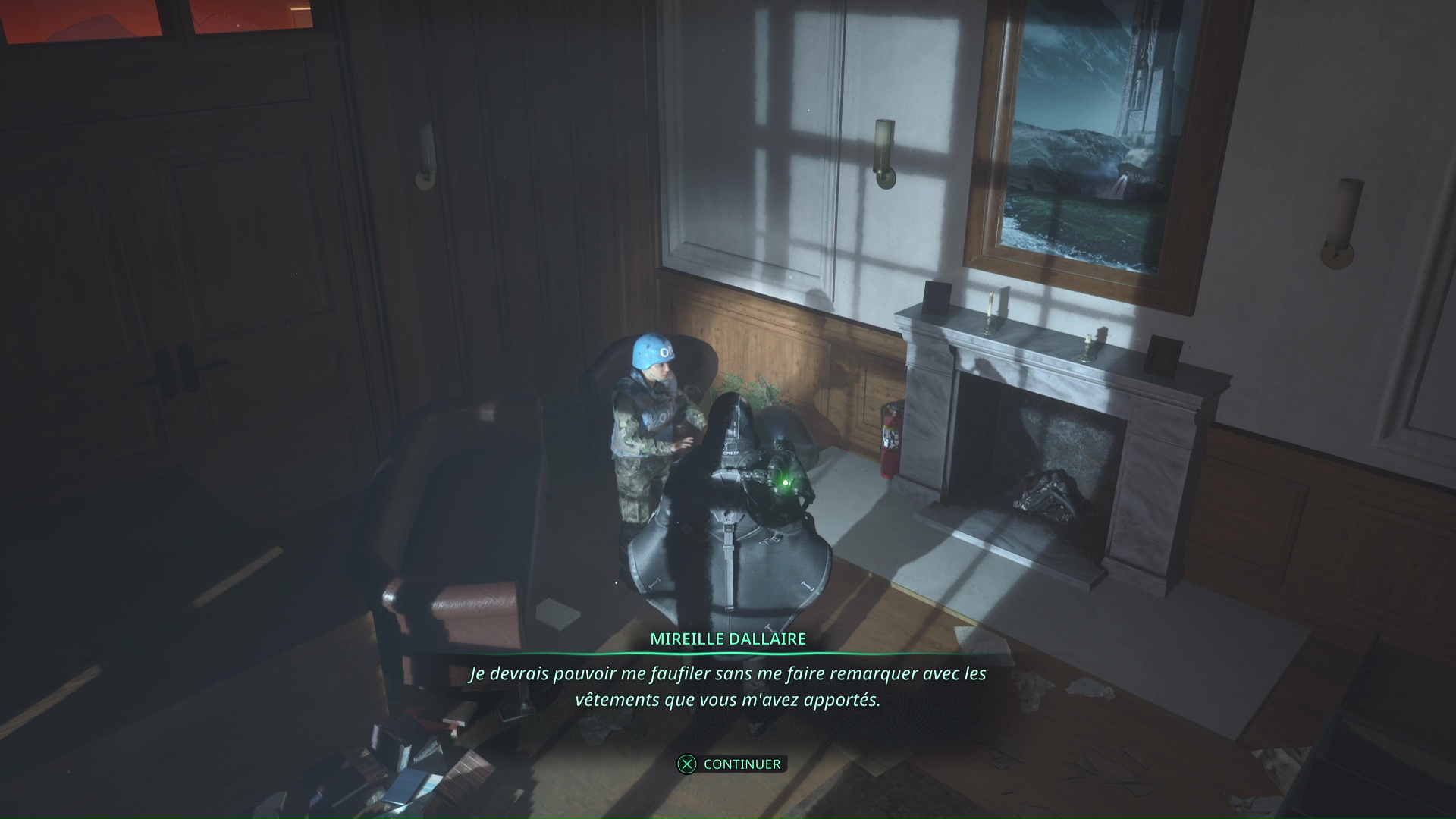 Avancez plus loin à l’étage jusqu’à ouvrir une pièce où se trouve dedans une soldate ON du nom de Mireille Dallaire. Donnez-lui les vêtements de femme pour qu’elle puisse sortir en sécurité du bâtiment, ce qui validera la bonne action.
