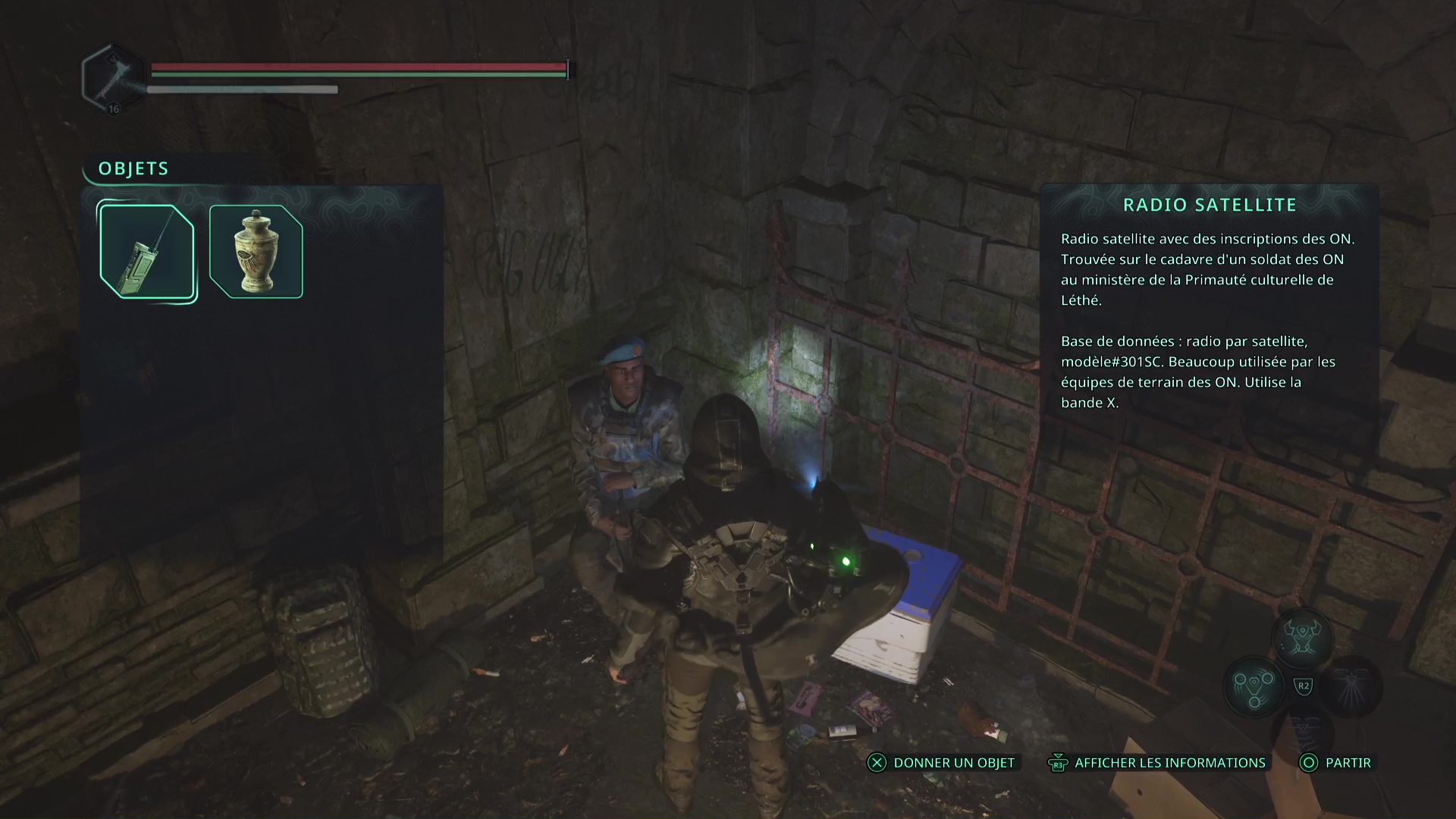 Dans la pièce suivante, ouvrez une autre porte pour débarquer dans le couloir condamné avec un cadavre ON Récupérez ensuite l’objet brillant sur le cadavre ON. Il s’agit de la radio satellite.