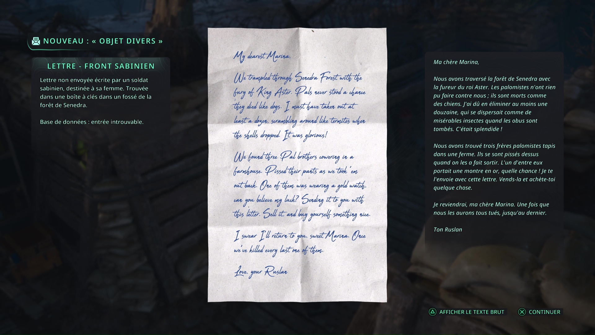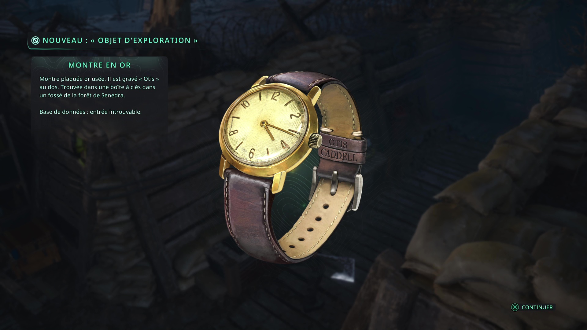 Juste après être sorti du souterrain de Senedra, vous vous retrouvez dans des tranchées. Un objet brillant se trouve tout près, sur un banc. Ramassez-le, et vous obtiendrez la Lettre – Front sabinien et surtout une montre en or.