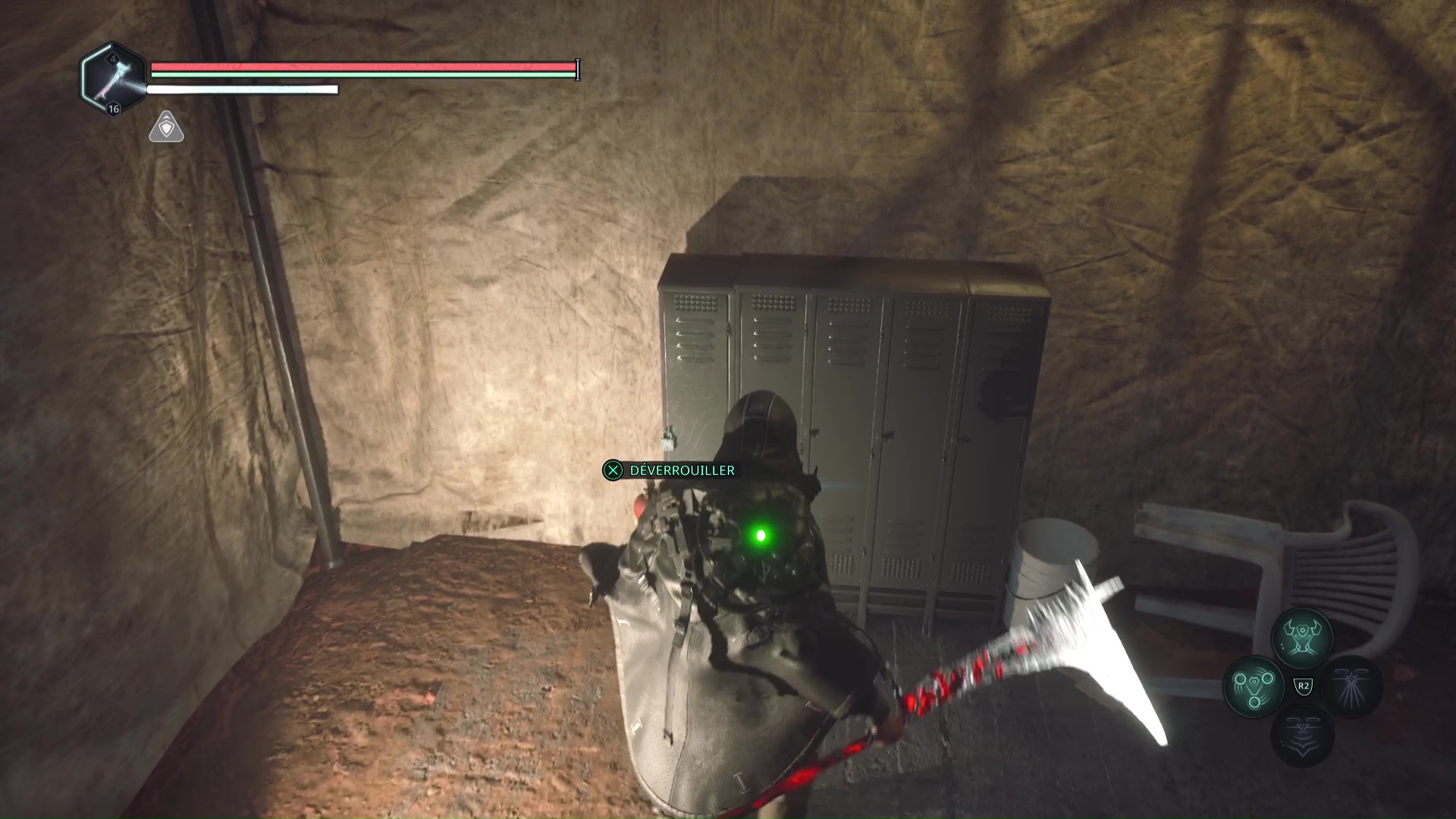 Mais vous allez pouvoir accomplir sa volonté. Le but est de d’abord trouver les clés de son casier. Elles se trouvent justement dans la salle de la boucle temporelle. Poursuivez-donc dans les souterrains et, dans la salle où l’on vous tirera dessus, cherchez un conduit au niveau du mur de gauche. Empruntez-le et battez les ennemis.