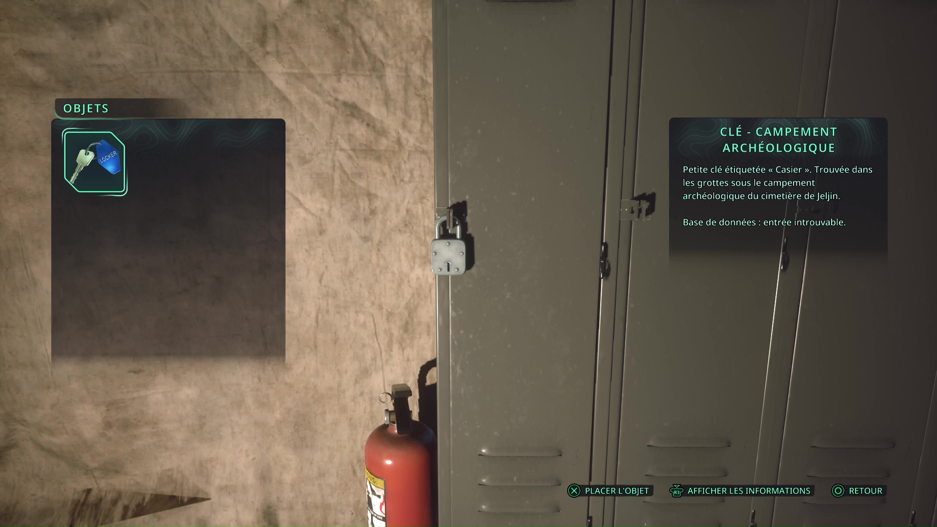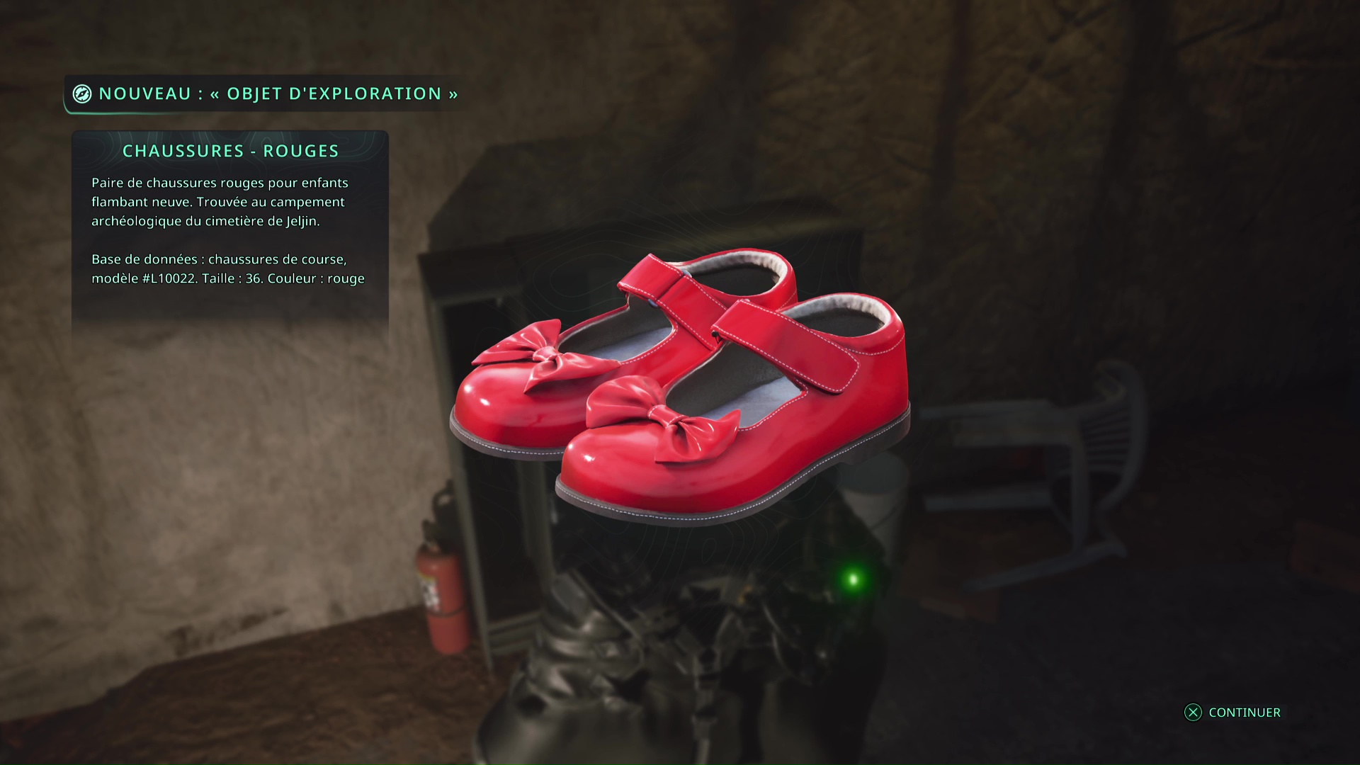 Retournez aux tentes du campement archéologique. Allez justement dans celle qui contient des casiers et déverrouillez-en un avec la clé. Vous obtiendrez les Chaussures – Rouges.