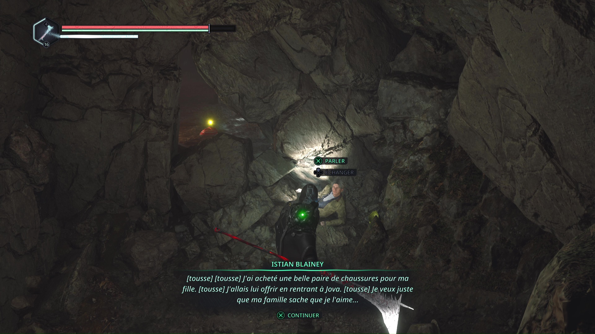 En bas, serrez à gauche et vous tomberez sur un homme coincé dans un éboulement (vous apercevrez la boucle temporelle du niveau à travers un trou). Parlez-lui et il vous confiera son regret de ne pas avoir pu offrir de nouvelles chaussures à sa fille.