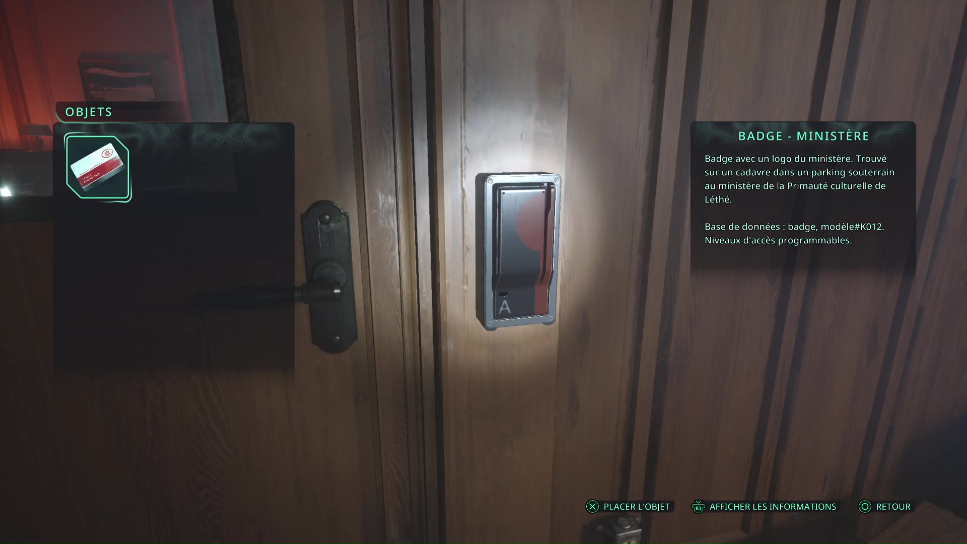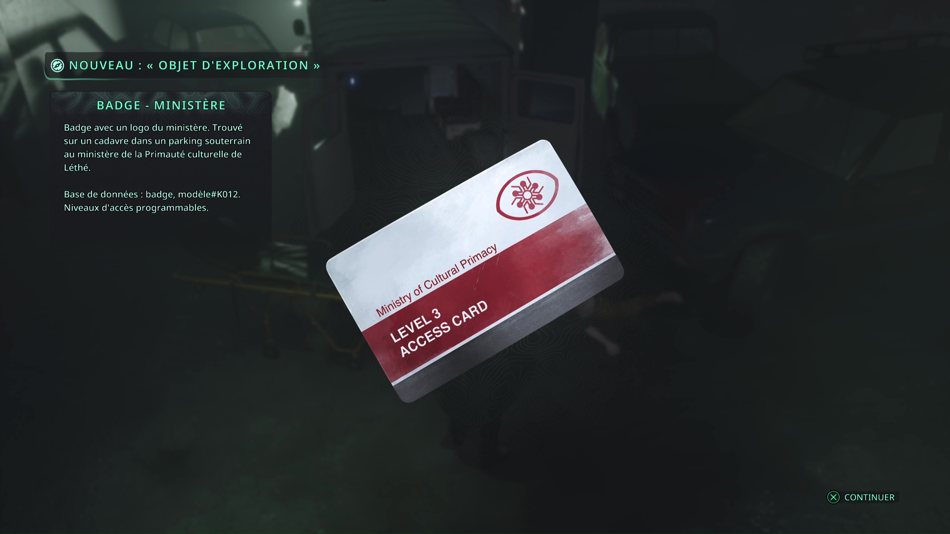 Dès le début du niveau Lethé – Ministère de la Primauté culturelle, descendez le parking d’un étage pour apercevoir avec un point brillant dessus. Ramassez-le, il s’agit d’un Badge – Ministère.