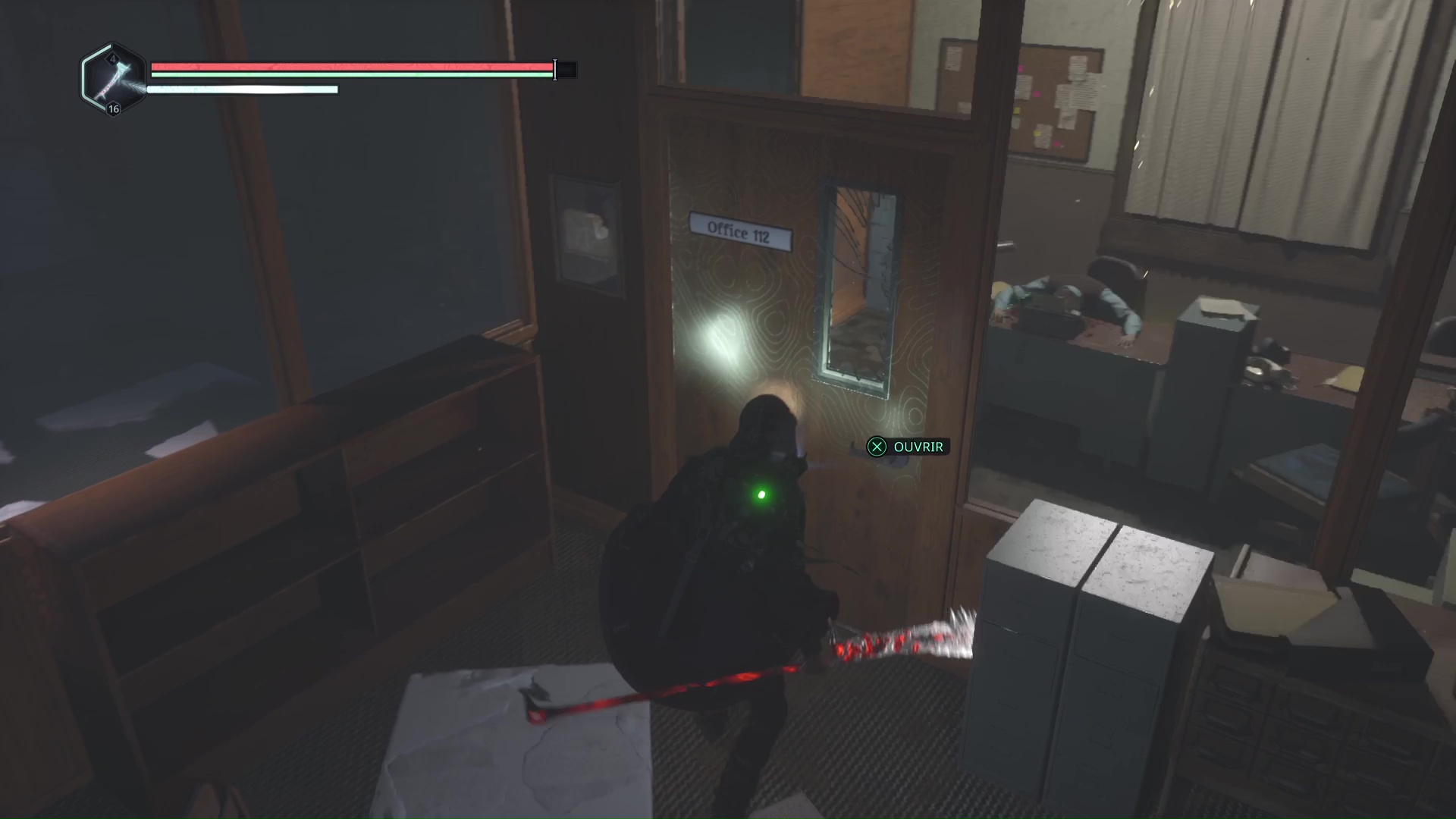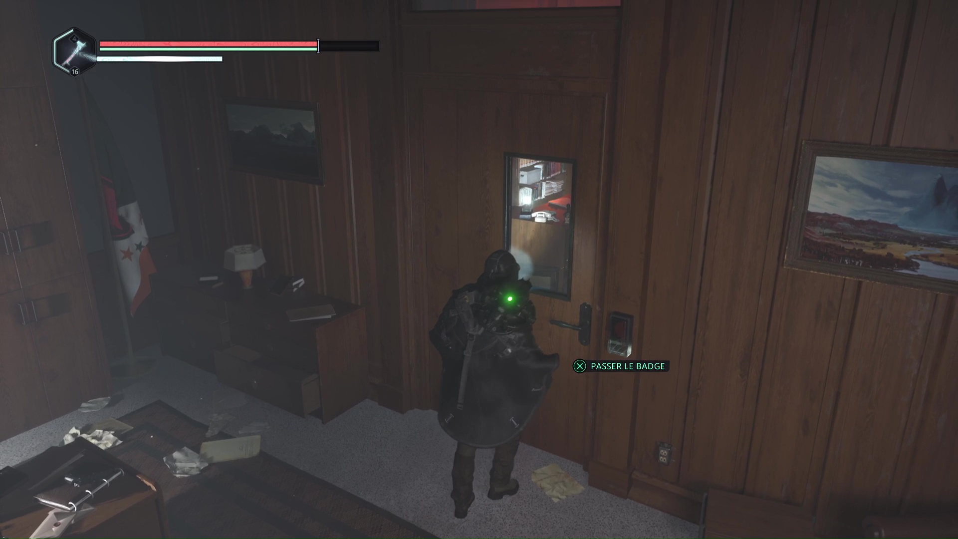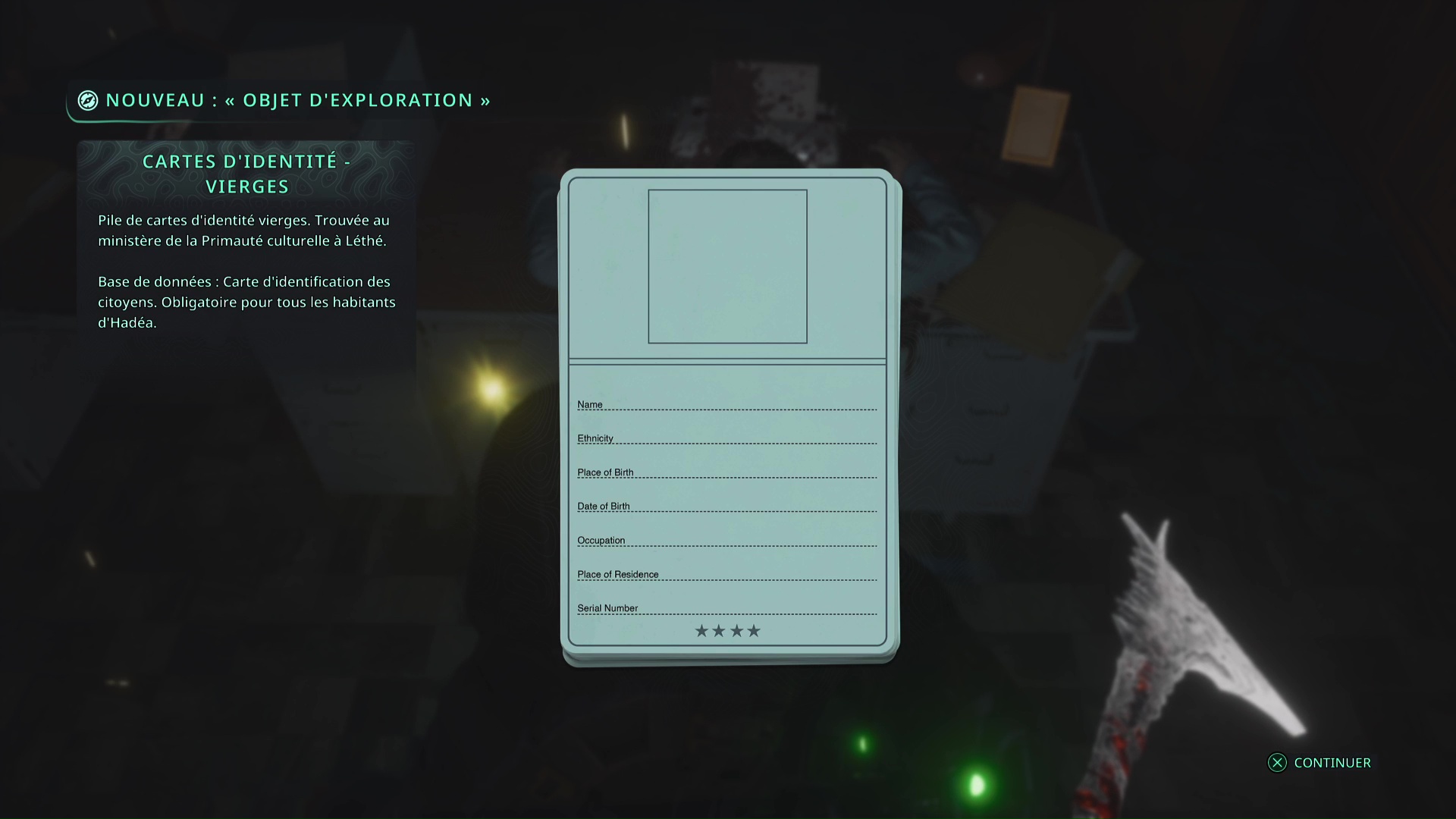 Ensuite, et presque juste à côté, entrez dans le bureau 112 et approche du cadavre affalé sur son bureau. A sa gauche, au niveau du tiroir, se trouvent les Cartes d’identité – Vierges.