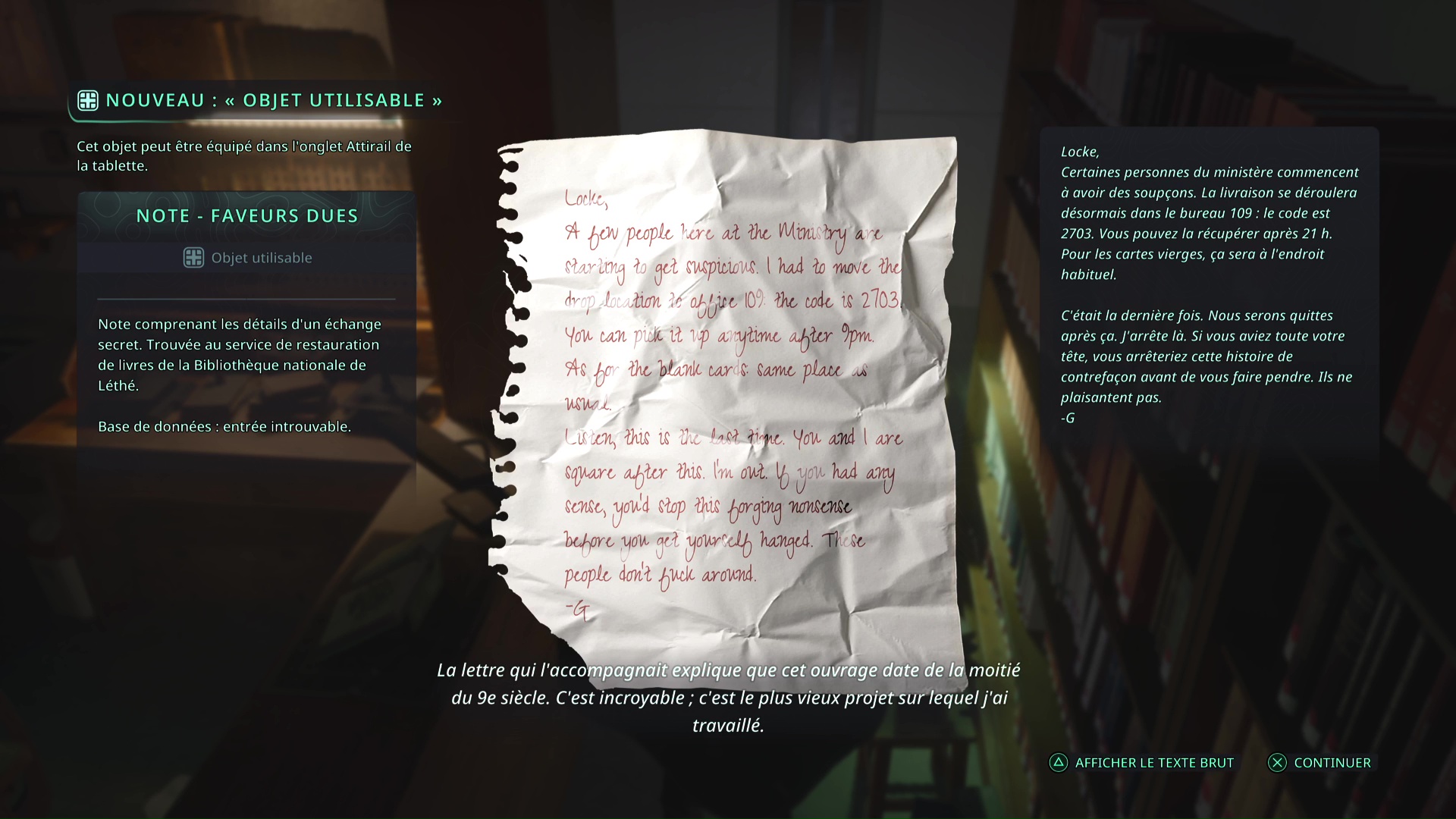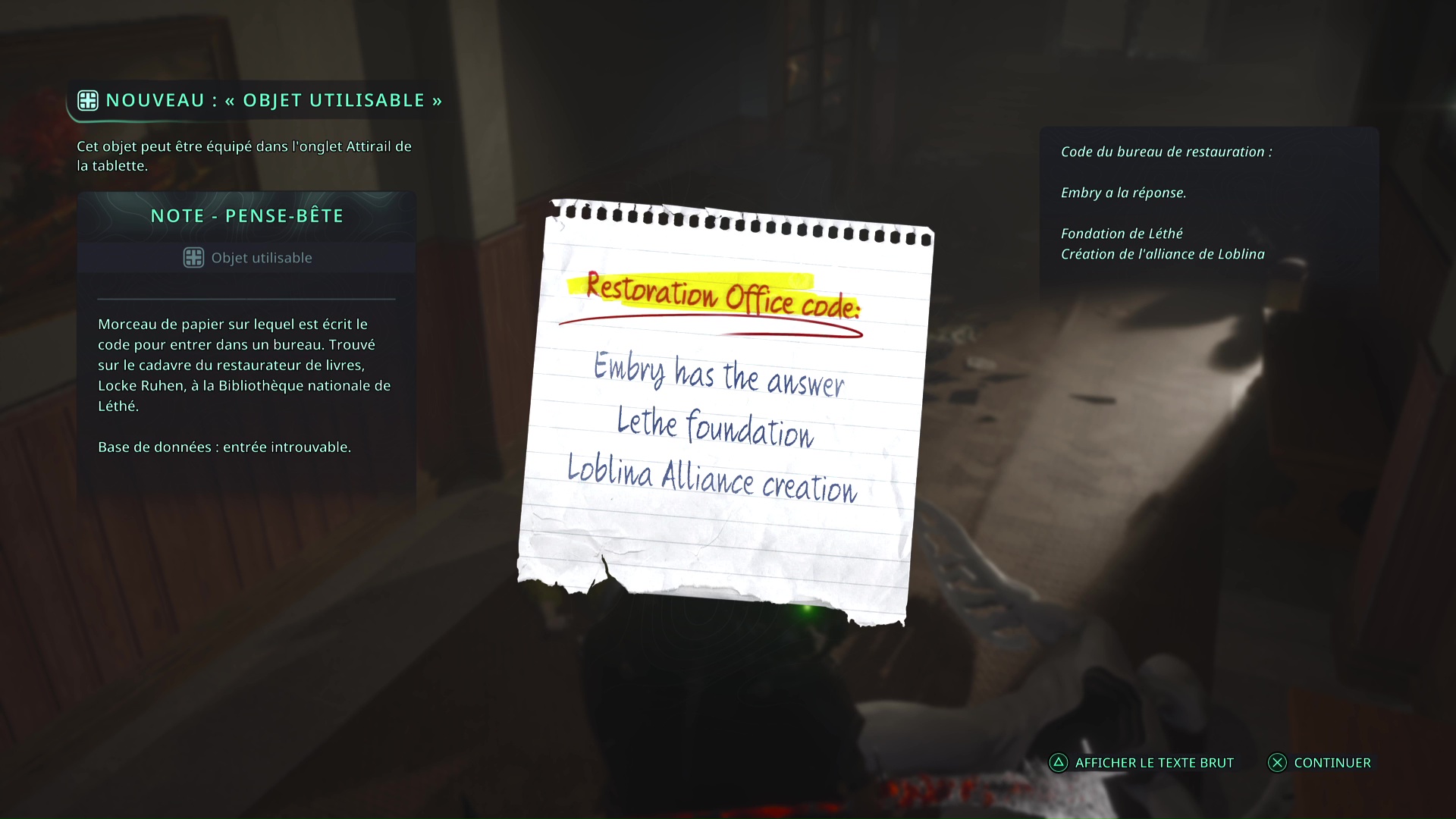 Il s’agit de l’association des dates des deux livres mentionnés, soit : 537734. Retournez donc au sol déverrouiller la porte puis collectez la Note – Faveurs dues dans un coin de la pièce.