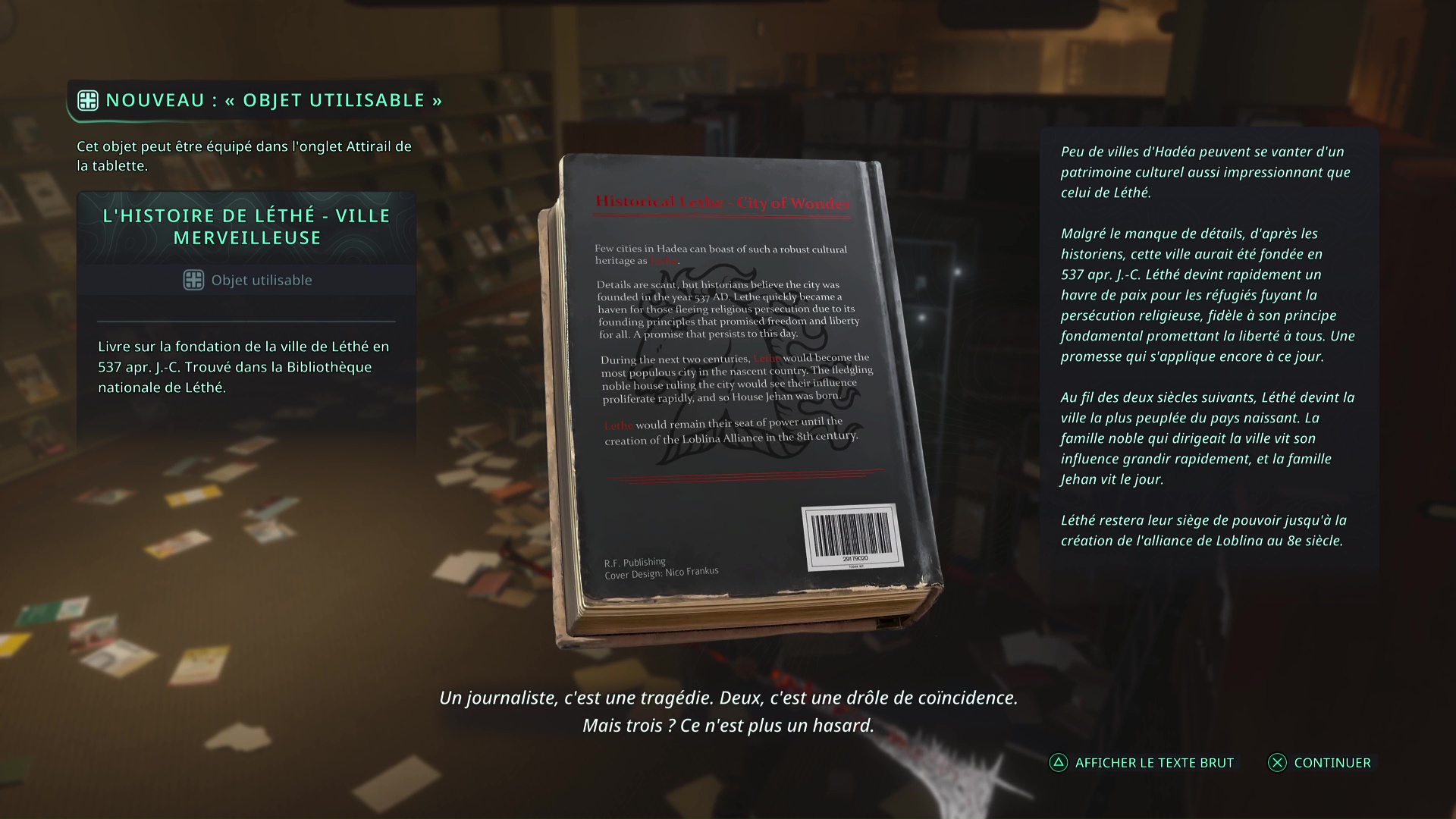 - Emplacement du PNJ : Lethé – Bibliothèque nationale