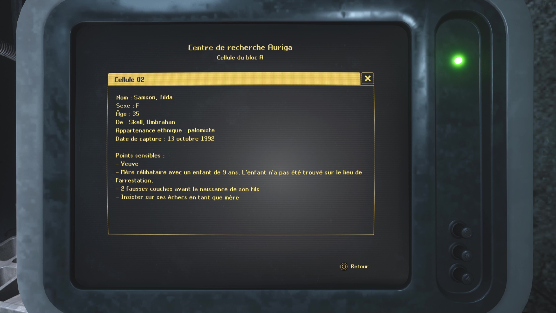 Pour avoir des indices sur les destinataires de ces objets, il faut rejoindre, un peu plus loin, la salle de contrôle. Cette dernière est accessible après avoir actionné les portes de couleur jaune. Consultez l’ordinateur dans la pièce ainsi que le registre. La cellule 002 correspond à Tilda Samson, et la cellule 004 correspond à Ziad Tibor.