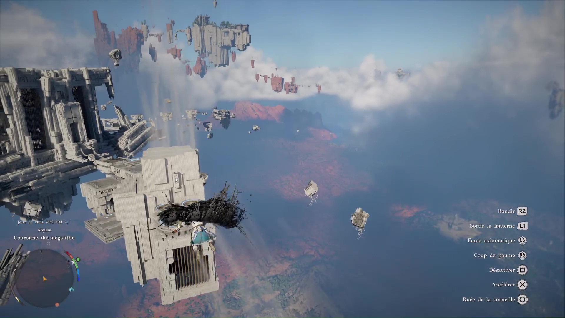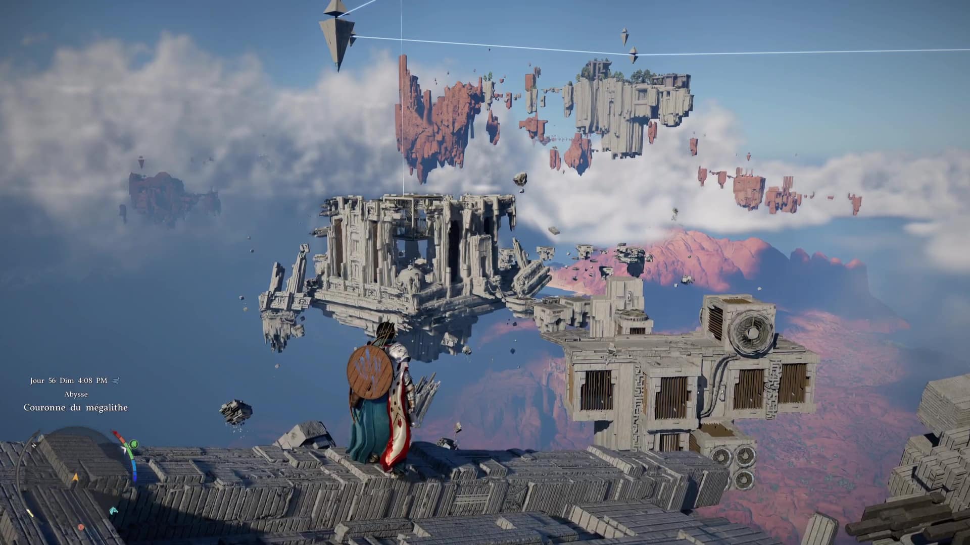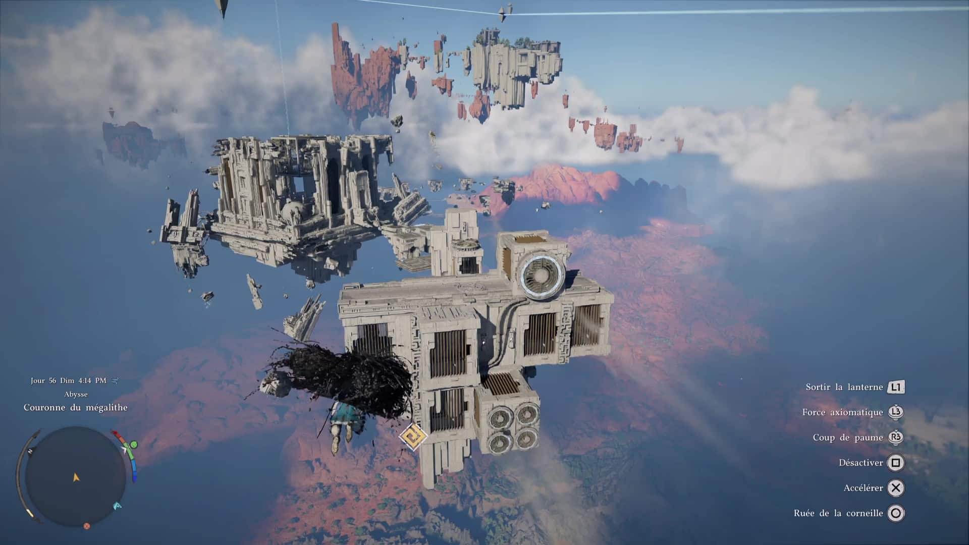Vous serez amené à un endroit assez loin de la Couronne du mégalithe, sur des plateformes penchées. Sautez et planez vers la plateforme sur laquelle vous voyez plusieurs ventilateurs souffler vers vous, mais ne volez pas devant eux et serrez sur la gauche pour atterrir sur la plateforme.