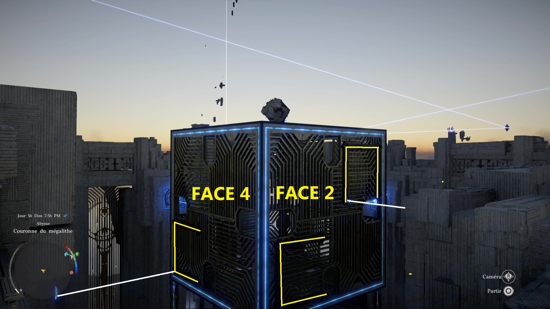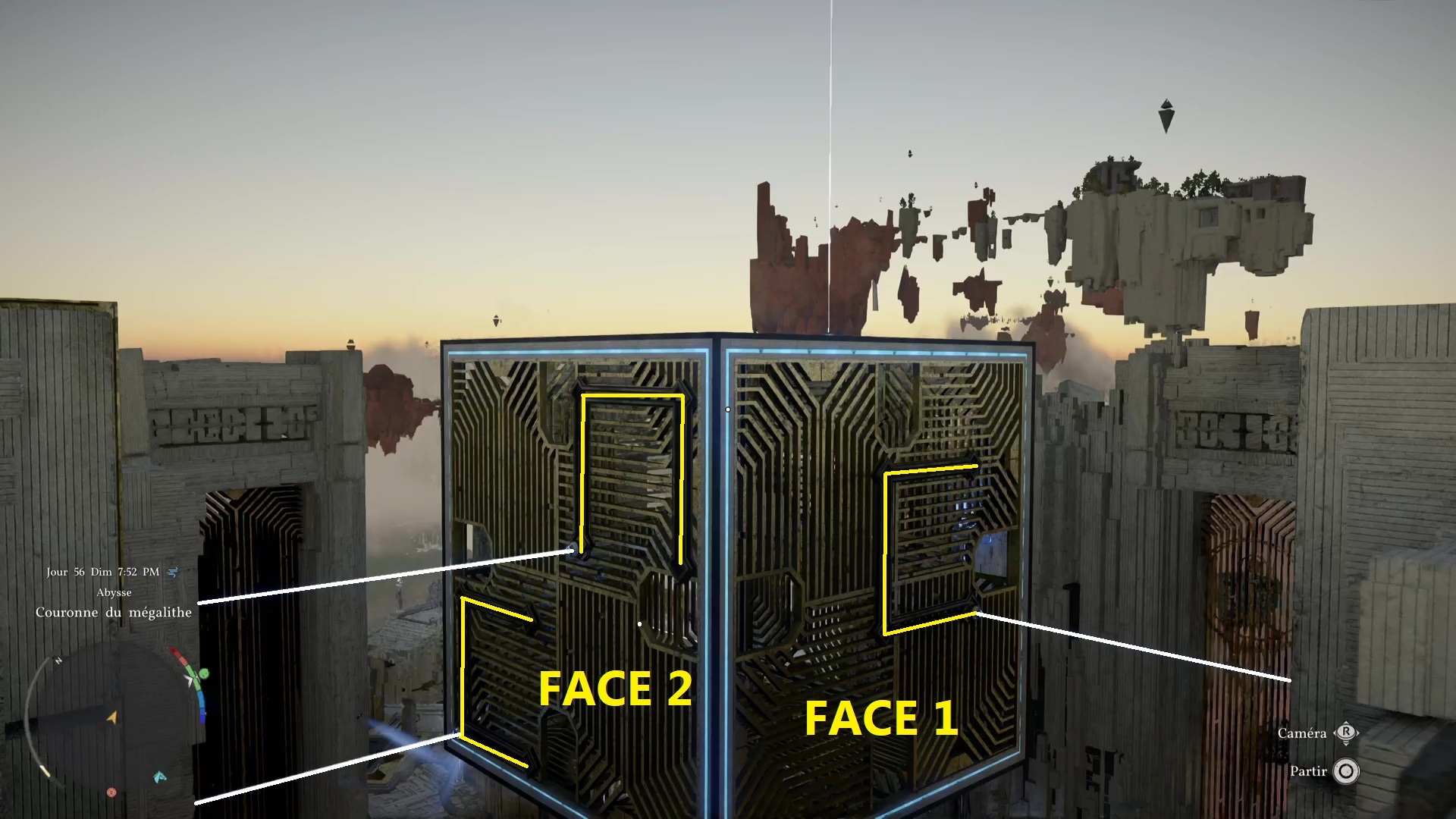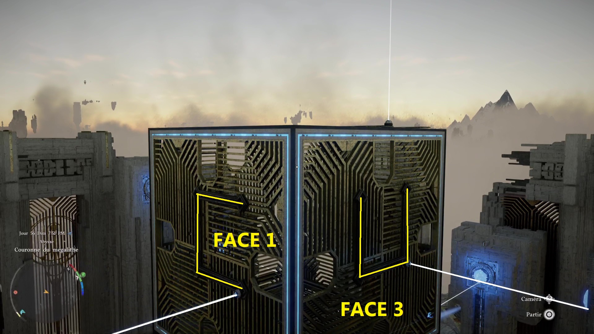 Au moment où vous contrôlez le cube, tournez la caméra pour avoir le monolithe de fin au fond de l’écran. Nommons « Face 1 » la face en bas de l’écran, « Face 2 » la face de gauche, « Face 3 » la face de droite, « Face 4 » la face du fond et Face 5 celle du dessus.