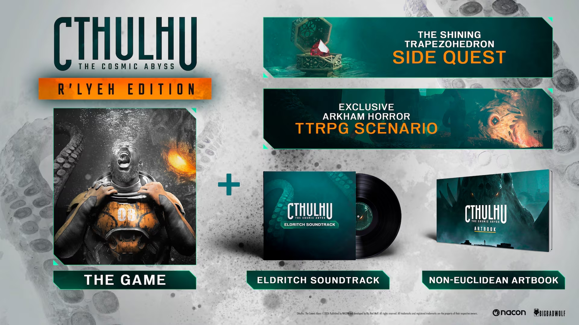 Cthulhu: The Cosmic Abyss proposera une édition standard, incluant le jeu de base et les bonus de précommande (si applicable), et une Edition R’lyeh, proposant, en plus du jeu et des bonus de précommande, une quête annexe « Le trapézoèdre étincelant », un scénario complet et exclusif intitulé « Descente », conçu pour le célèbre jeu de rôle sur table Horreur à Arkham ainsi qu’un Artbook numérique.