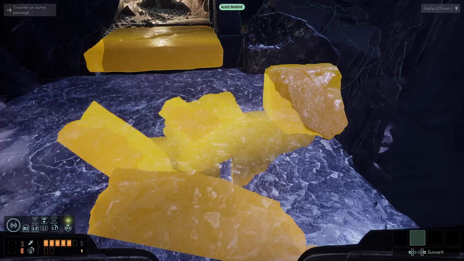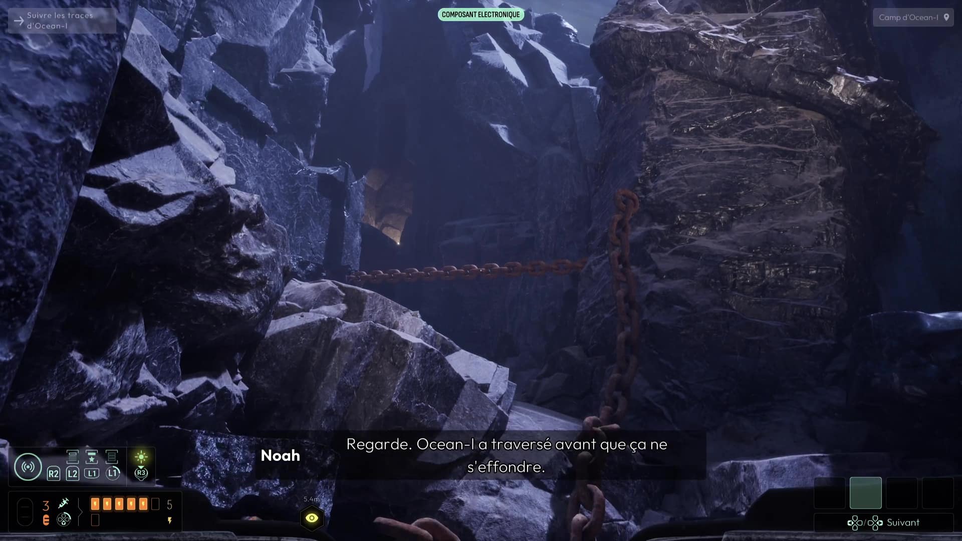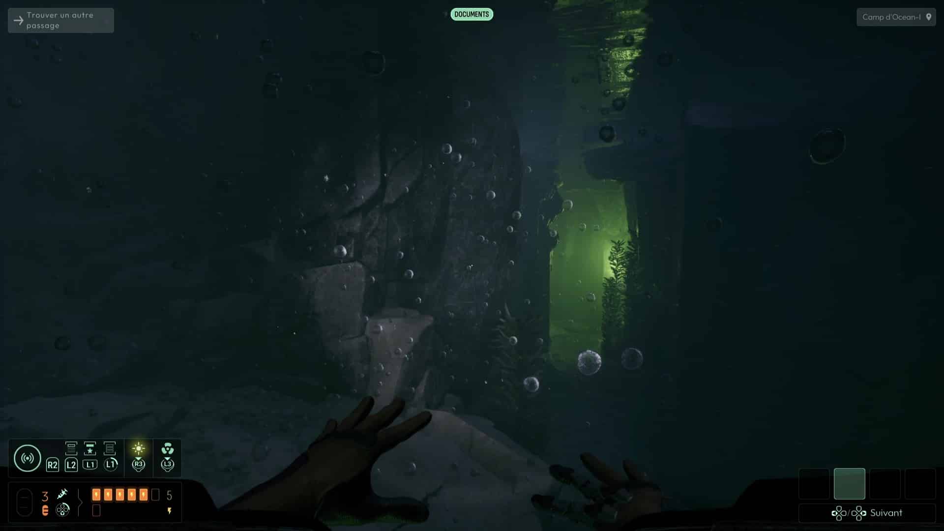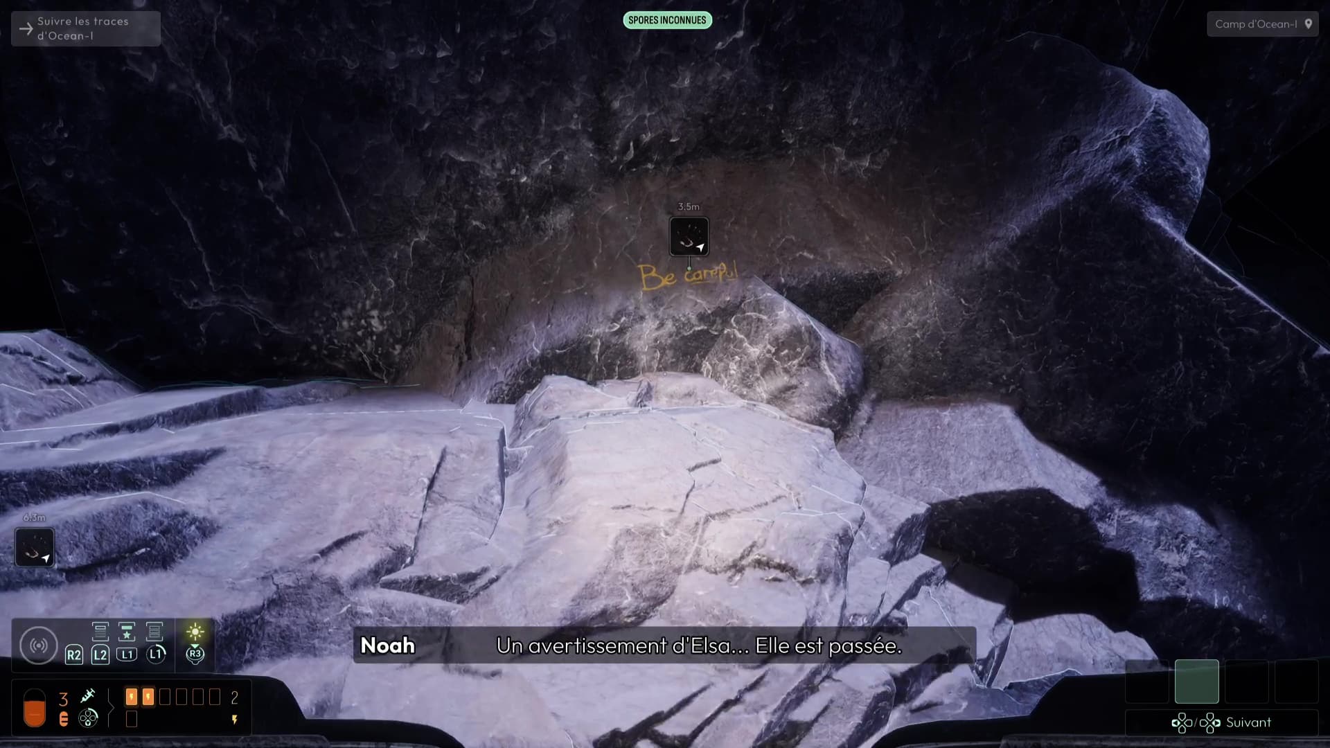 Une fois dans le tunnel, suivez le chemin grâce aux fréquences précédemment débloquées jusqu’à déboucher sur une zone dans laquelle Elsa vous avertit à travers des traces que certaines zones sont fragiles, identifiées grâce à votre sonar et la fréquence dédiée aux spores inconnues. Suivez le chemin pour déboucher sur un camp de base d’Ocean-I, théâtre d’un affrontement inévitable il y a peu. Fouillez la zone grâce à vos fréquences (notamment « Documents » et « Composants électroniques »), puis allez voir l’ordinateur du camp pour visionner une cinématique mettant en scène Andrew Marsh et ses mauvaises intentions.