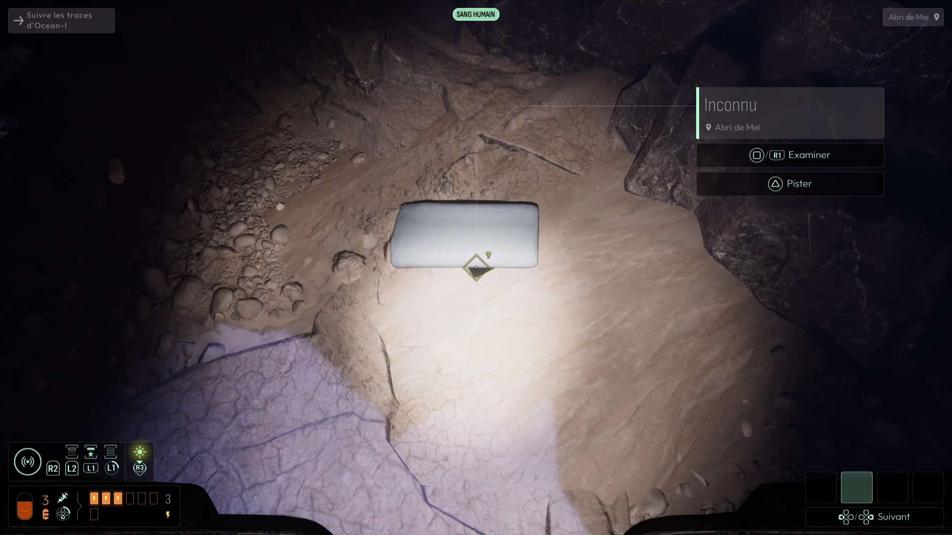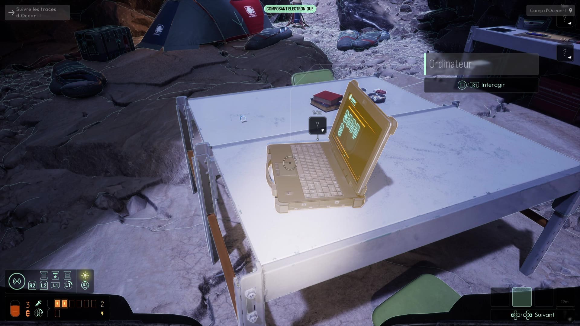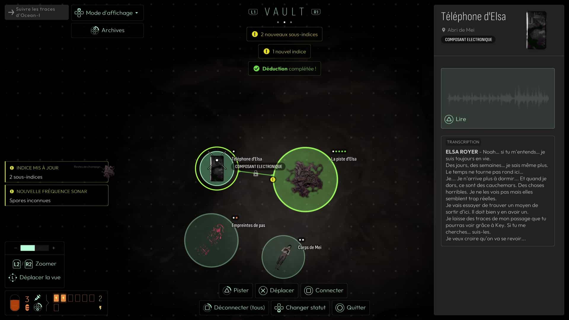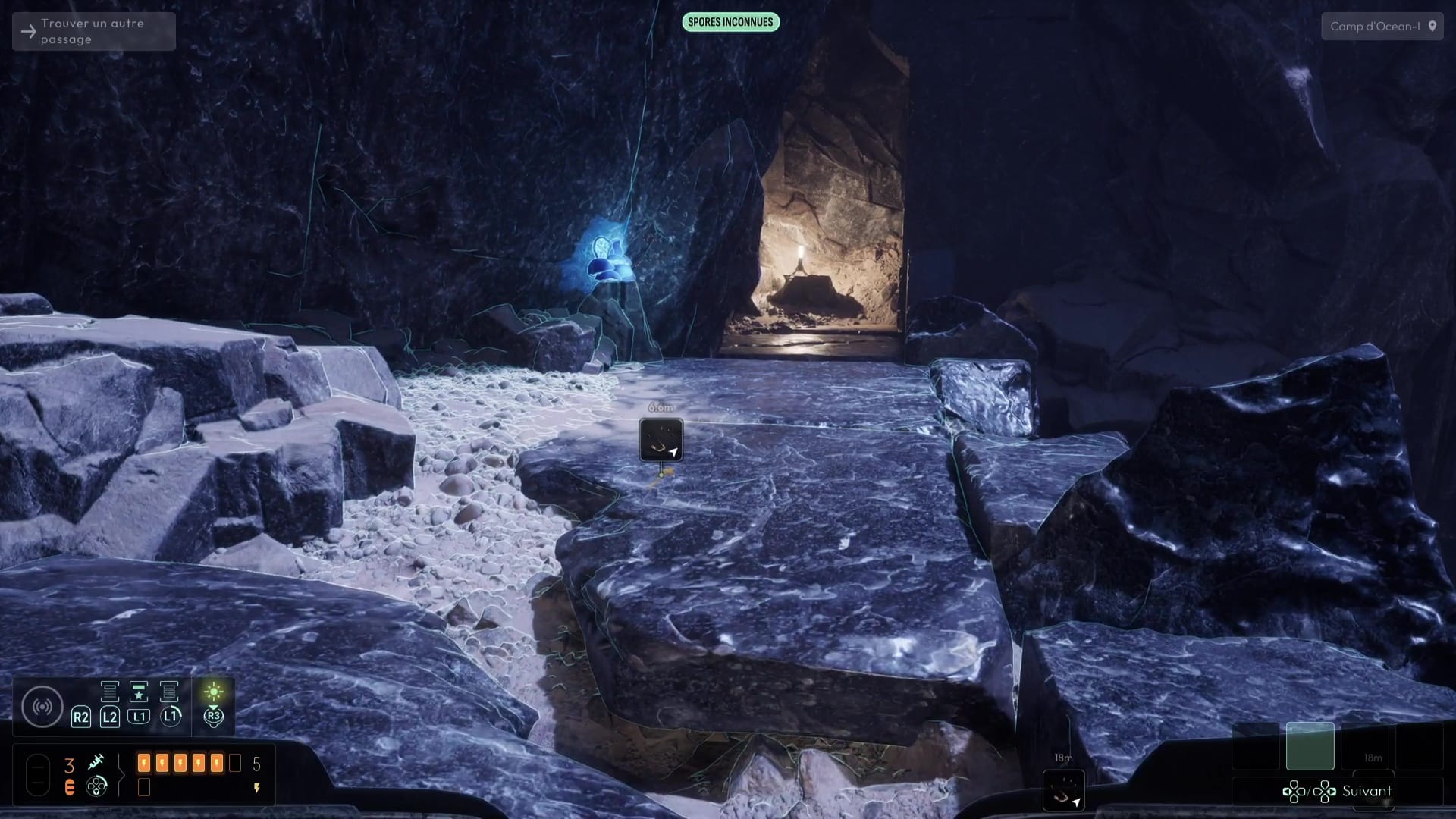 Une fois dans le tunnel, suivez le chemin grâce aux fréquences précédemment débloquées jusqu’à déboucher sur une zone dans laquelle Elsa vous avertit à travers des traces que certaines zones sont fragiles, identifiées grâce à votre sonar et la fréquence dédiée aux spores inconnues. Suivez le chemin pour déboucher sur un camp de base d’Ocean-I, théâtre d’un affrontement inévitable il y a peu. Fouillez la zone grâce à vos fréquences (notamment « Documents » et « Composants électroniques »), puis allez voir l’ordinateur du camp pour visionner une cinématique mettant en scène Andrew Marsh et ses mauvaises intentions.