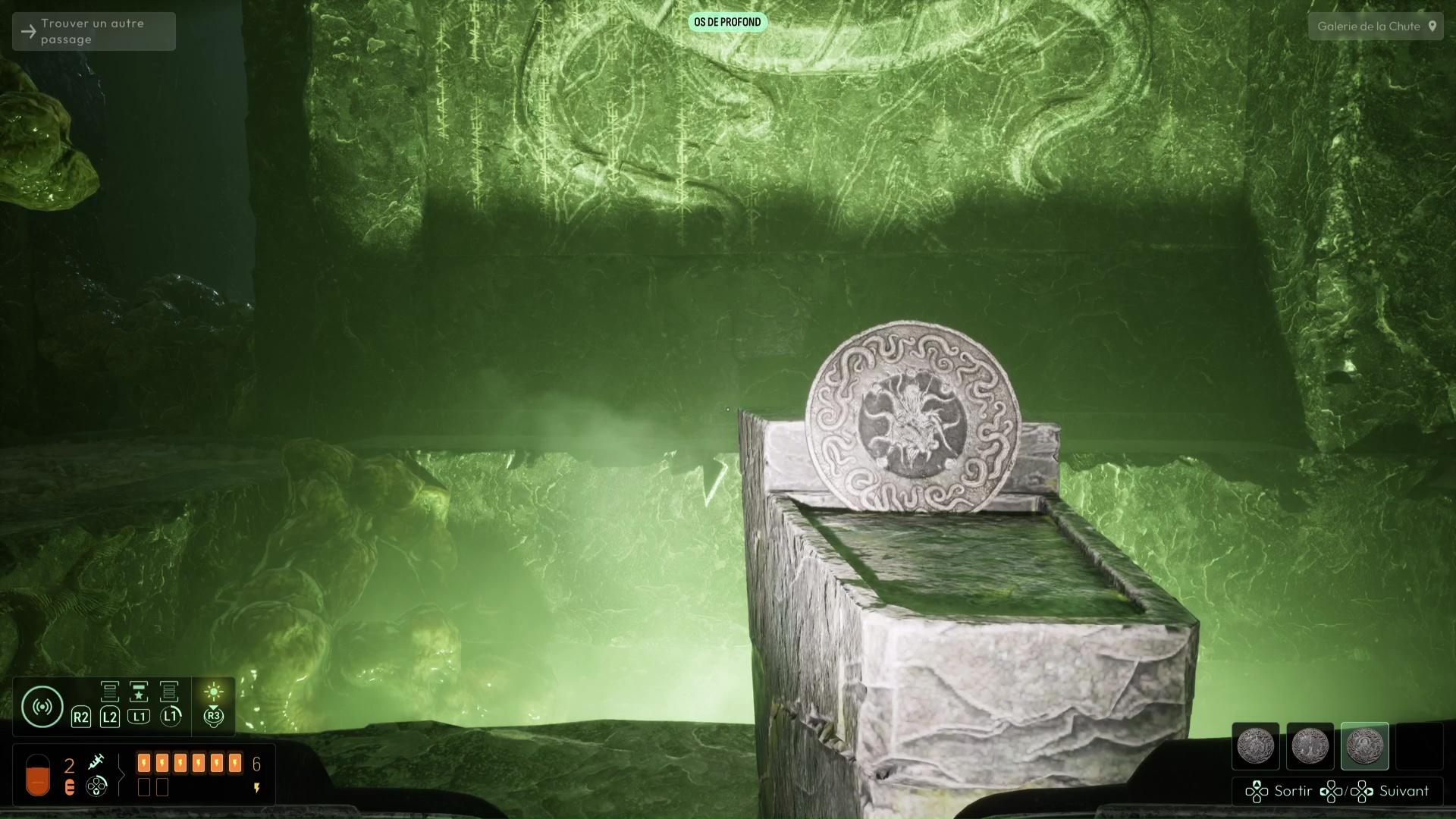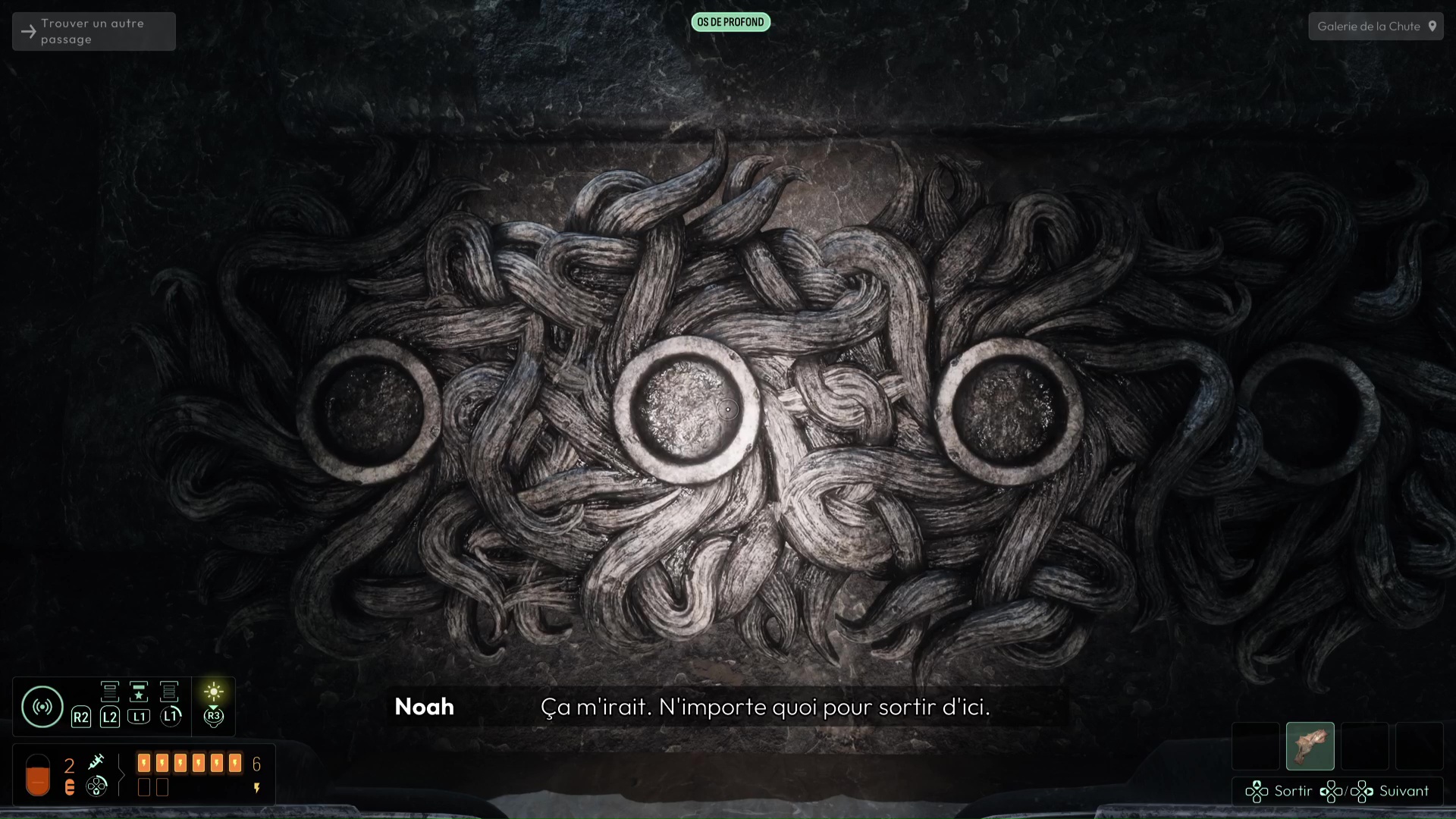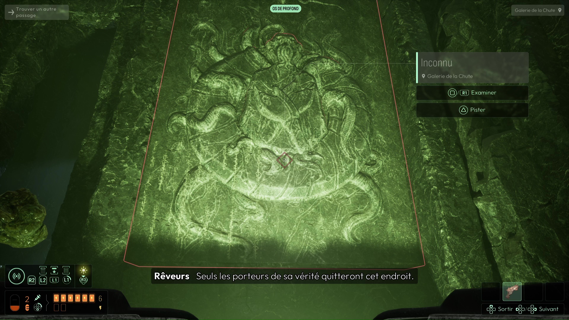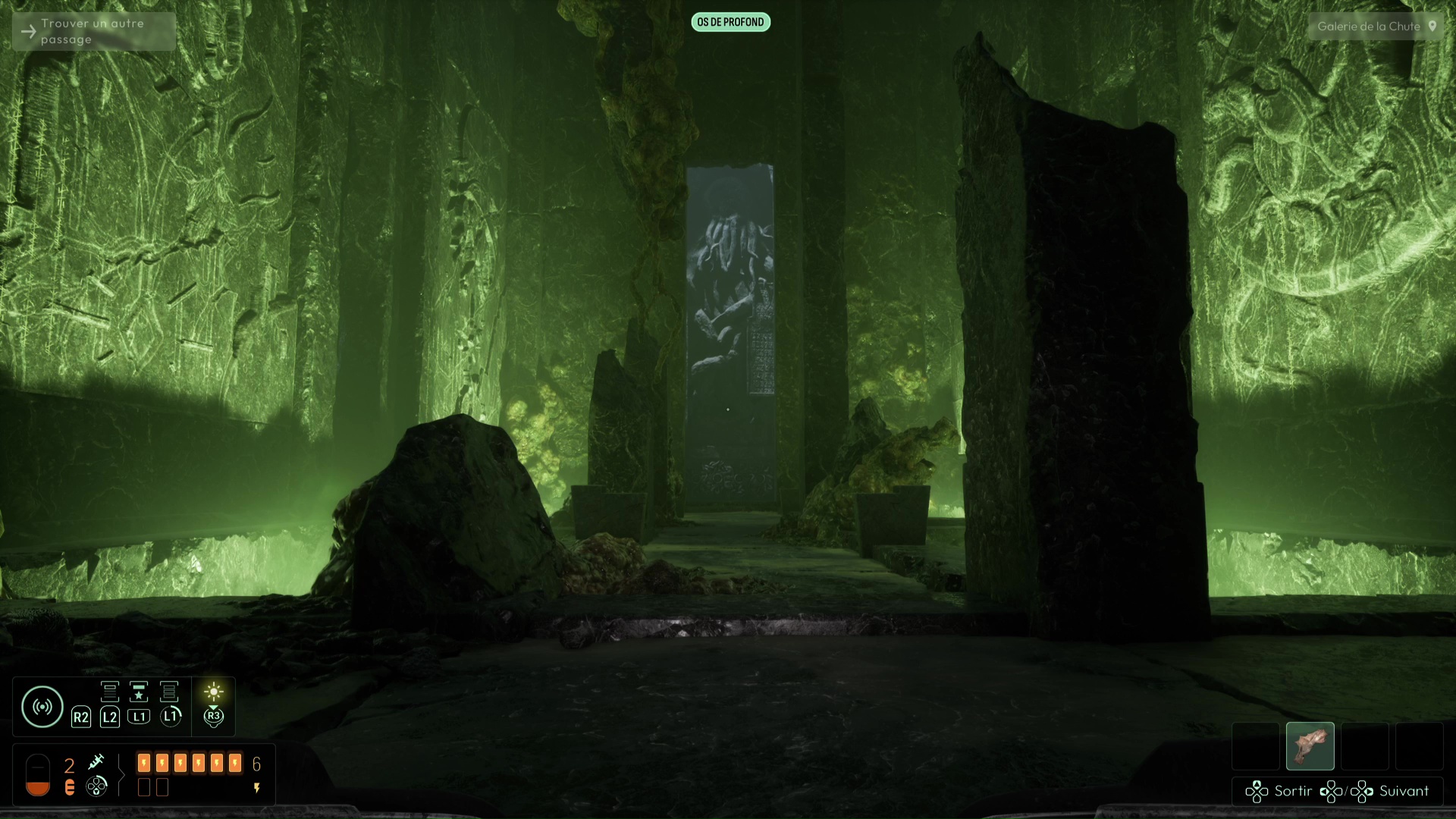 Vous devrez avoir débloqué une nouvelle fréquence « Spores inconnues » pour suivre de nouvelles traces sur les murs de l’Ossuaire (et ce sera très utile pour plus tard), mais autrement, suivez les traces de pas ensanglantées jusqu’à rejoindre la Salle de l’Abîme un peu plus loin. Ici, notez le grand trou au centre, mais également la pièce à votre gauche. Essayez de trouver le palet posé sur la droite de la pièce pour aller le placer dans la porte, vous aurez une belle surprise. Sinon, si vous n’avez plus rien à analyser, jetez-vous dans la fosse pour découvrir une nouvelle faculté de cet endroit. Attention, aucun retour en arrière n’est possible ici…