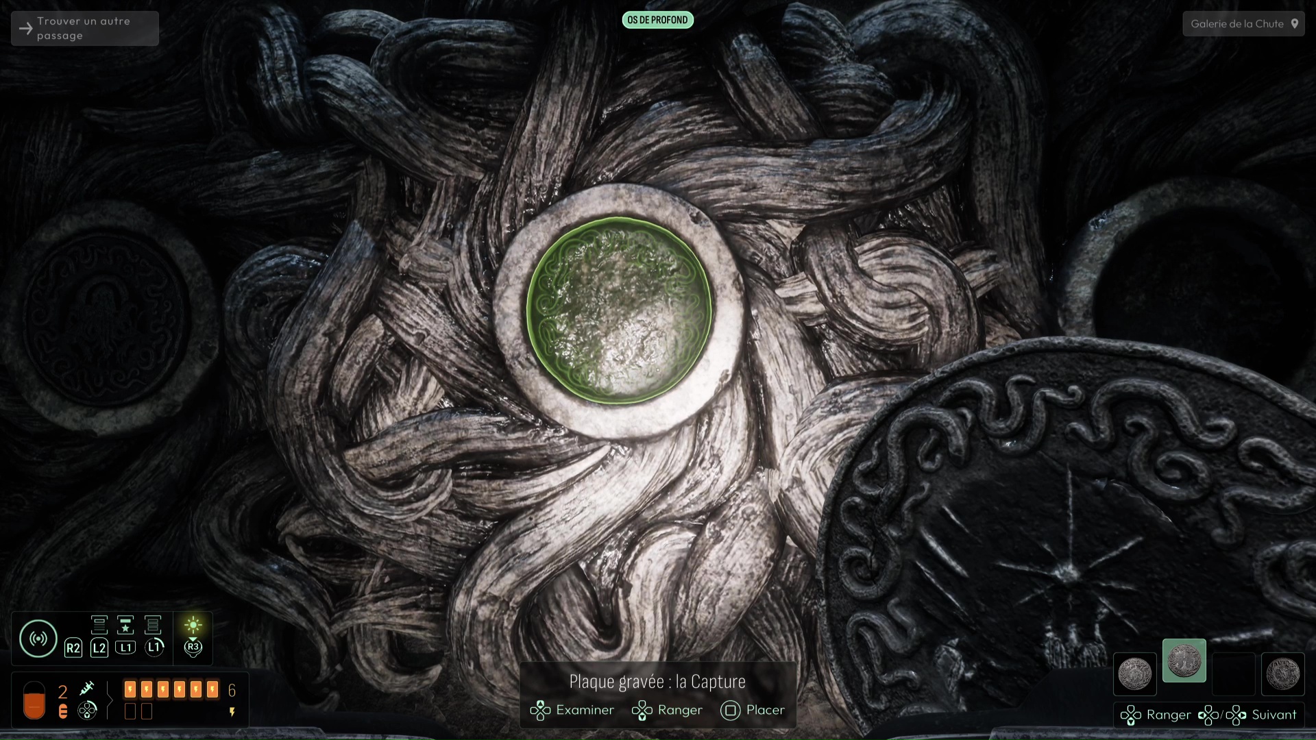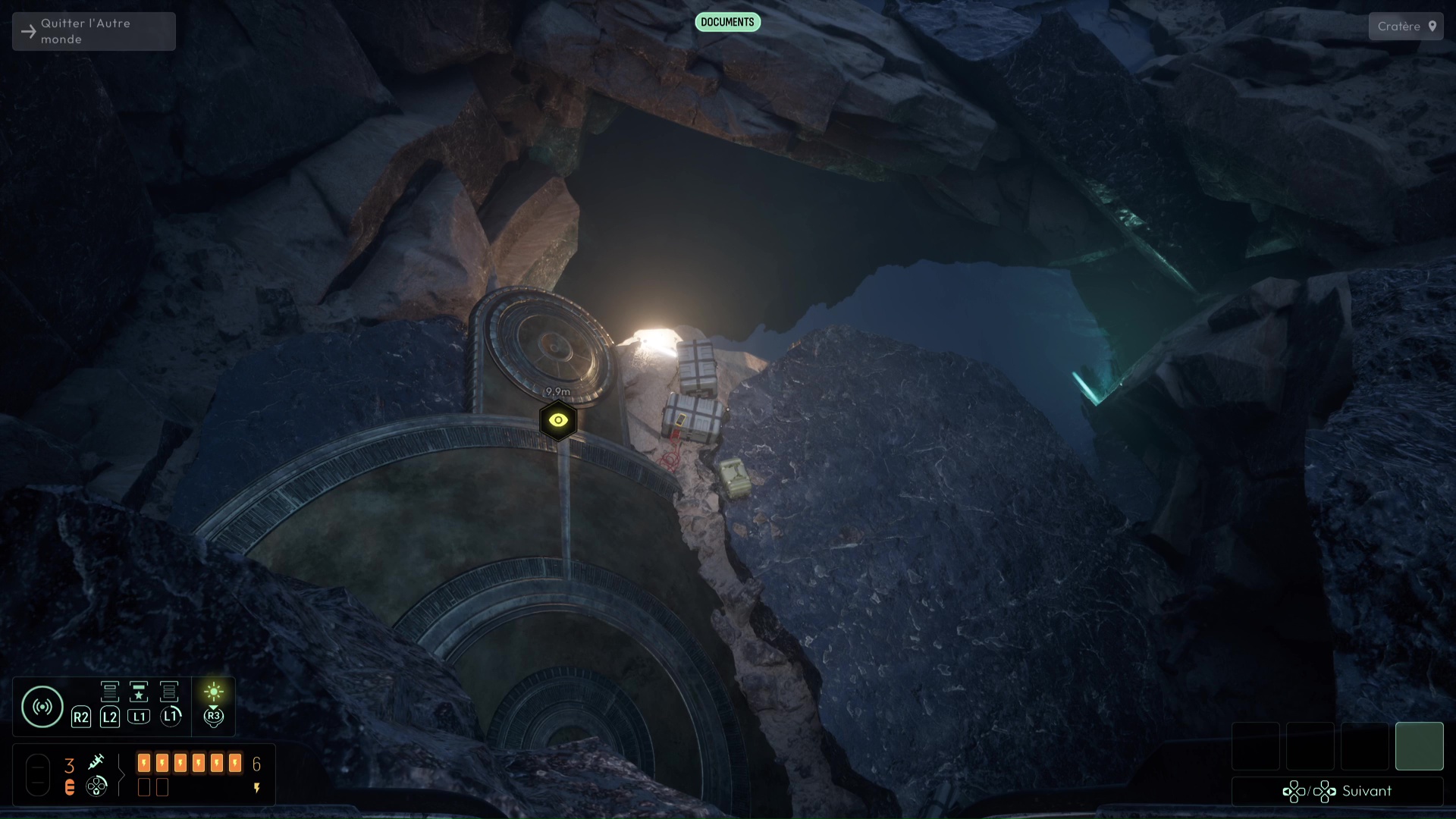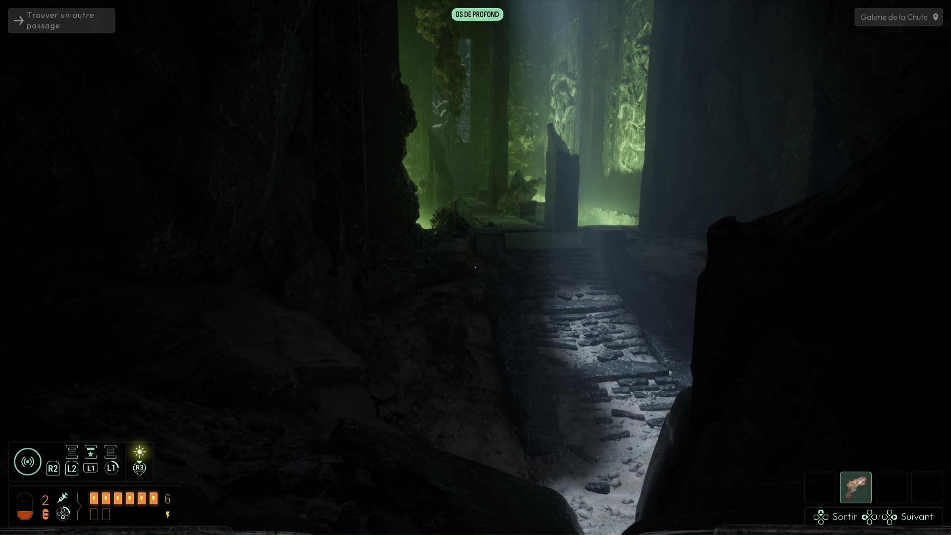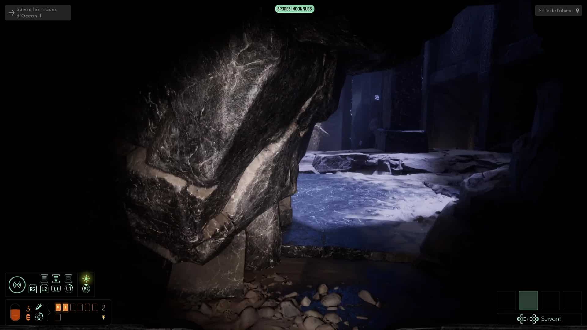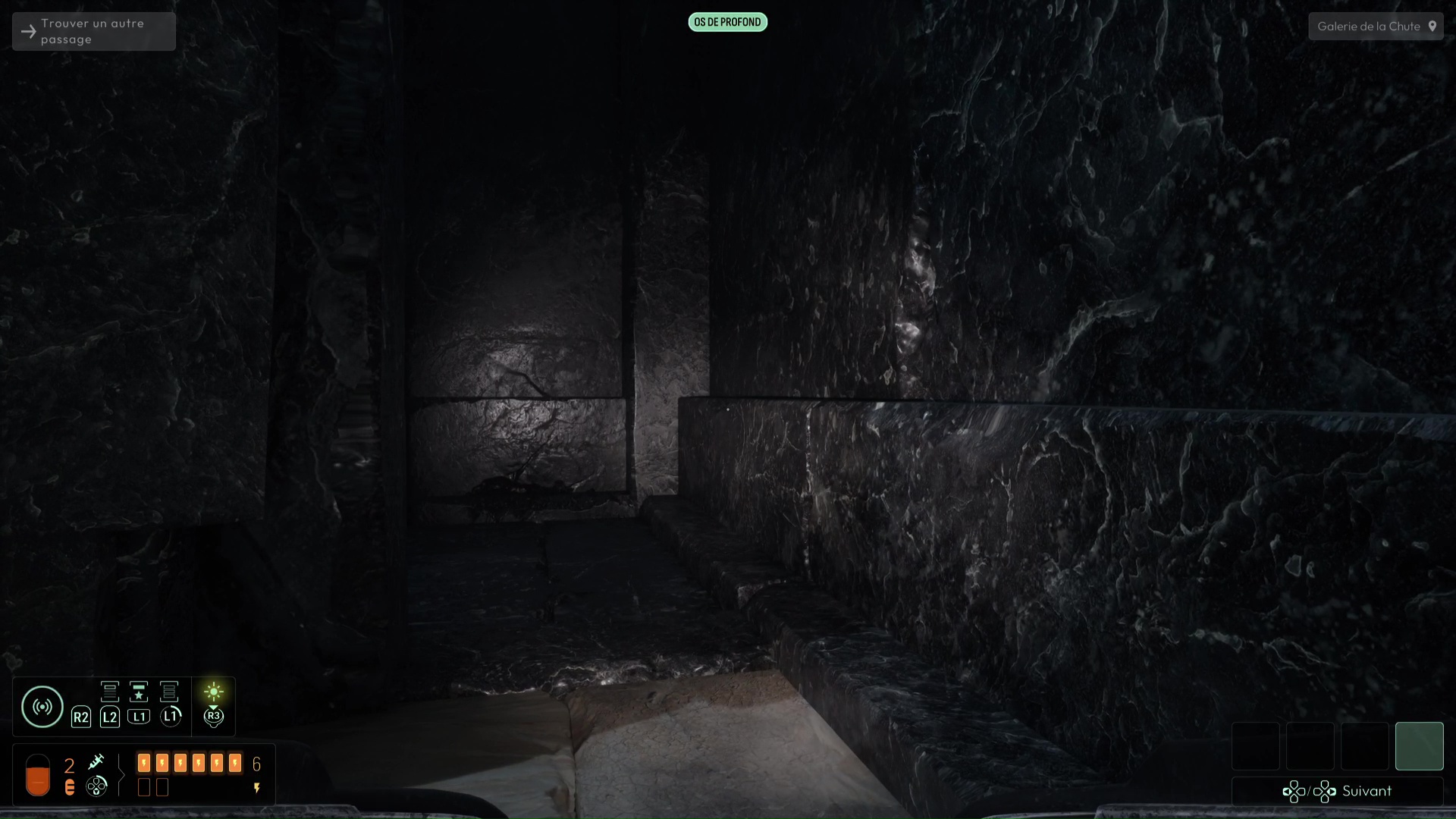 Vous devrez avoir débloqué une nouvelle fréquence « Spores inconnues » pour suivre de nouvelles traces sur les murs de l’Ossuaire (et ce sera très utile pour plus tard), mais autrement, suivez les traces de pas ensanglantées jusqu’à rejoindre la Salle de l’Abîme un peu plus loin. Ici, notez le grand trou au centre, mais également la pièce à votre gauche. Essayez de trouver le palet posé sur la droite de la pièce pour aller le placer dans la porte, vous aurez une belle surprise. Sinon, si vous n’avez plus rien à analyser, jetez-vous dans la fosse pour découvrir une nouvelle faculté de cet endroit. Attention, aucun retour en arrière n’est possible ici…
