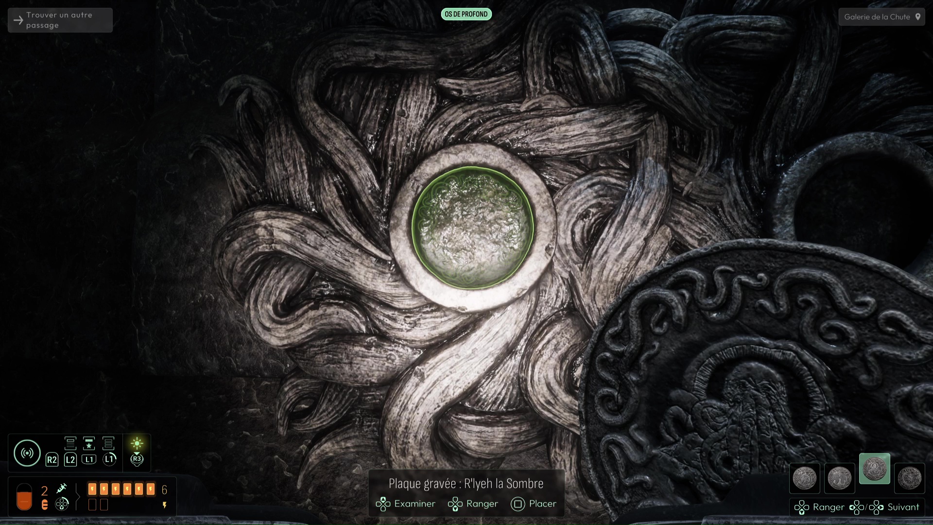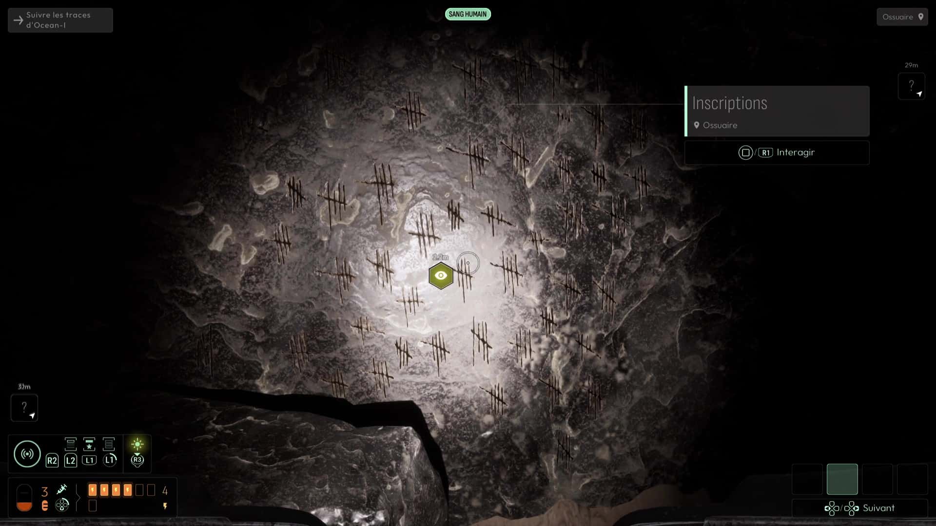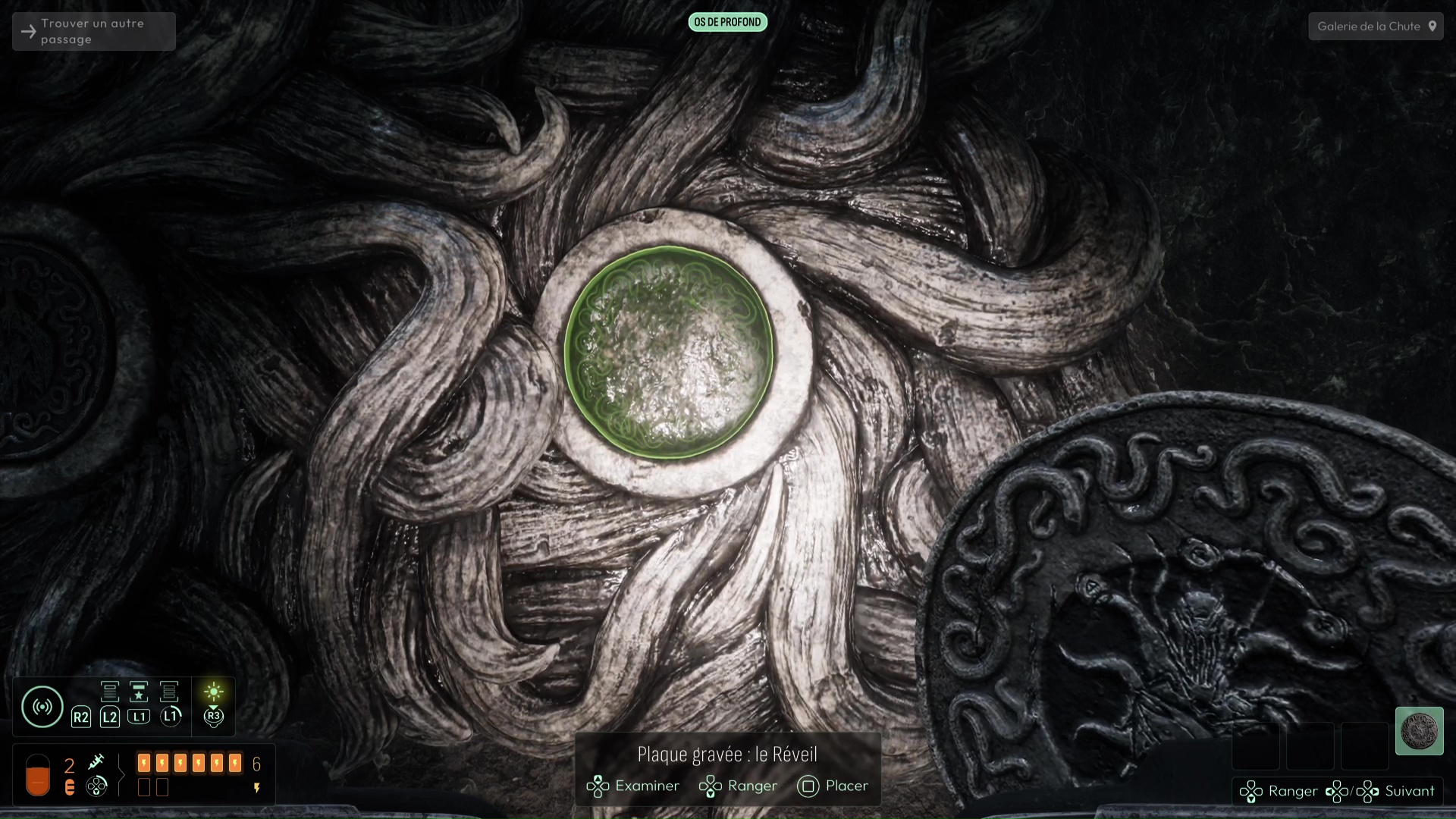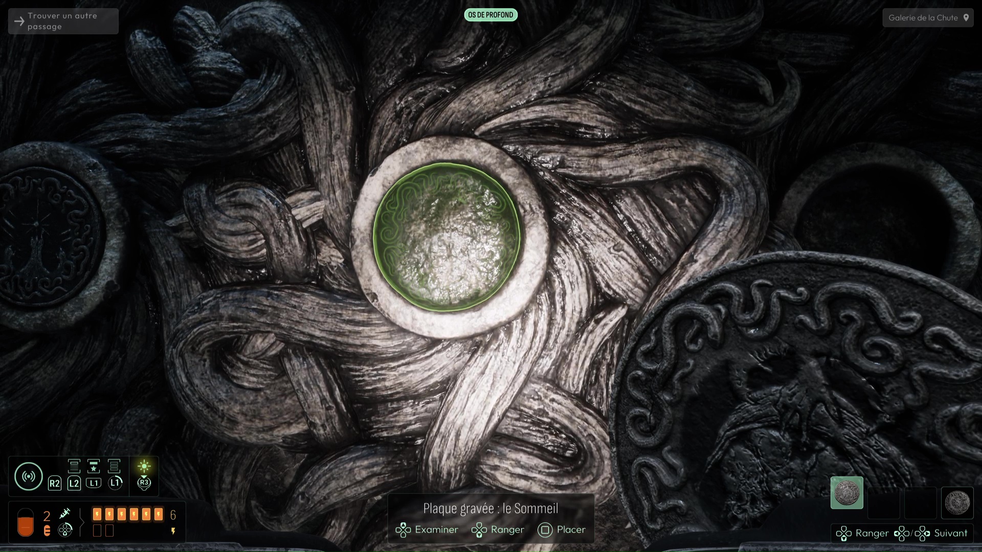 Vous devrez avoir débloqué une nouvelle fréquence « Spores inconnues » pour suivre de nouvelles traces sur les murs de l’Ossuaire (et ce sera très utile pour plus tard), mais autrement, suivez les traces de pas ensanglantées jusqu’à rejoindre la Salle de l’Abîme un peu plus loin. Ici, notez le grand trou au centre, mais également la pièce à votre gauche. Essayez de trouver le palet posé sur la droite de la pièce pour aller le placer dans la porte, vous aurez une belle surprise. Sinon, si vous n’avez plus rien à analyser, jetez-vous dans la fosse pour découvrir une nouvelle faculté de cet endroit. Attention, aucun retour en arrière n’est possible ici…