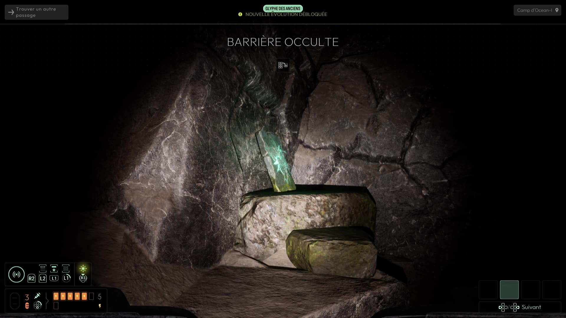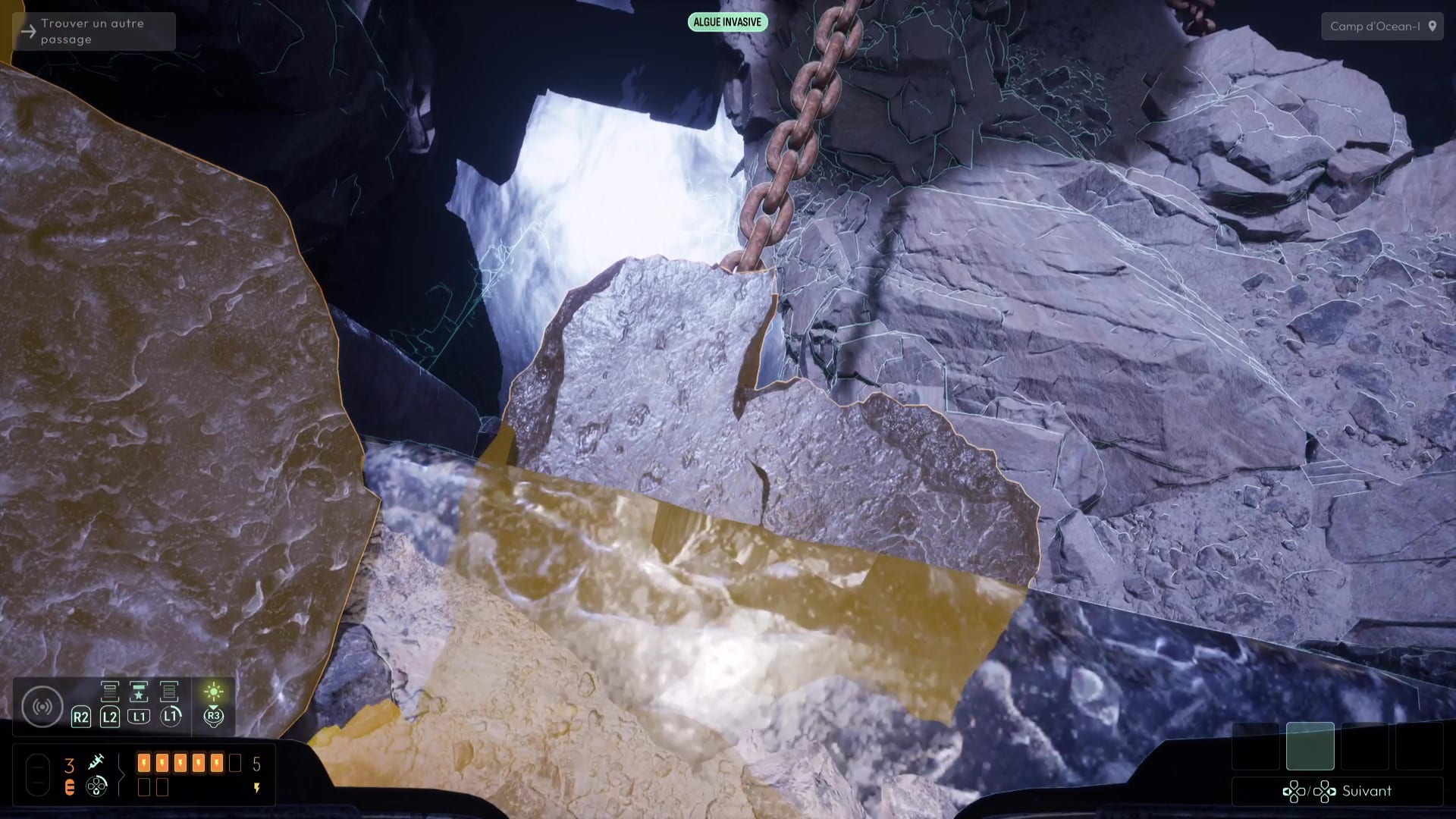 La route préalablement empruntée par Océan-I étant très fragile, il vous faudra sauter dans l’eau tout près pour avancer. Le courant puissant vous entraînera au large et vous fera remonter à la surface dans une zone encore inexplorée. Suivez le chemin pour déboucher dans les hauteurs du camp où de nouvelles traces à inspecter vous attendent, ainsi qu’une tablette des anciens « Barrière occulte ». Faites demi-tour et suivez les traces grâce au sonar jusqu’à apercevoir un pont brisé et un lichen enrichi.