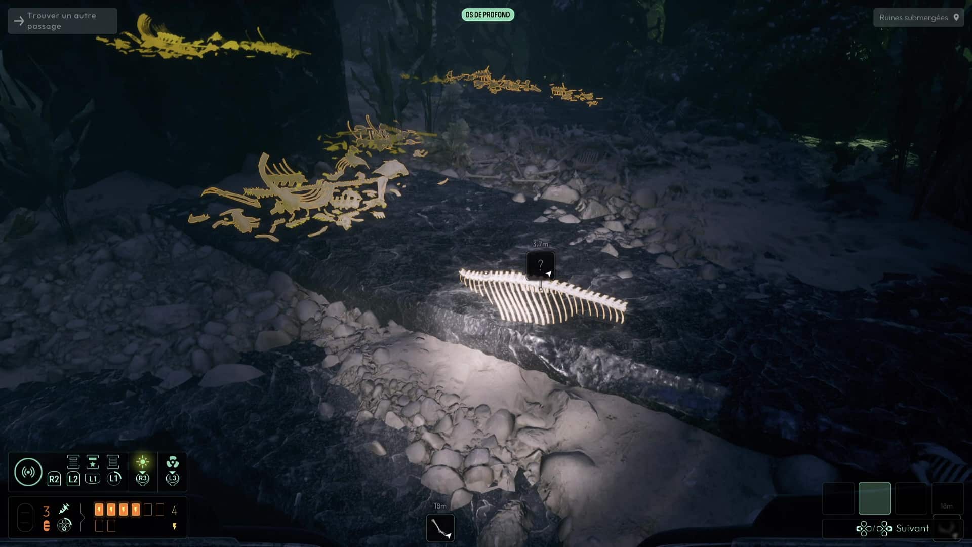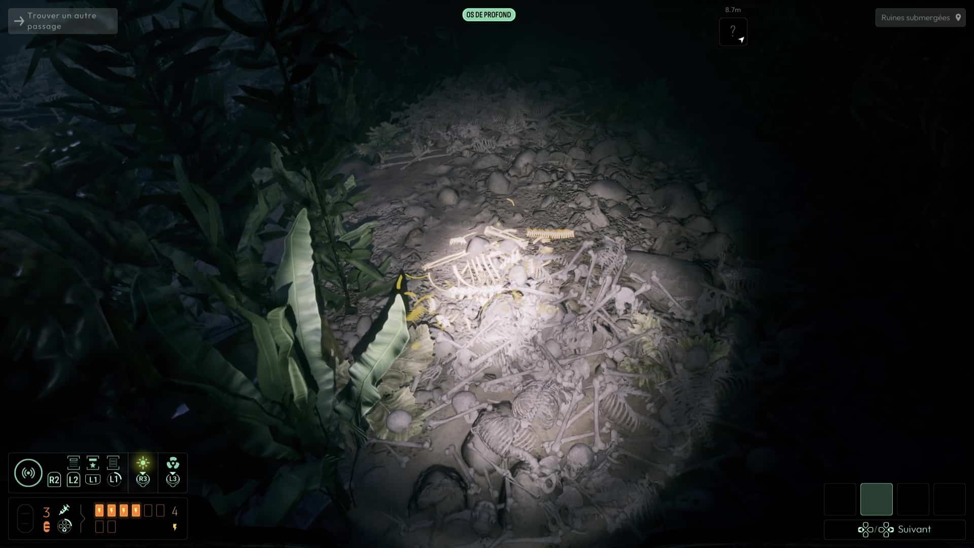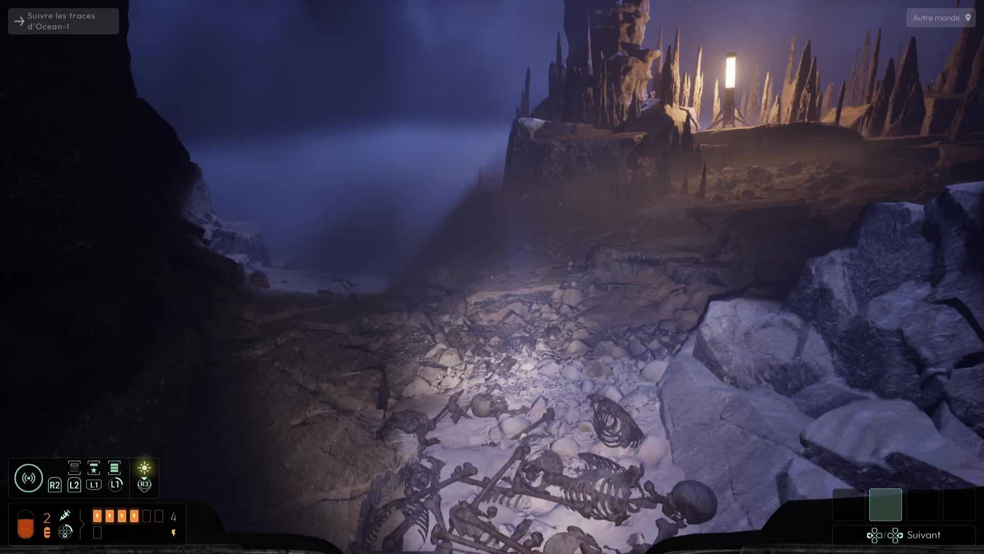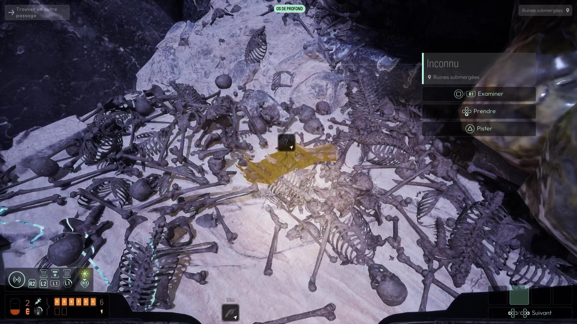 Analyser ces ossements vous permettra de débloquer une nouvelle interrogation, mais votre analyse fine de la zone vous permettra de vous rendre compte qu’il ne s’agit pas que d’ossements humains, mais que certains proviennent de Profonds, des créatures peuplant cet endroit et que vous avez peut-être déjà aperçues plus tôt dans le jeu. Autrement, remontez à la surface pour en apercevoir un spécimen dans les hauteurs des grottes avoisinantes.
