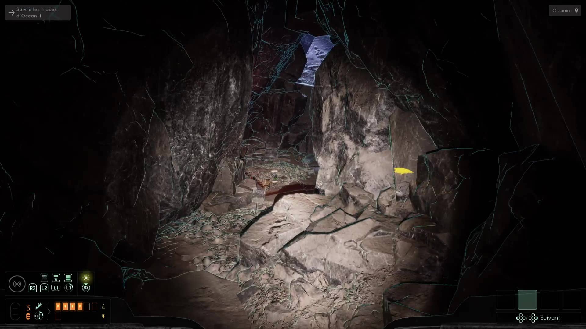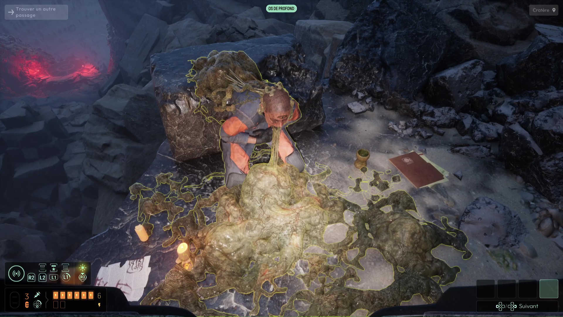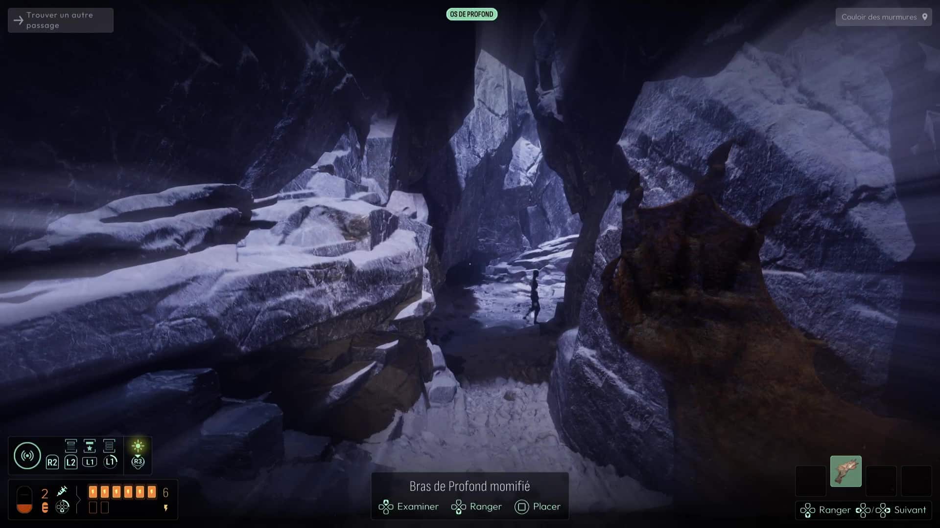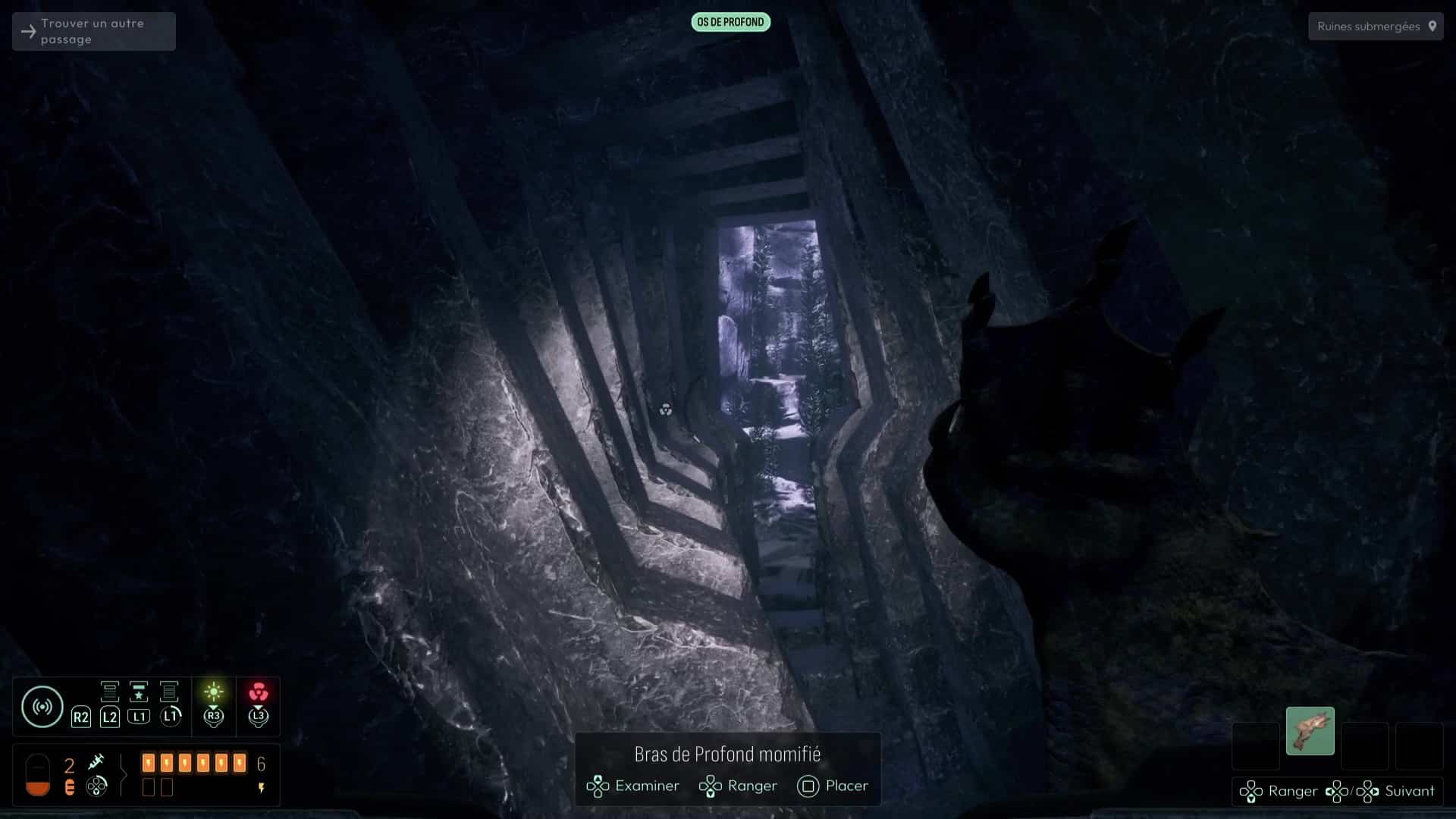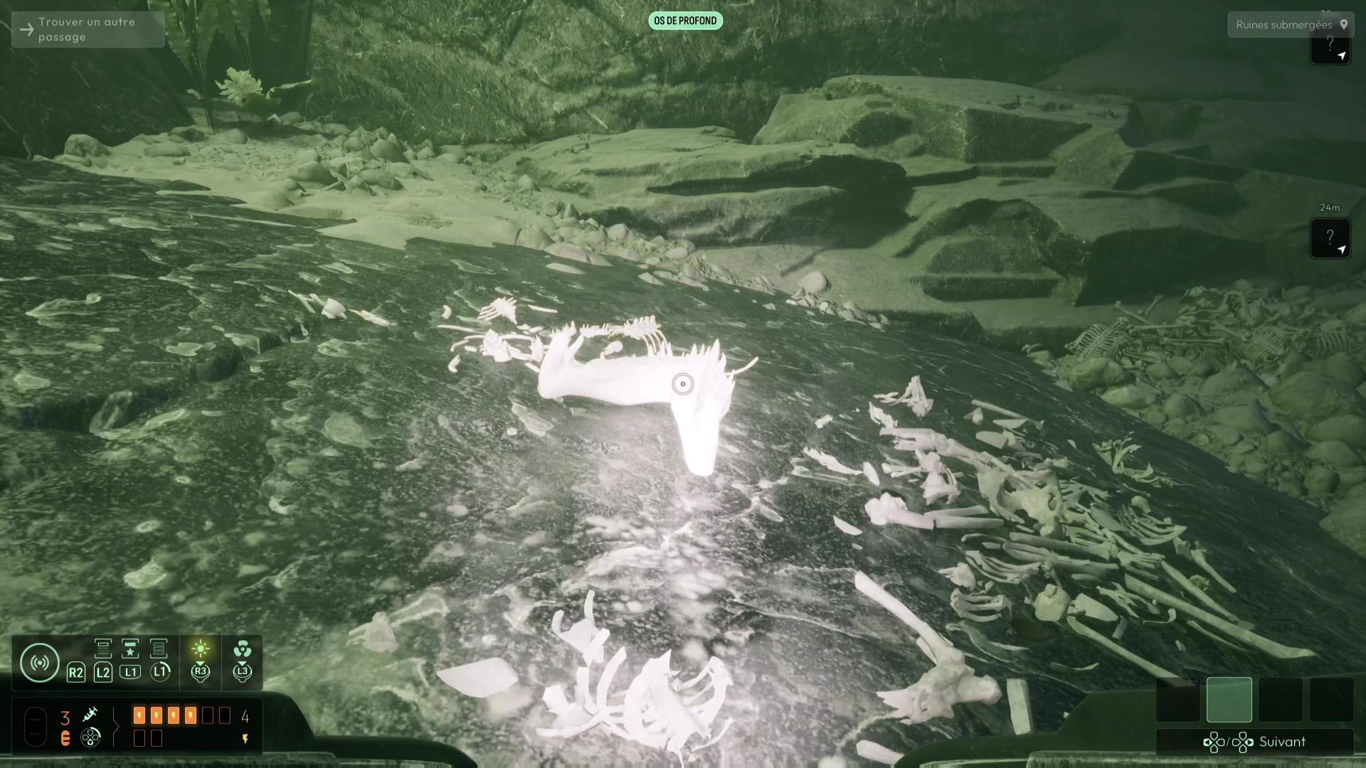 Analyser ces ossements vous permettra de débloquer une nouvelle interrogation, mais votre analyse fine de la zone vous permettra de vous rendre compte qu’il ne s’agit pas que d’ossements humains, mais que certains proviennent de Profonds, des créatures peuplant cet endroit et que vous avez peut-être déjà aperçues plus tôt dans le jeu. Autrement, remontez à la surface pour en apercevoir un spécimen dans les hauteurs des grottes avoisinantes.