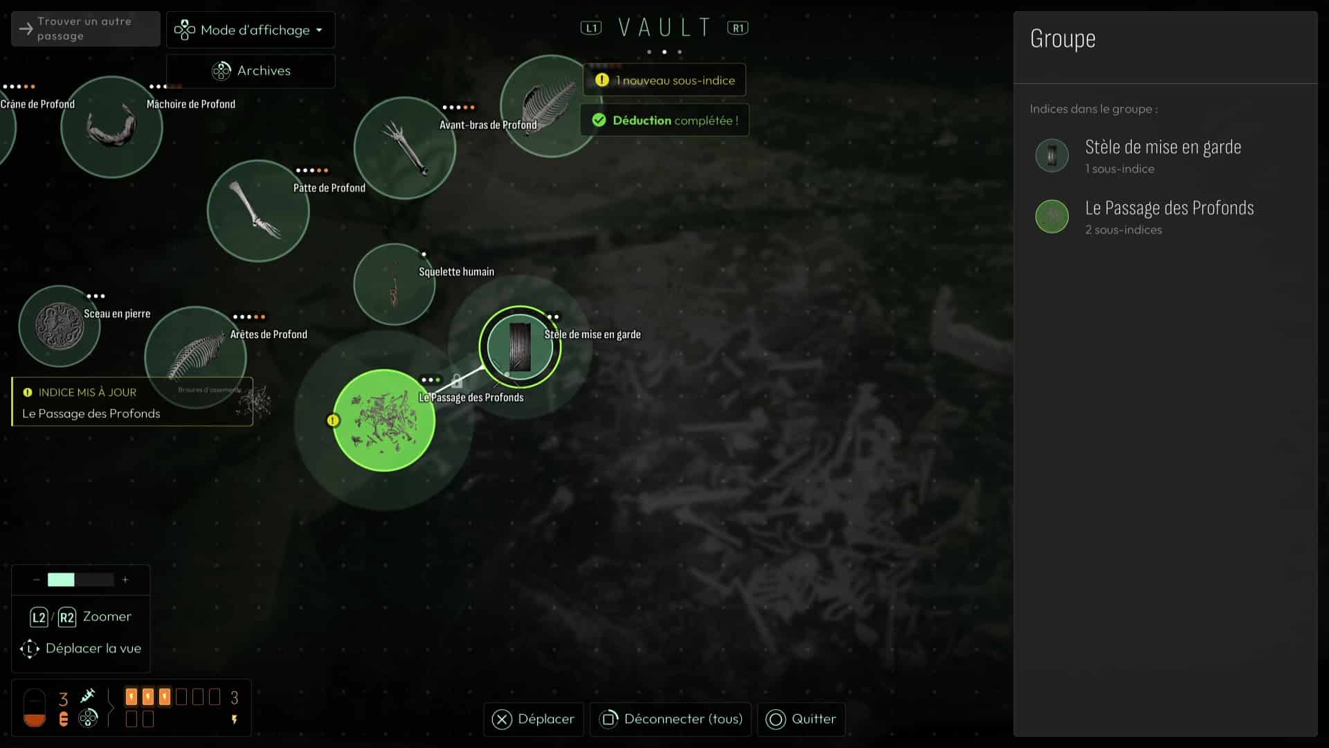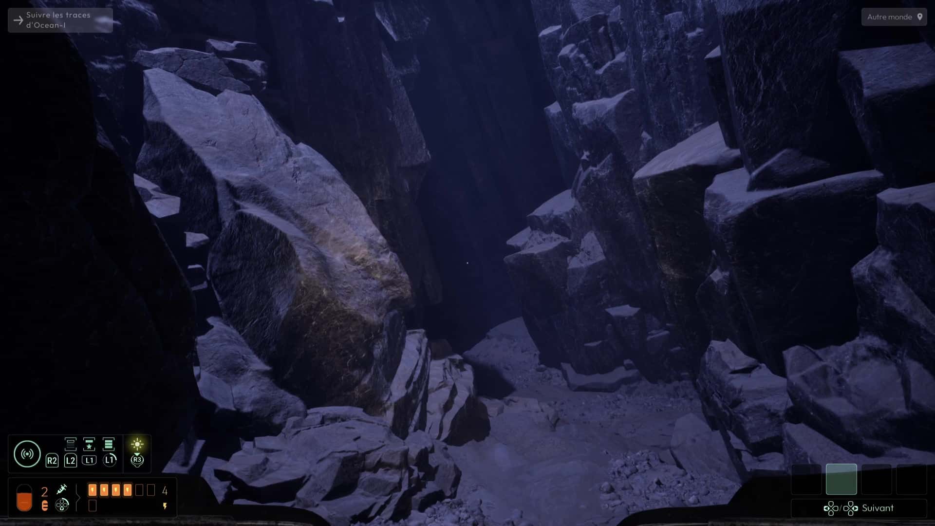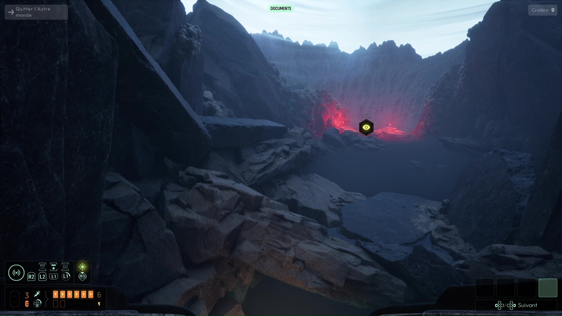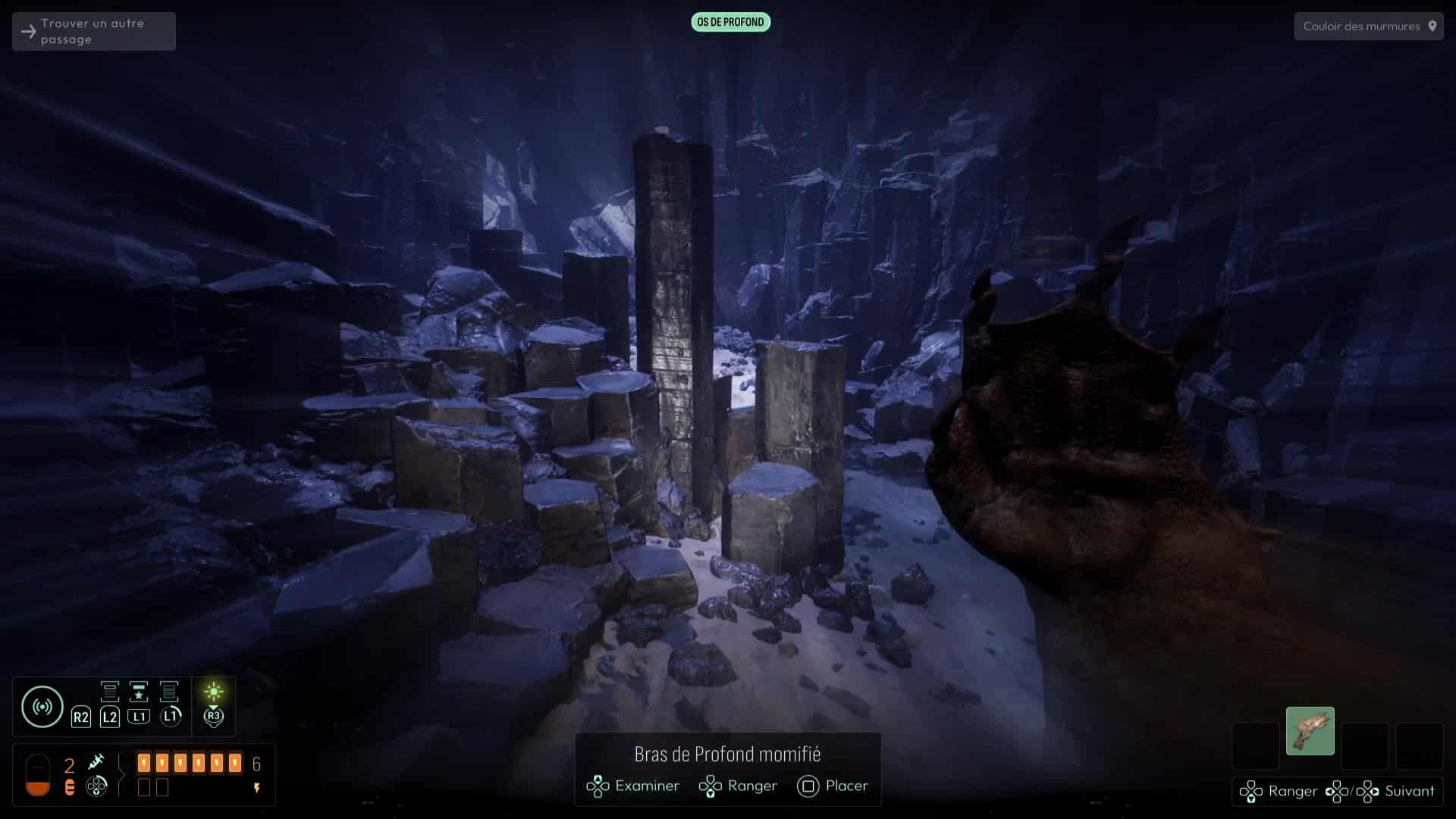 Analyser ces ossements vous permettra de débloquer une nouvelle interrogation, mais votre analyse fine de la zone vous permettra de vous rendre compte qu’il ne s’agit pas que d’ossements humains, mais que certains proviennent de Profonds, des créatures peuplant cet endroit et que vous avez peut-être déjà aperçues plus tôt dans le jeu. Autrement, remontez à la surface pour en apercevoir un spécimen dans les hauteurs des grottes avoisinantes.