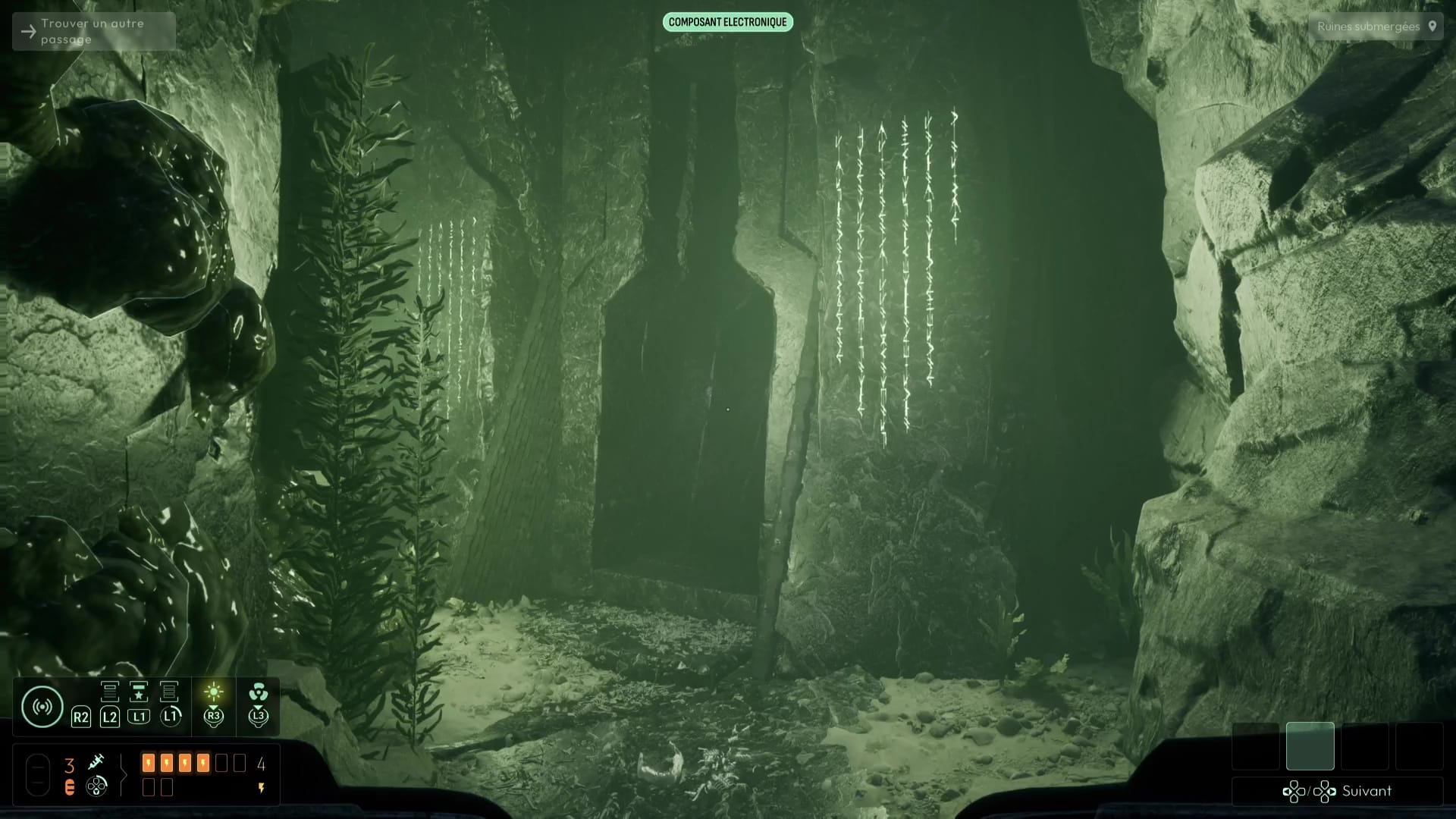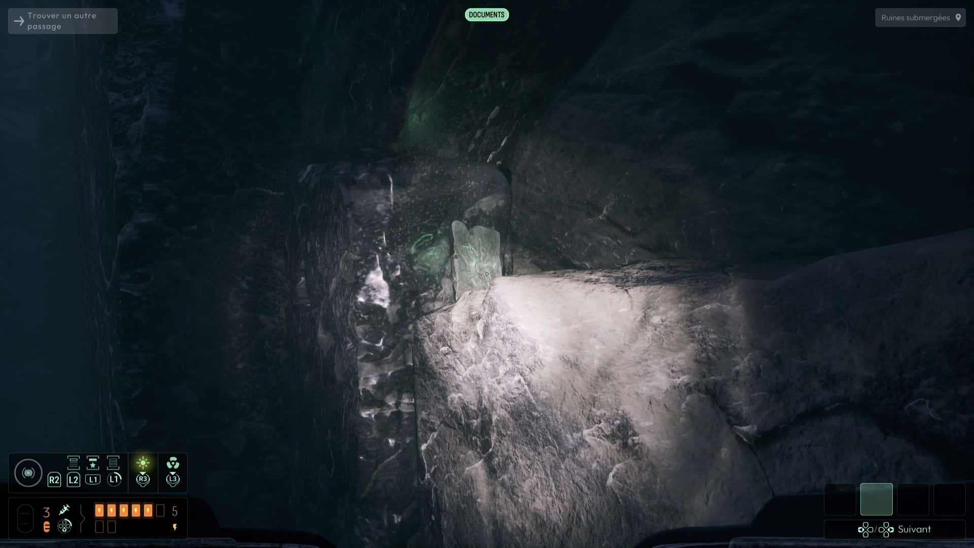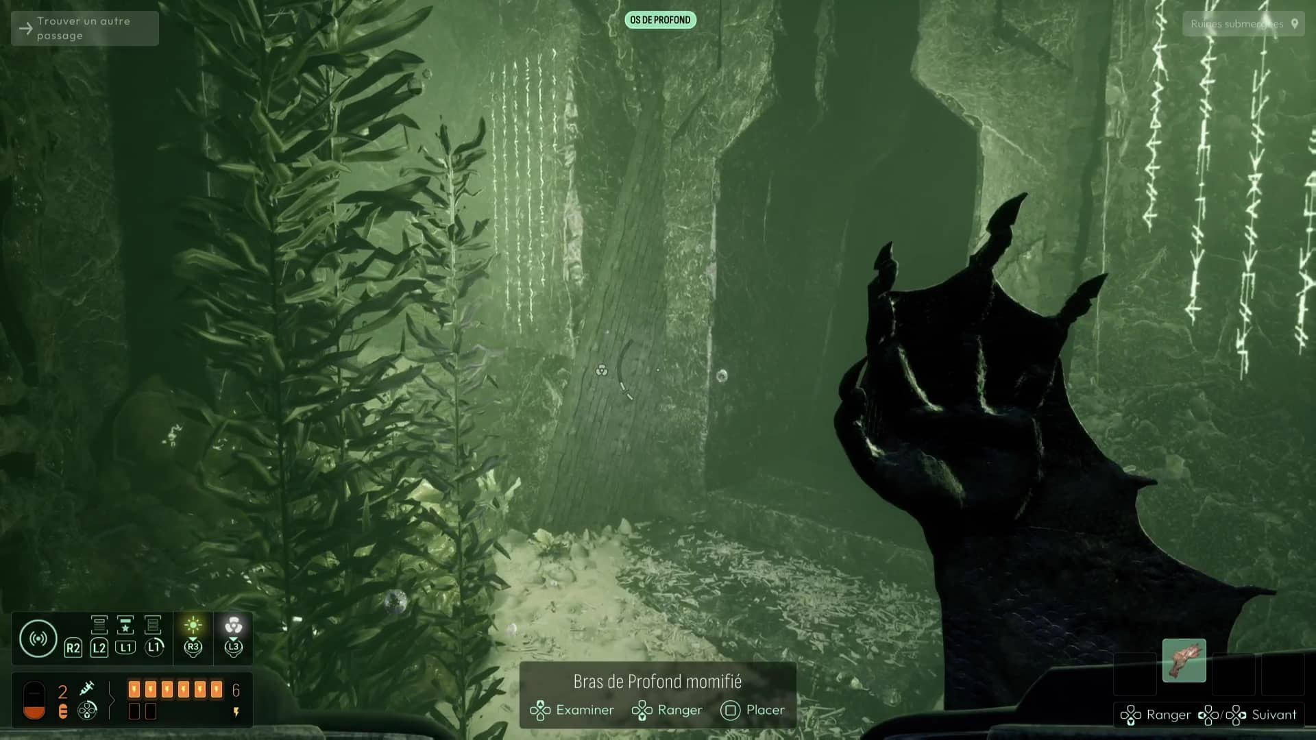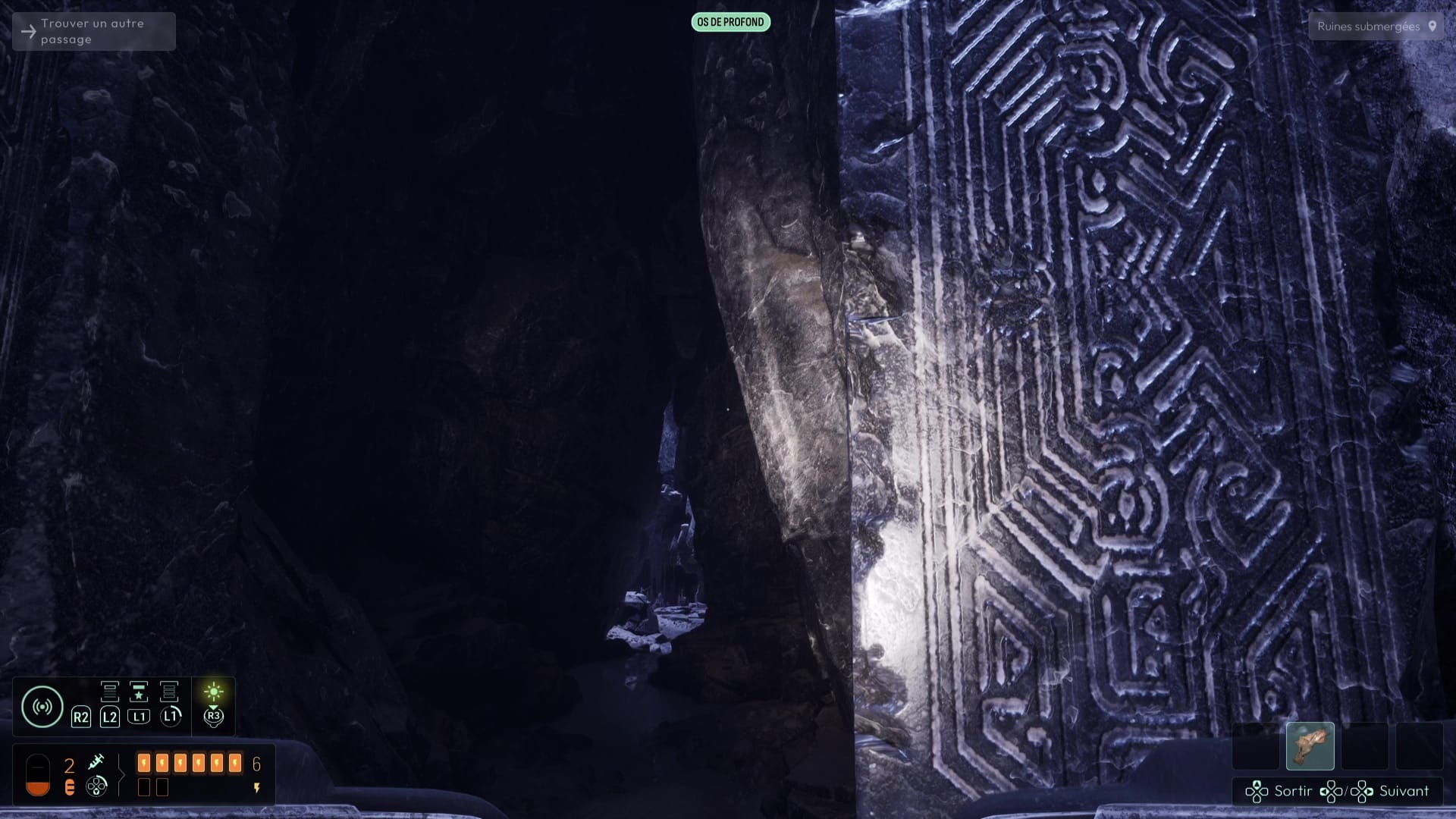 Le sonar vous montrera de nombreux rochers fragiles ici grâce à la précieuse fréquence « Algue invasive », mais repérez en contrebas celui retenant une grosse chaîne rouillée. Sautez sur ce rocher en contrebas pour libérer la chaîne dont l’éboulement provoqué viendra clore le courant qui vous chassait jadis. Plongez dans les profondeurs pour apercevoir absolument partout une tonne d’ossements, ainsi qu’une nouvelle tablette des anciens, dans un coin « Recharge occulte ».