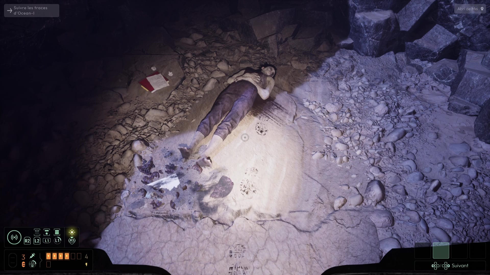 Au tout début de cette zone, vous pouvez apercevoir une grotte. Ici, vous trouverez des affaires personnelles de Mei, prouvant son passage auparavant. Vous pouvez notamment débloquer une fréquence « Sang humain » sur votre sonar grâce aux empreintes de pas au sol. Si vous regardez sous la couverture, vous trouverez le téléphone d’Elsa donnant des nouvelles rassurantes sur son plan. Ressortez de la grotte et suivez le chemin des empreintes dans la brume grâce au sang humain. Vous pénétrez dans une nouvelle cavité, disposant d’un lichen pas très frais.