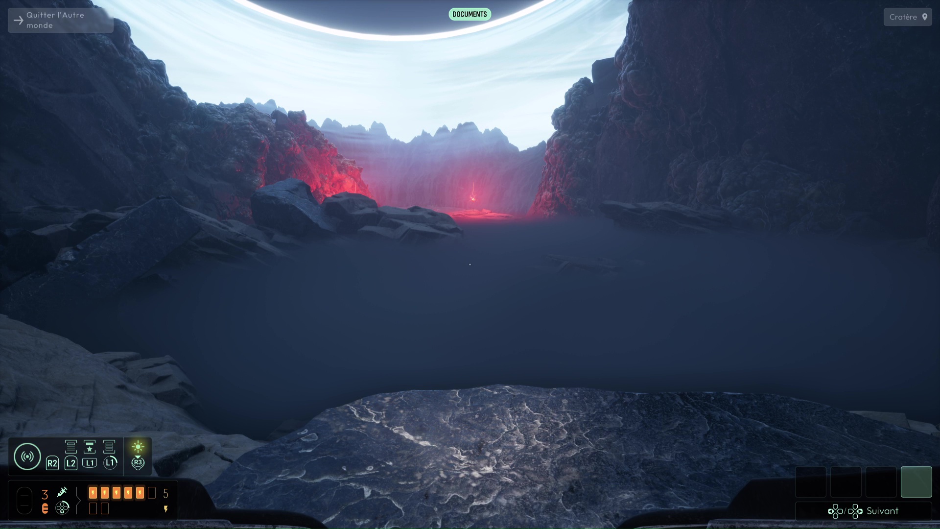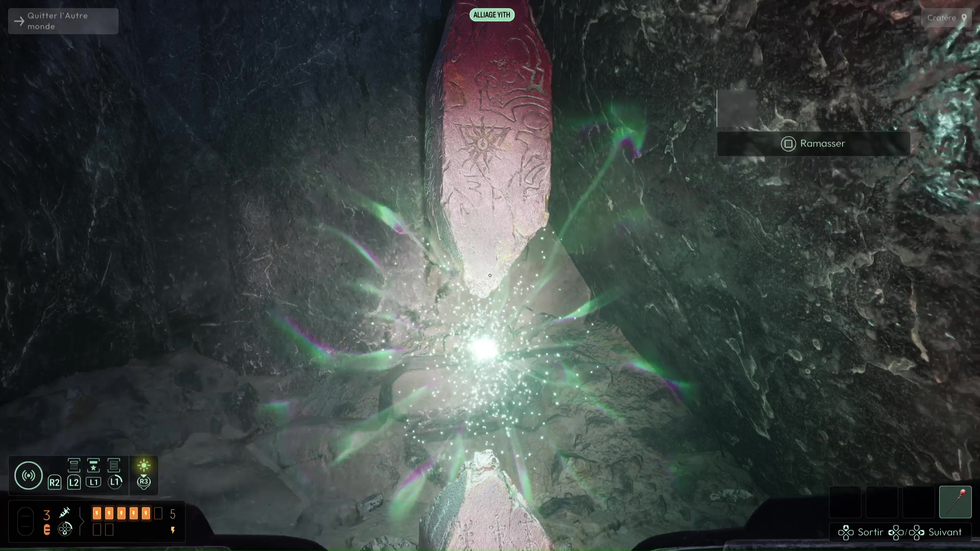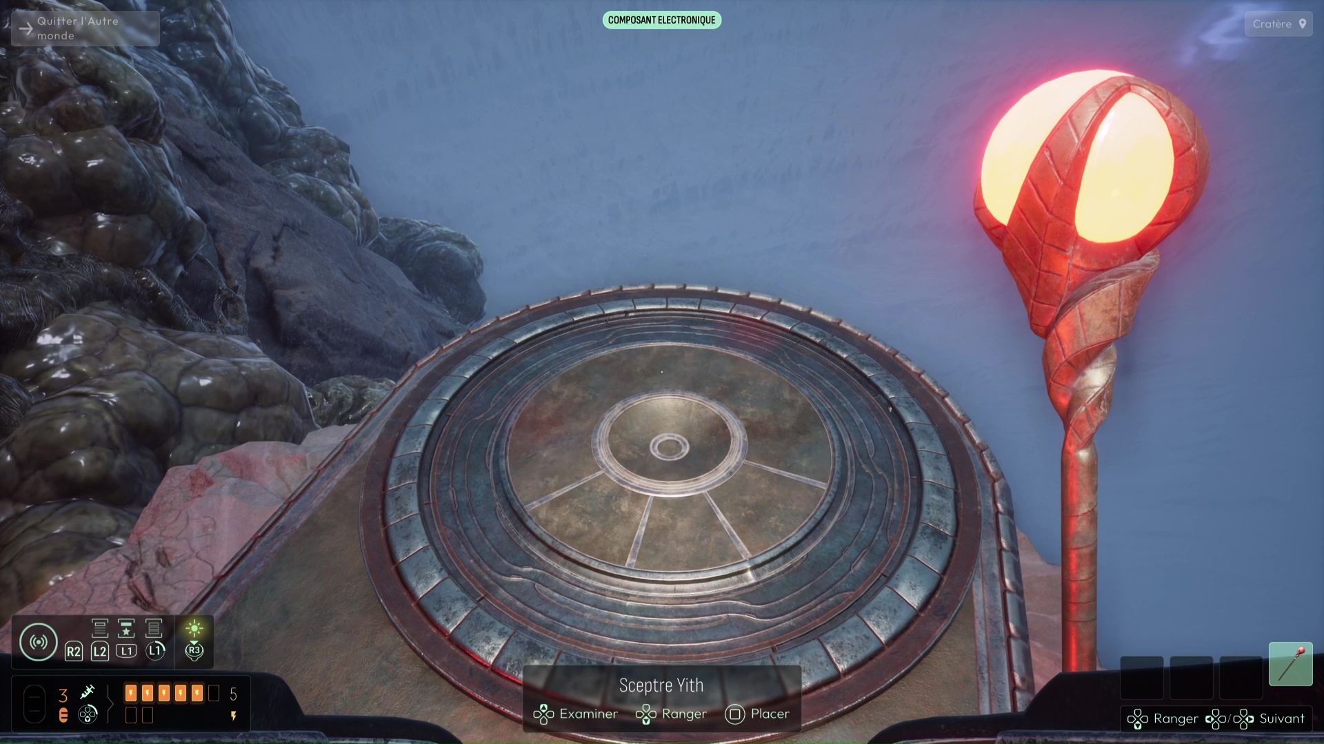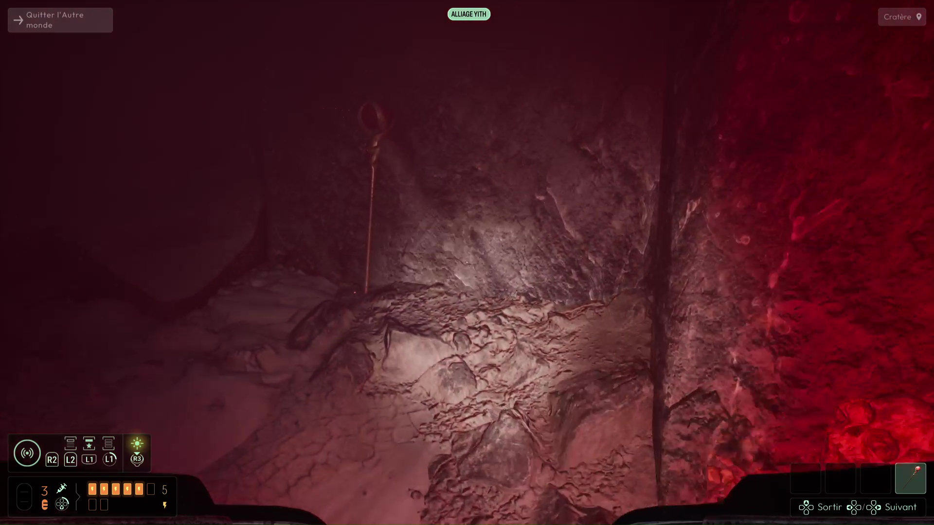 La porte à votre droite s’ouvre alors, vous permettant d’emprunter un nouveau chemin. Avancez puis descendez dans la zone en contrebas. Analysez la structure métallique que vous trouverez un peu plus loin pour débloquer la fréquence « Alliage Yith » sur votre sonar. Utilisez cette fréquence pour progresser dans le nouveau brouillard qui vous attend. Ici, en faisant gaffe, vous devrez trouver un Lichen bleu. Suivez ensuite le chemin jusqu’à la plateforme émettant une lueur rouge. Sur celle-ci se trouvent deux Sceptres. Il vous faudra trouver le dernier Sceptre utilisable. Utilisez votre sonar avec la fréquence « Alliage Yith » pour le localiser en contrebas dans une grotte, près d’un squelette.