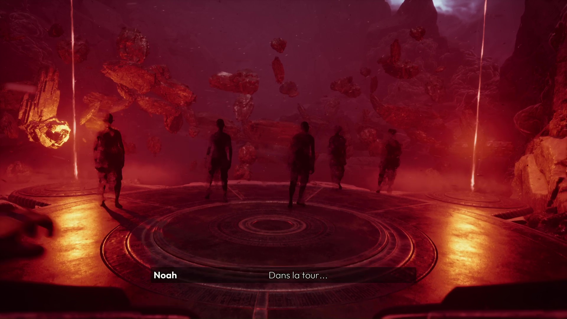 Ici, Noah devra résoudre une énigme pour poursuivre son chemin. Au bord de cette pièce se situent quatre stèles mentionnant une partie de l’Histoire de ces lieux. Pour progresser, commencez par analyser chacune de ces stèles. Rejoignez le bout du couloir pour constater la présence d’un réceptacle à quatre emplacements. En revenant près des stèles, vous remarquez que des palets sont apparus devant chacune d’elles.