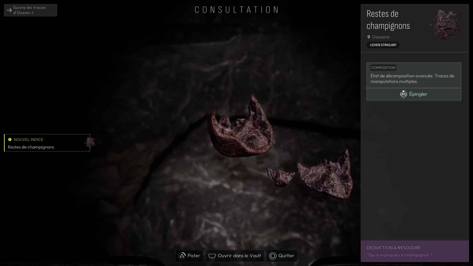 Si vous analysez le champignon, vous devrez débloquer une interrogation. Vous dénicherez également au sol un vêtement ayant appartenu à Elsa, votre amie et collègue. Associez téléphone d’Elsa au champignon pour déduire son passage ici.