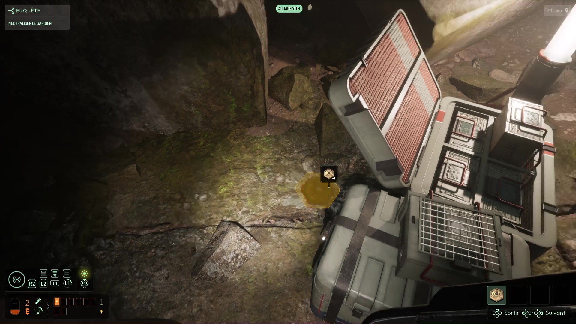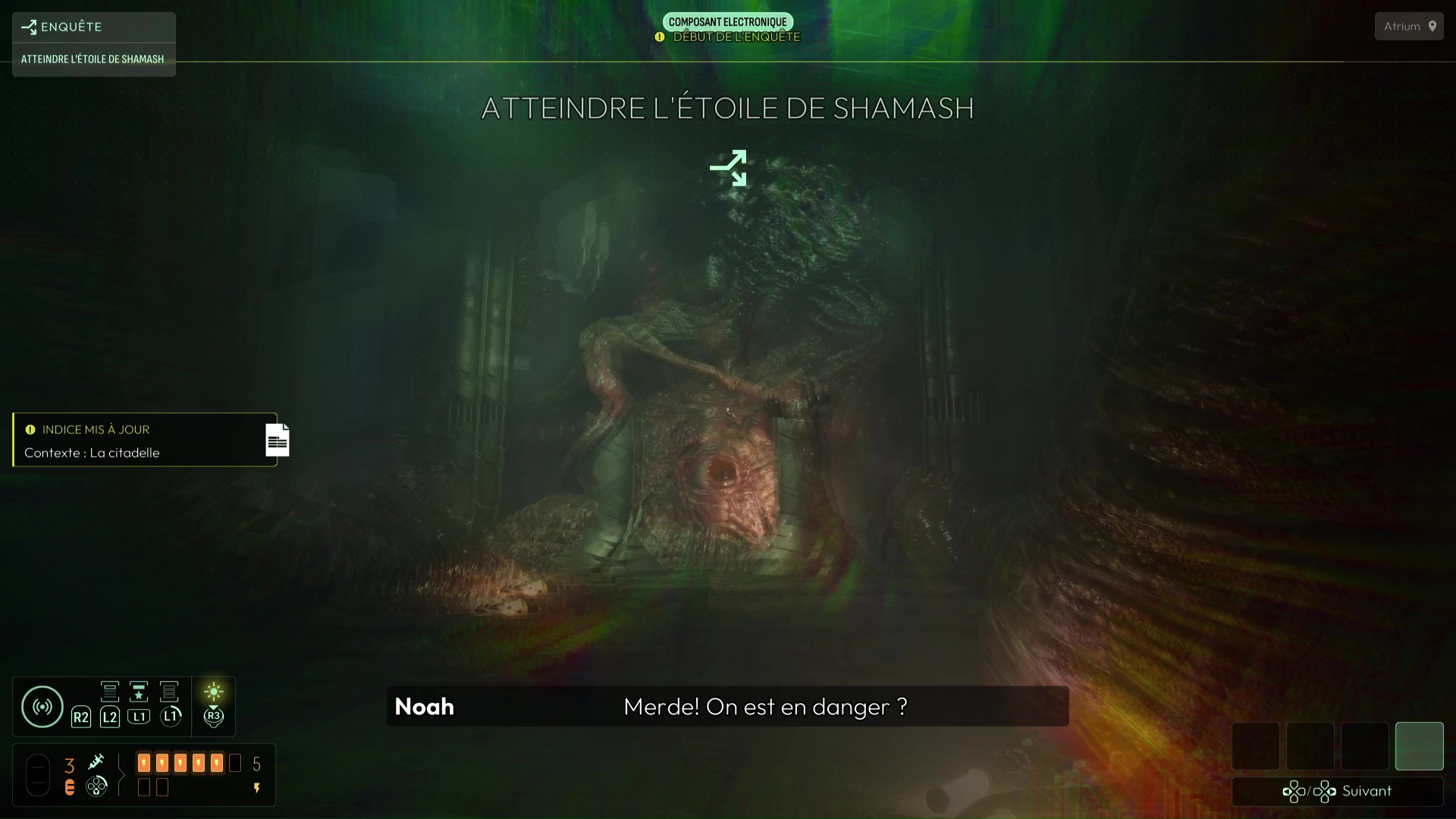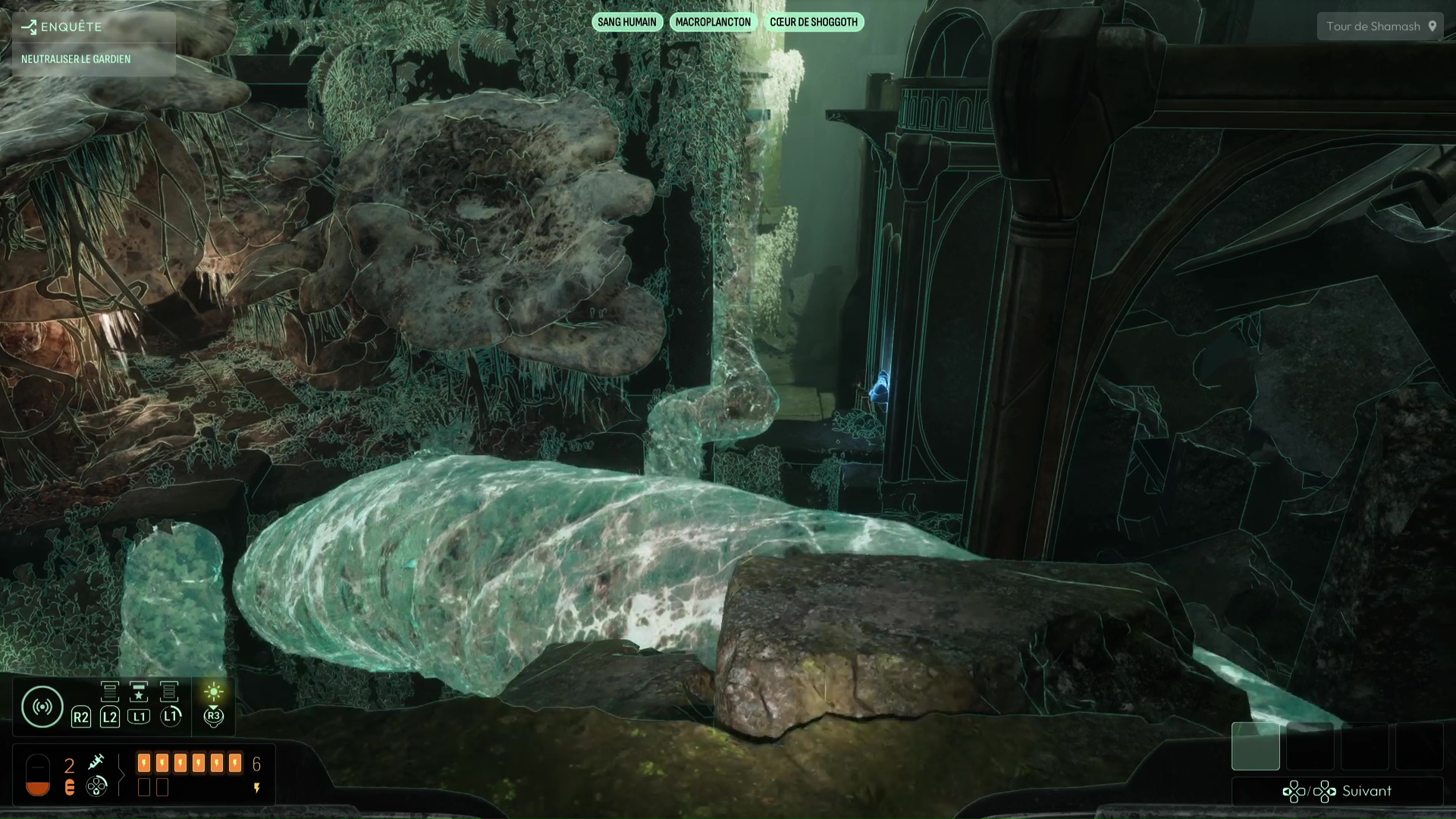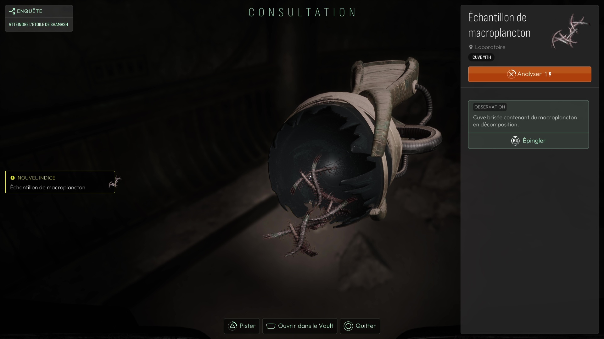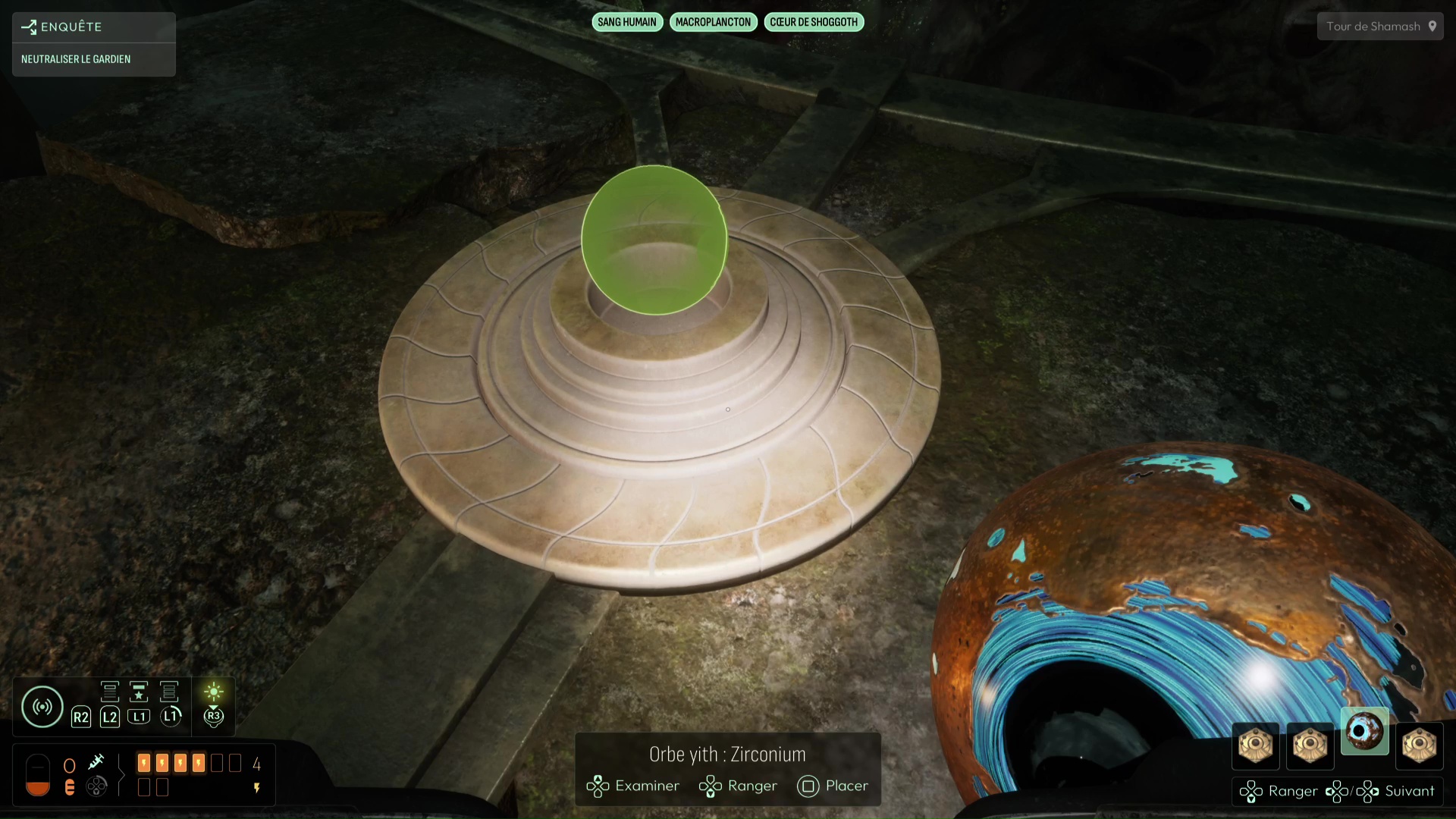 Vous pouvez tout aussi bien utiliser la fréquence « Alliage Yith » pour localiser cet endroit, puis placez-y l’orbe juste créée. Le Gardien ainsi hypnotisé, vous pouvez emprunter sans trop de risques l’escalier juste à côté et ainsi suivre le chemin des tentacules invisibles (grâce à vos trois fréquences déduites plus tôt) jusqu’à rejoindre le siège de l’Étoile de Shamash. Vous devrez faire en route une ou deux découvertes assez marquantes pour votre aventure et ce qui s’y joue.