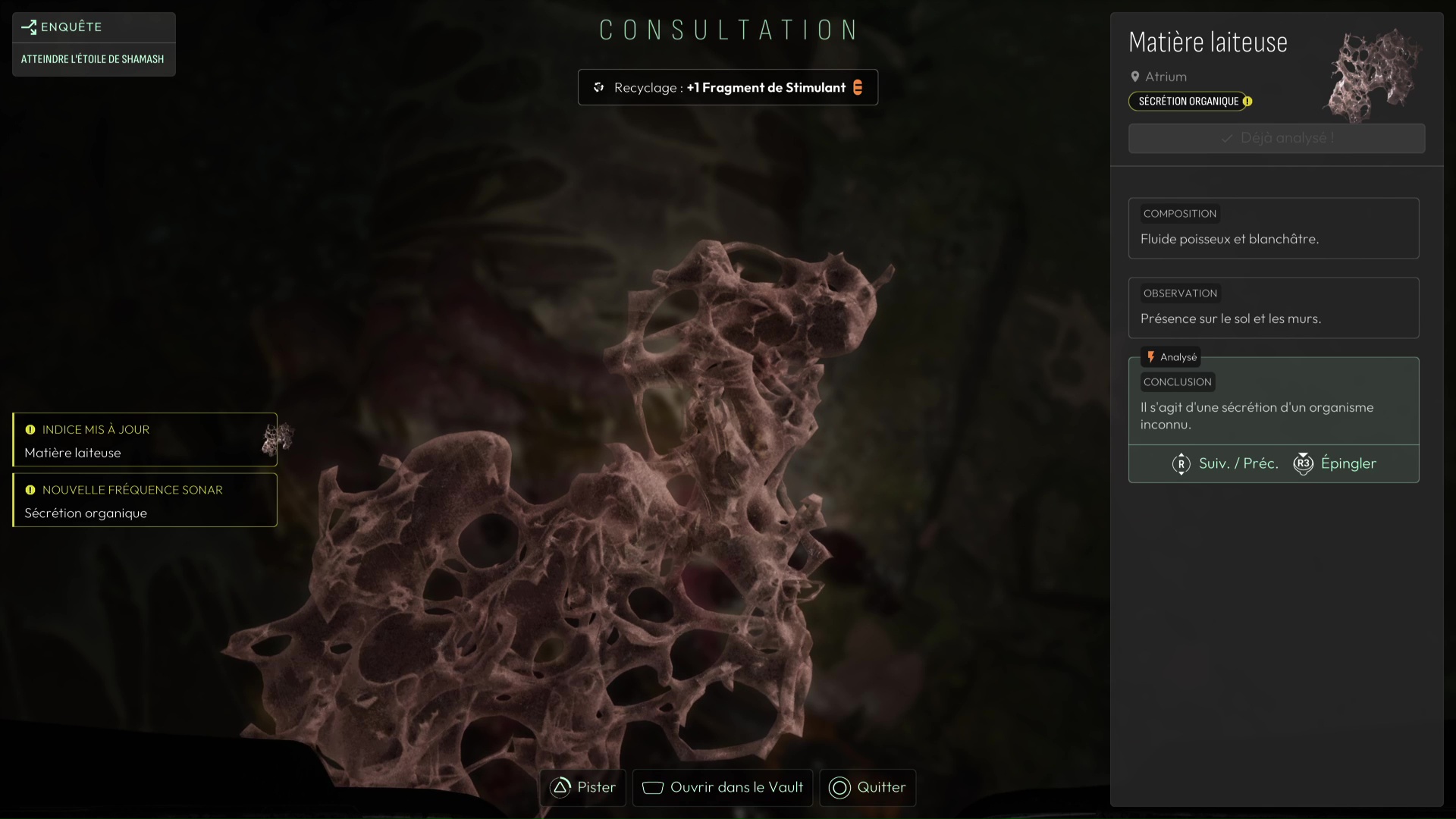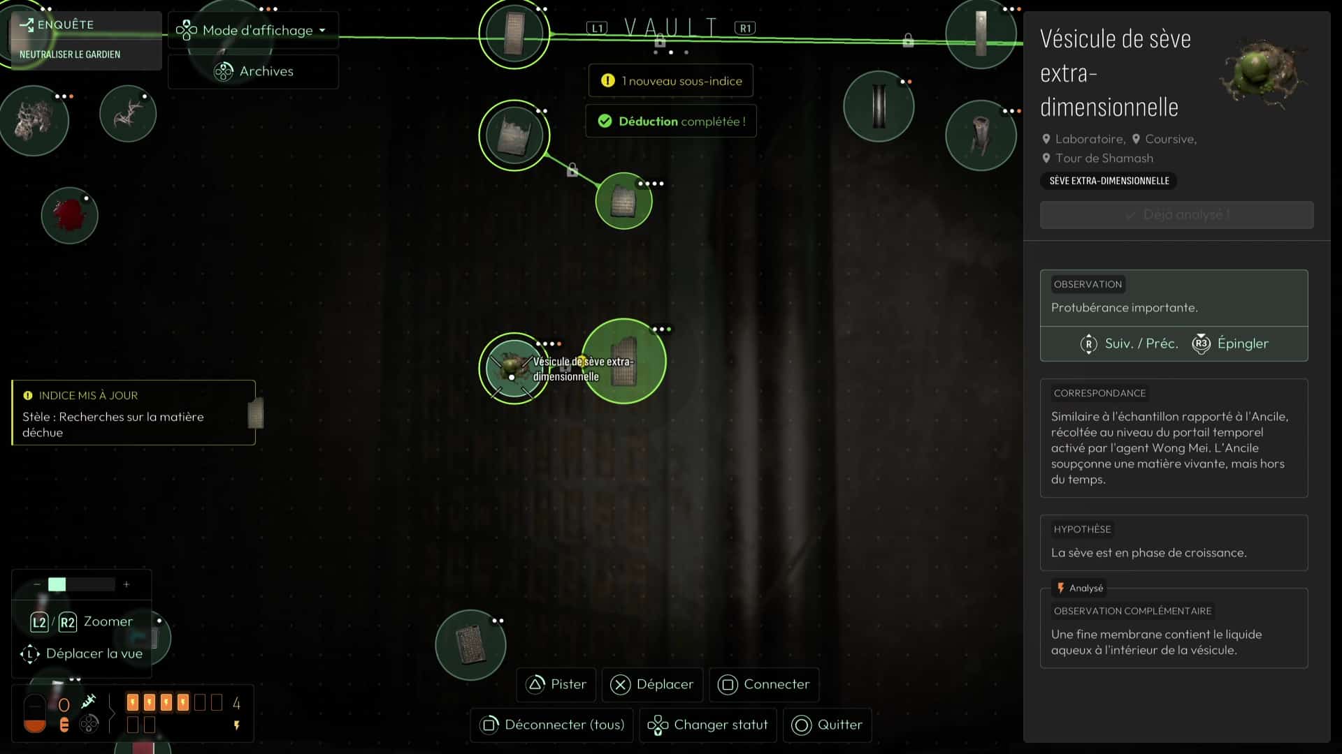 - En réalité, vous la connaissez déjà : il s’agit de la sève extradimensionnelle que vous avez pu croiser au laboratoire notamment. Vous pouvez donc d’ores et déjà faire glisser cette découverte sur cette interrogation : vous provoquez la déduction sur les expériences menées ici et le pouvoir de cette substance.