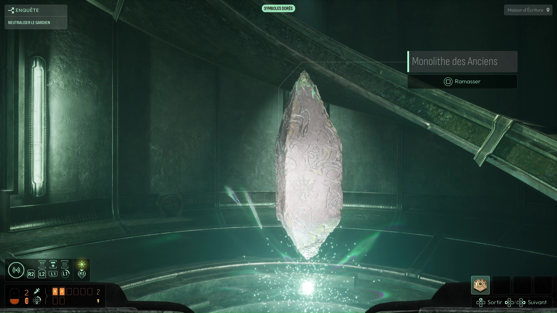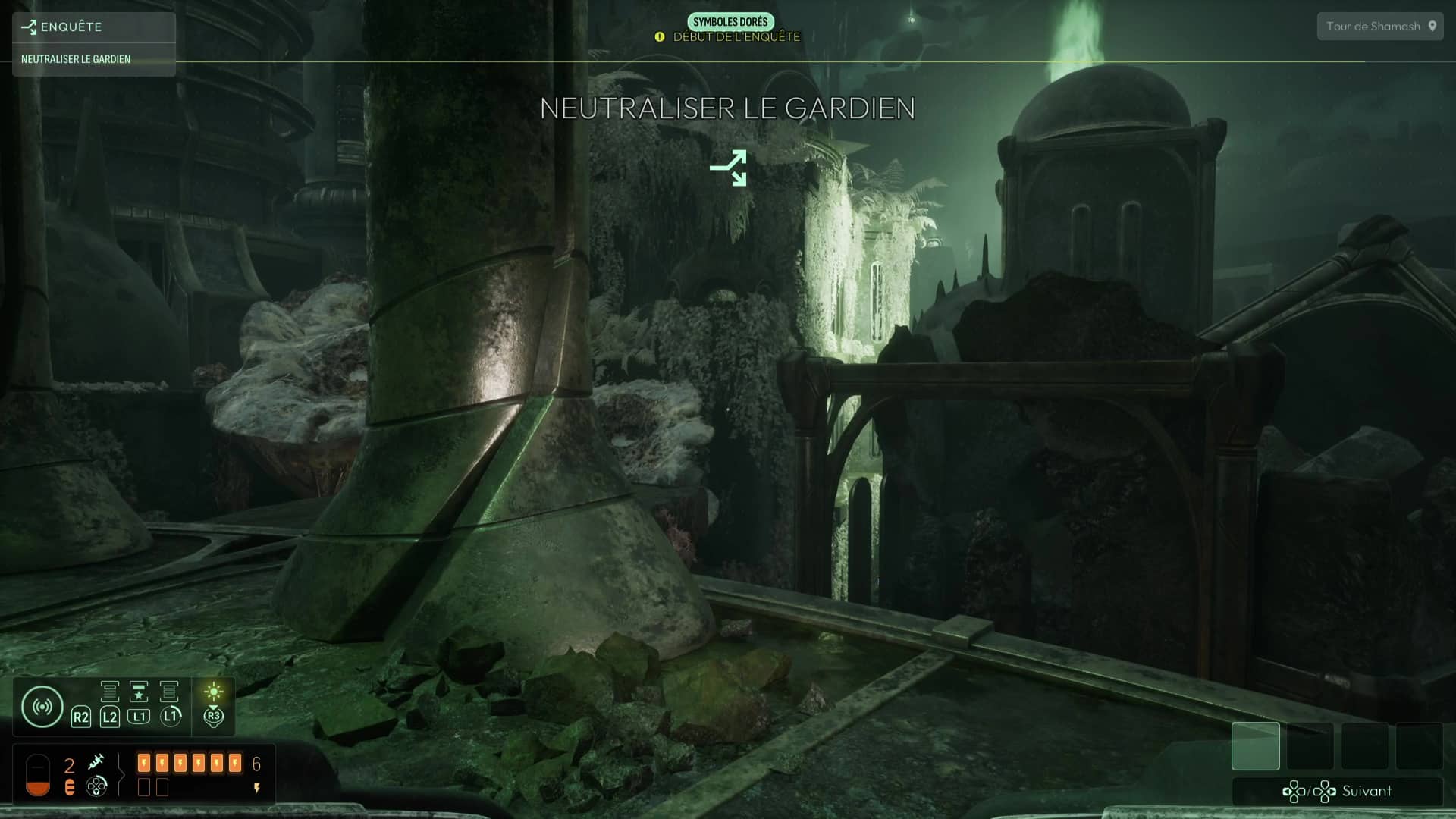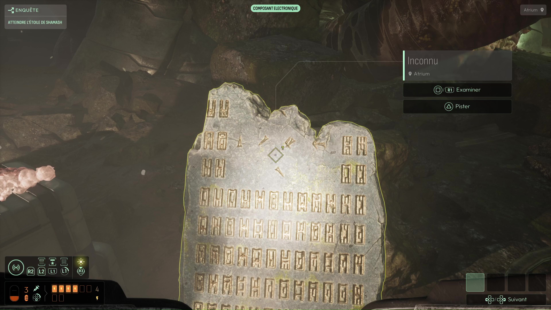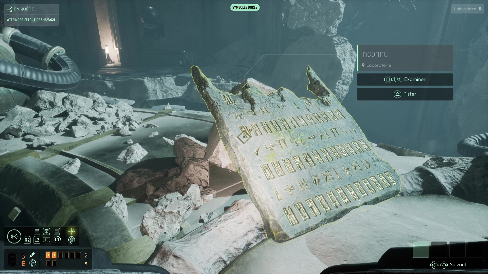 L’Etoile de Shamash se situe tout en haut de la tour protégée par le Gardien. Celui-ci vous observe de ses gros yeux et vous ne pourrez pas passer aussi facilement. Repérez sur le sol une drôle de substance à analyser pour débloquer la fréquence « Sécrétion organique » sur votre sonar. Quand vous faites face au Gardien, prenez à gauche en passant ses tentacules pour trouver un camp de fortune d’Océan-I. Analysez la stèle présente sur place pour débloquer la fréquence « Symboles dorés » ainsi qu’une interrogation, « Comment traduire les symboles alphabétiques étranges ? ».