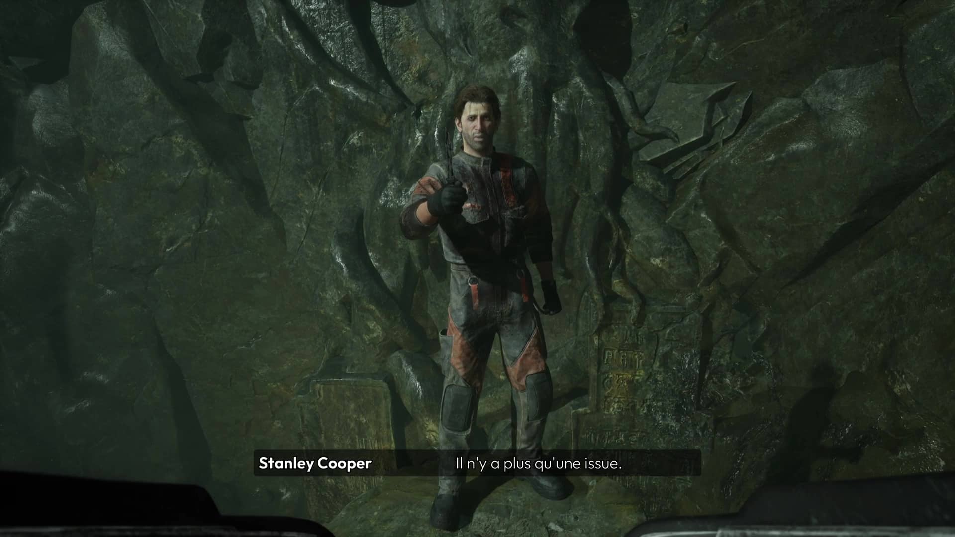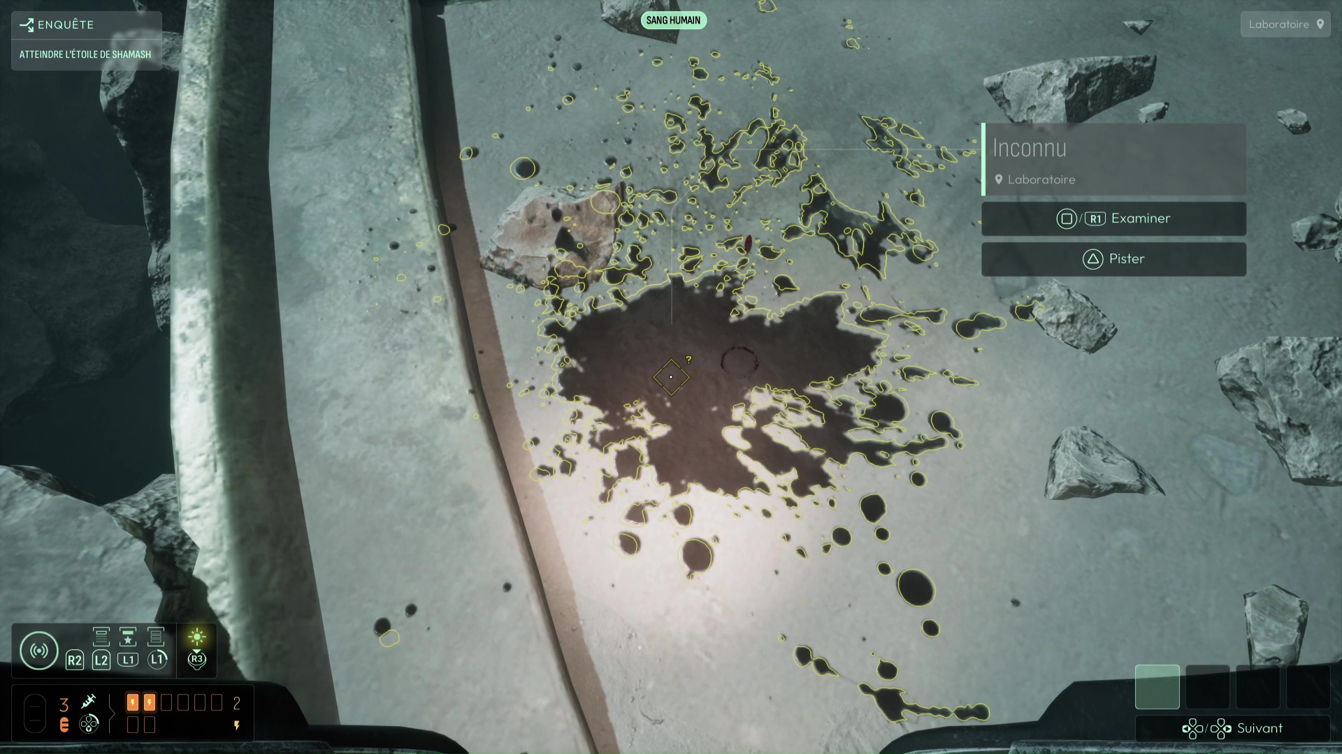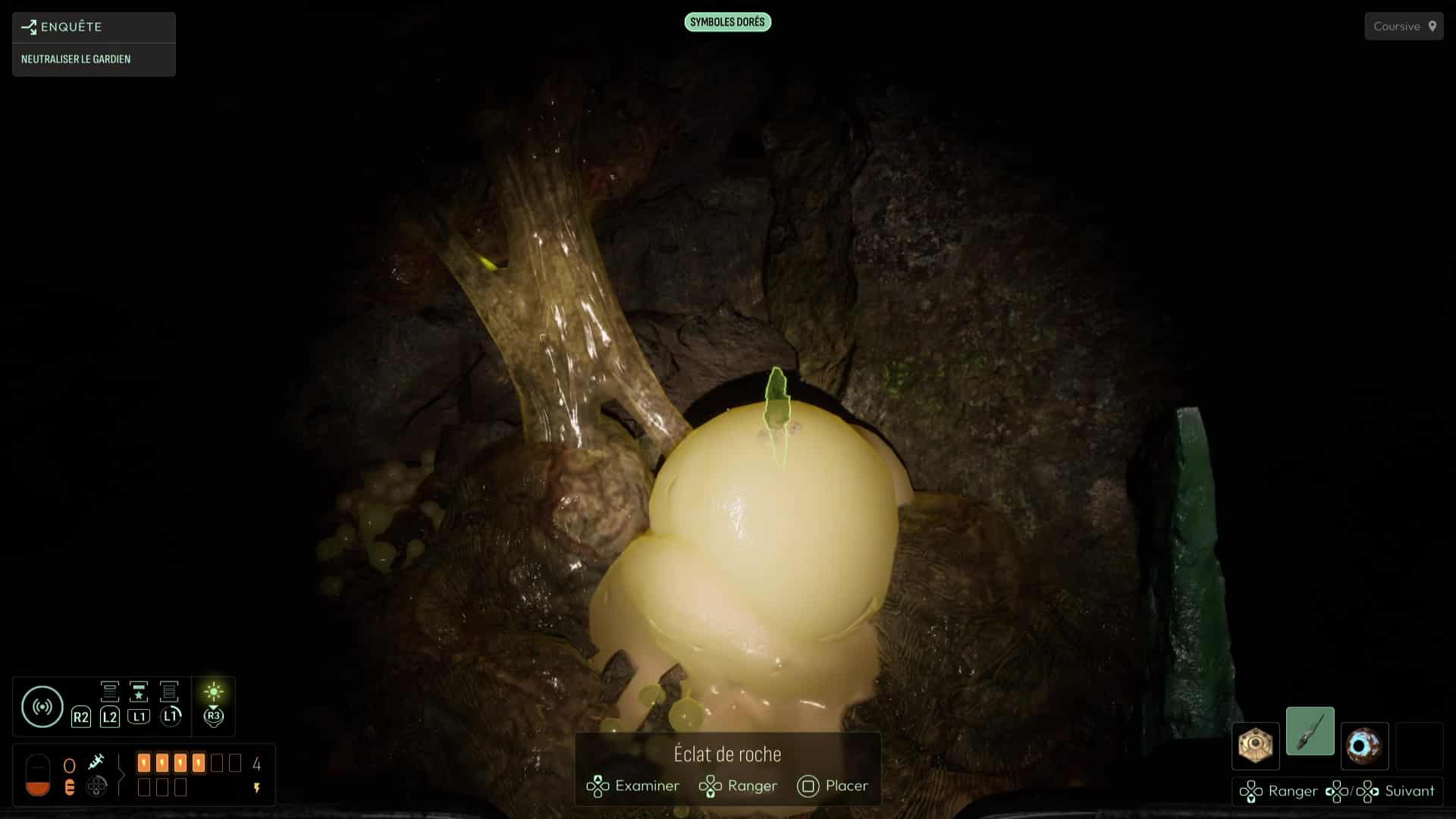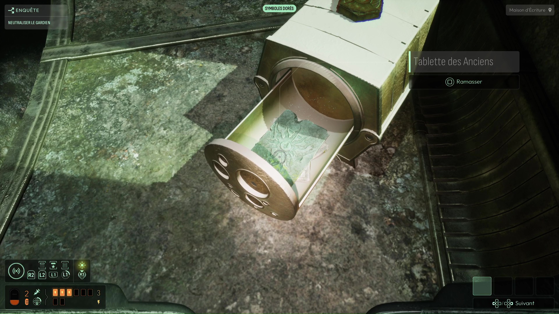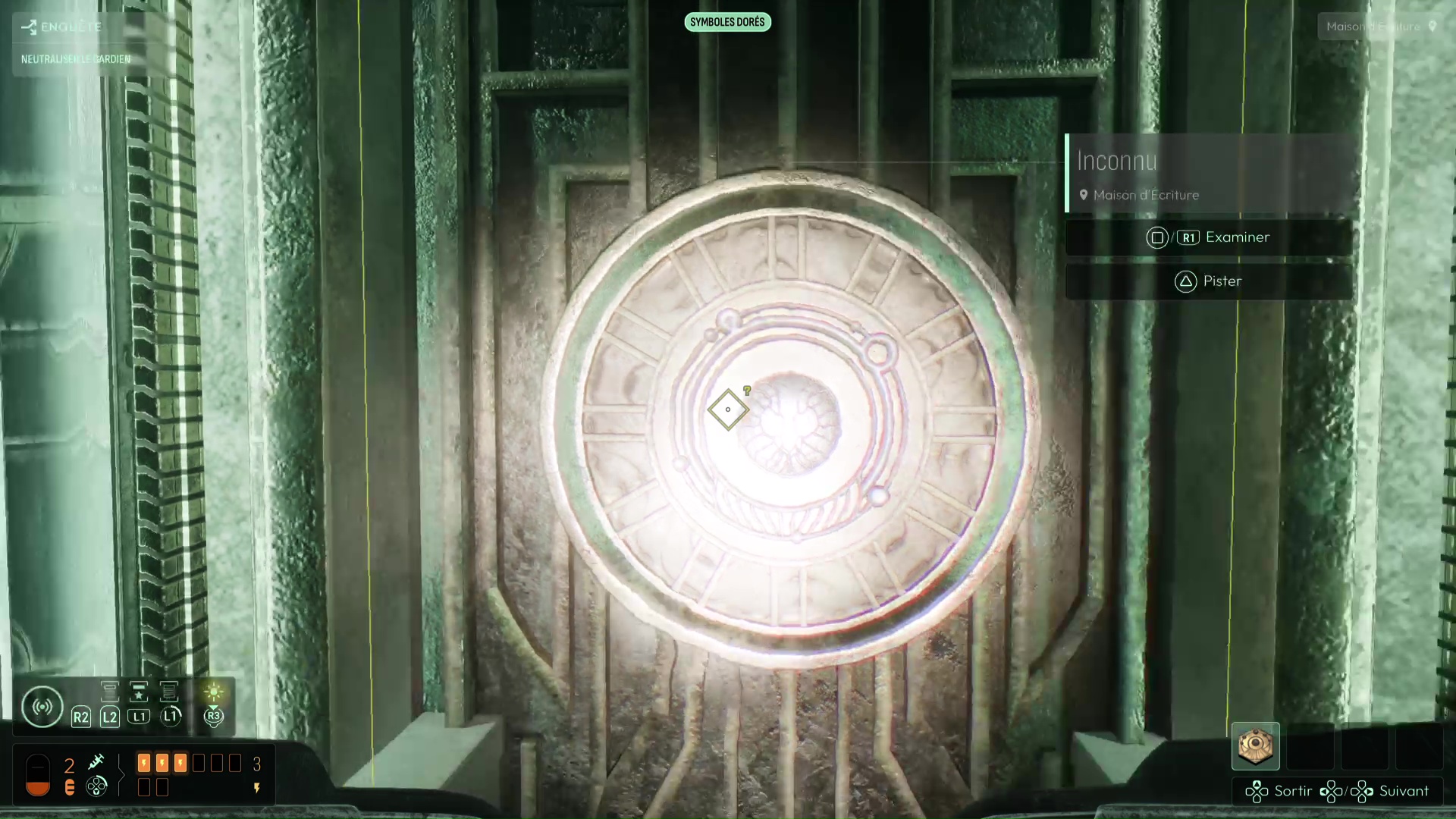 L’Etoile de Shamash se situe tout en haut de la tour protégée par le Gardien. Celui-ci vous observe de ses gros yeux et vous ne pourrez pas passer aussi facilement. Repérez sur le sol une drôle de substance à analyser pour débloquer la fréquence « Sécrétion organique » sur votre sonar. Quand vous faites face au Gardien, prenez à gauche en passant ses tentacules pour trouver un camp de fortune d’Océan-I. Analysez la stèle présente sur place pour débloquer la fréquence « Symboles dorés » ainsi qu’une interrogation, « Comment traduire les symboles alphabétiques étranges ? ».