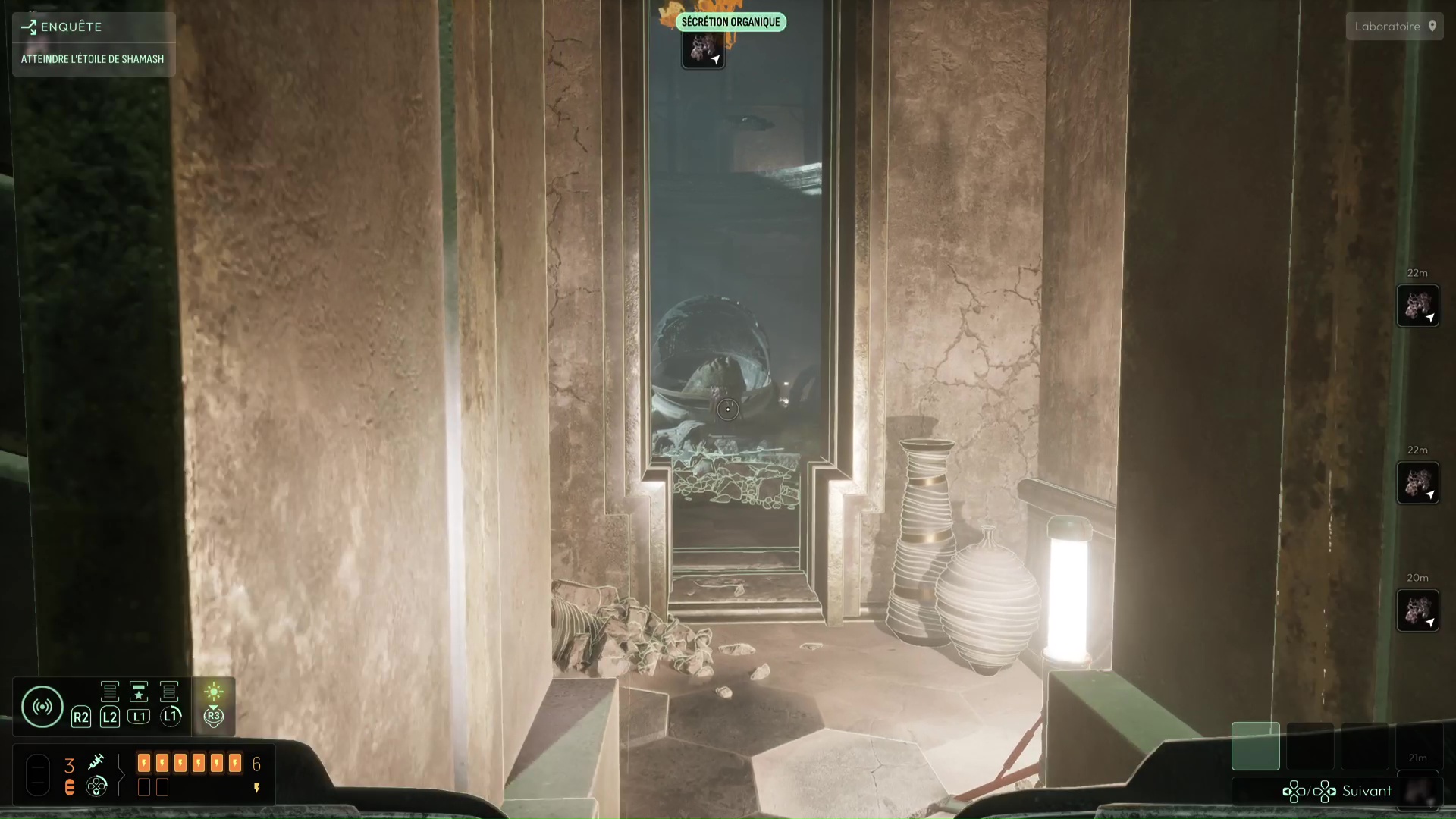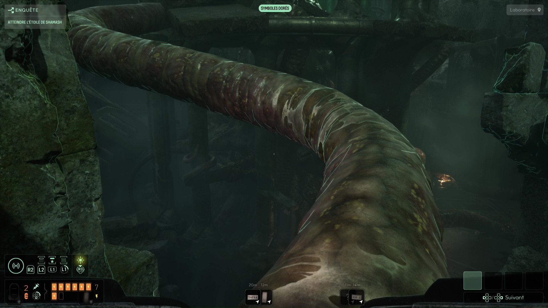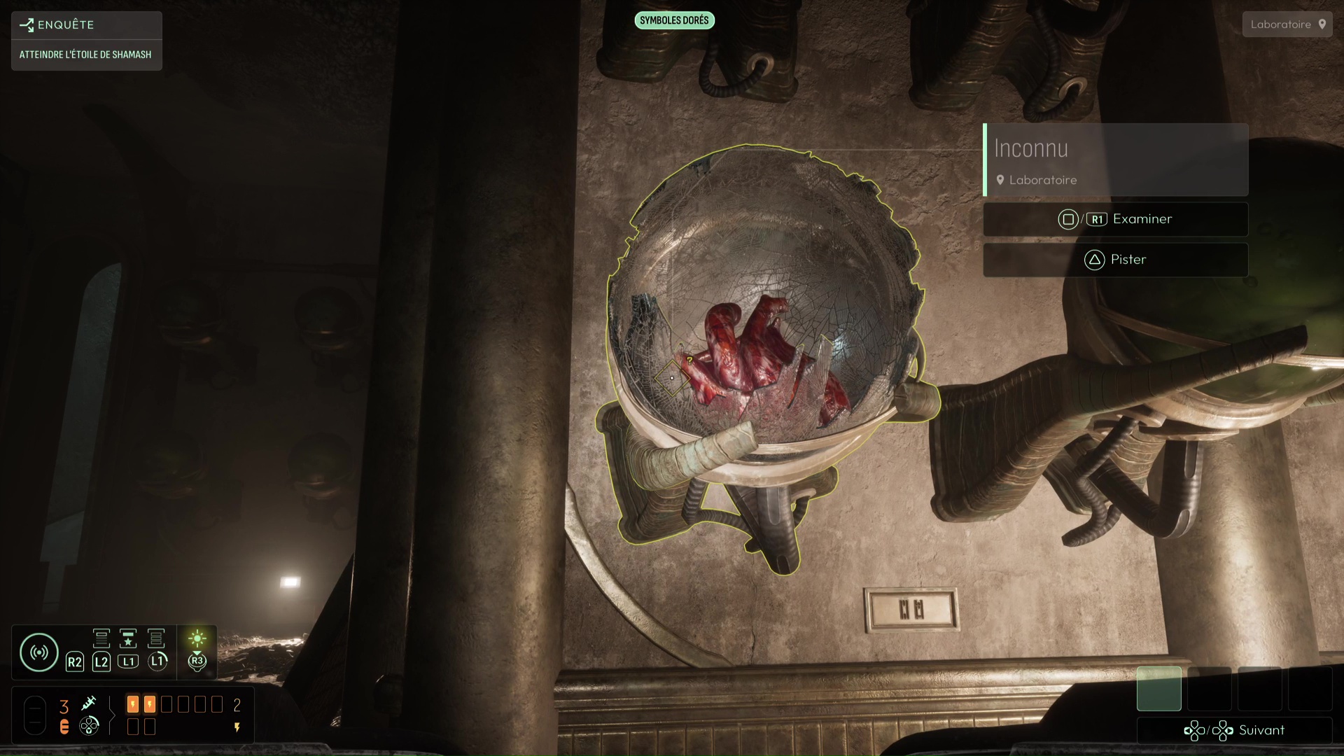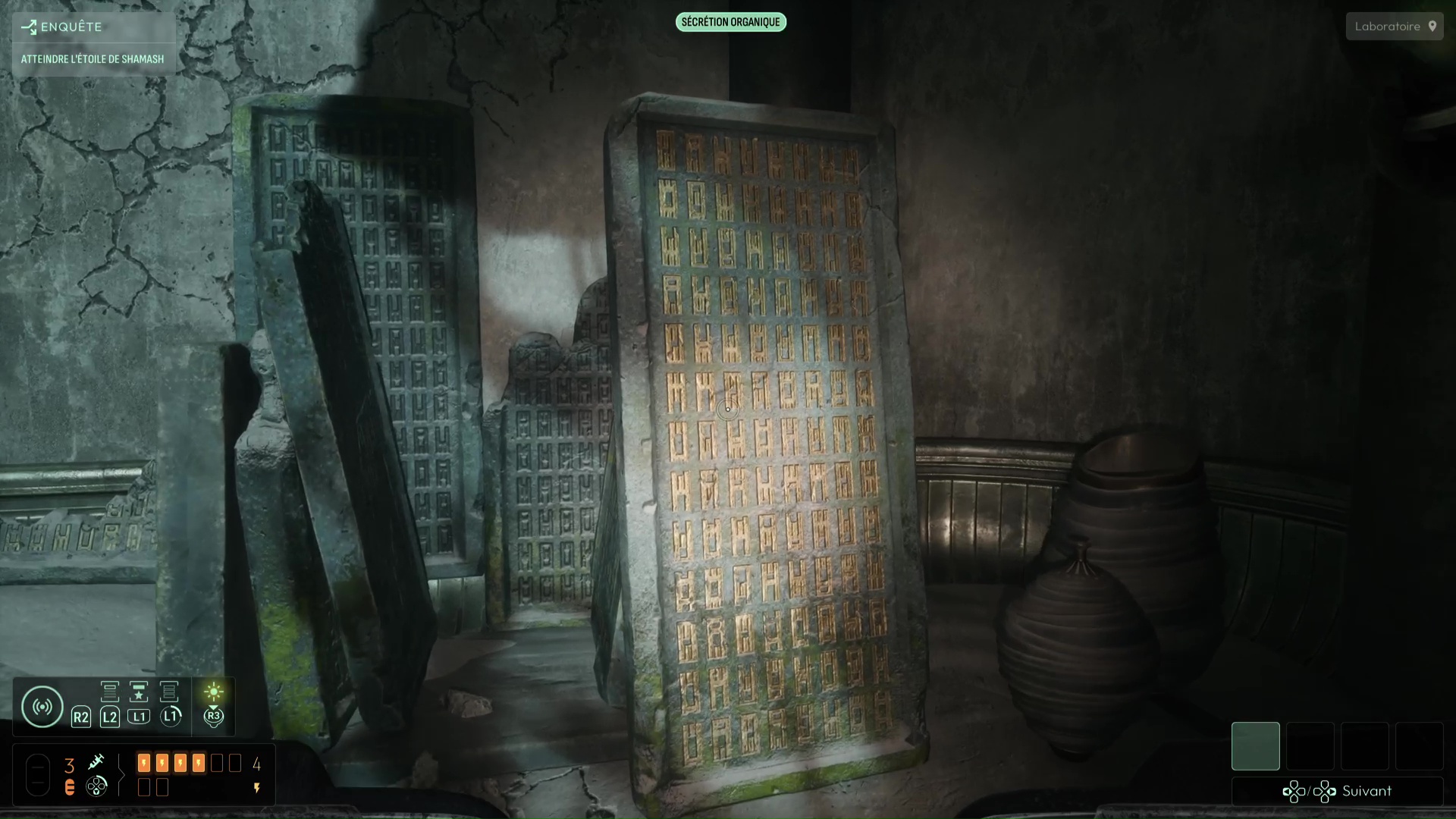En prenant le couloir se trouvant derrière vous (et contenant un obélisque d’évolution tout au fond), vous trouvez l’entrée du Laboratoire. Ici, de très nombreuses choses sont à scanner et analyser pour accroître vos connaissances et vos possibilités d’action. Analysez d’abord la substance visqueuse se dénichant à l’entrée pour débloquer la fréquence « Sève extradimensionnelle ». Utilisez également votre fréquence « Symboles dorés » pour dénicher toutes les stèles du lieu (et notamment la stèle de dévotion incomplète contenant l’alphabet à déchiffrer pour comprendre les inscriptions) et vous faire un bon pécul d’informations avant de rejoindre le centre du laboratoire pour trouver la deuxième partie de la stèle incomplète.