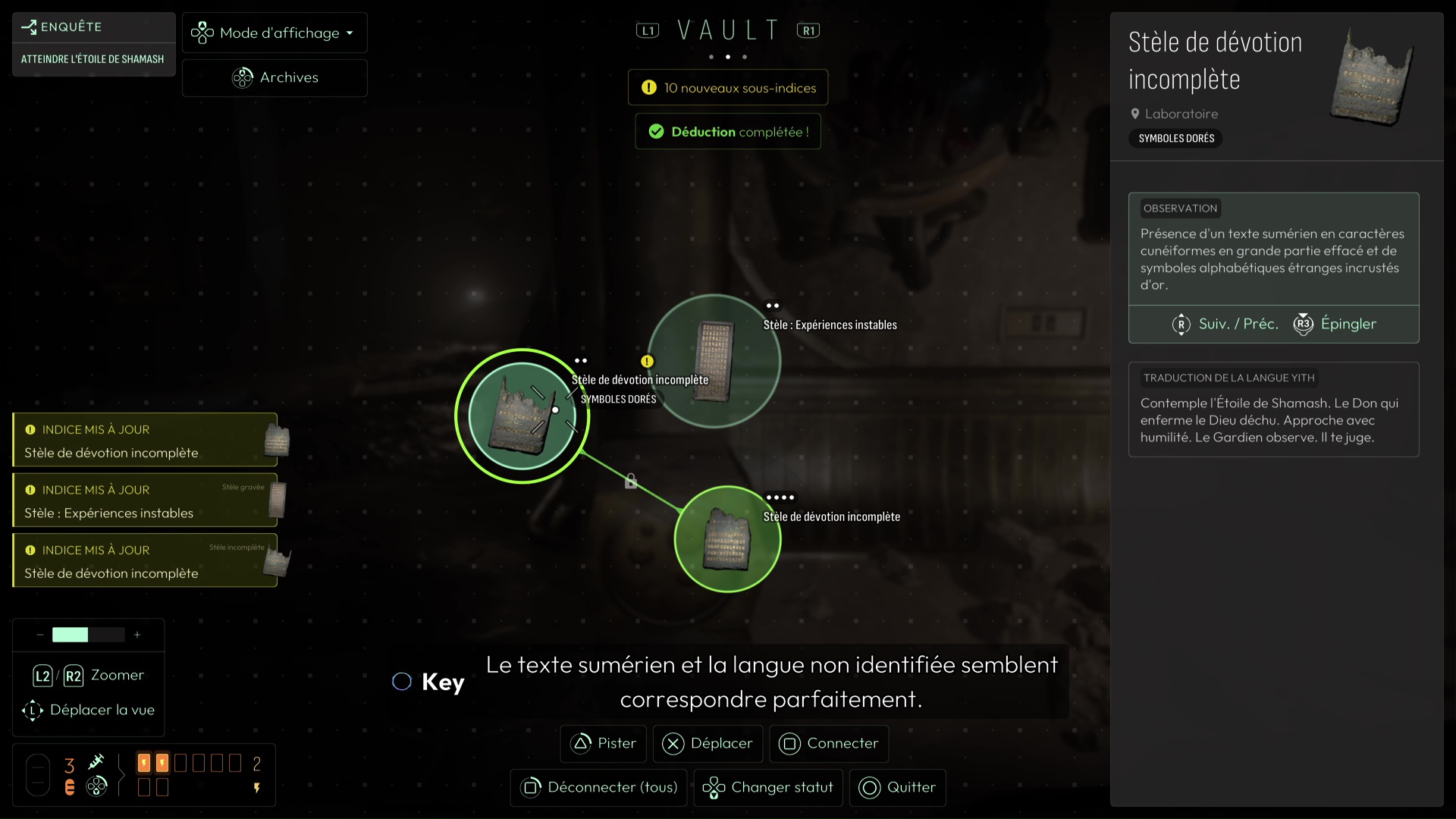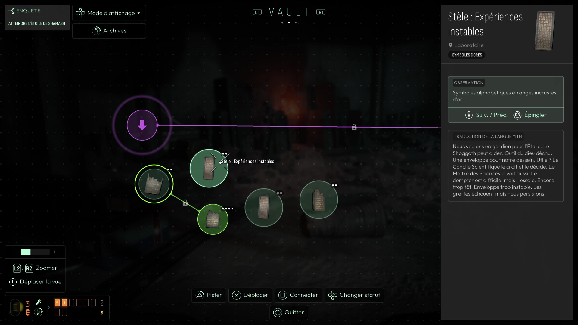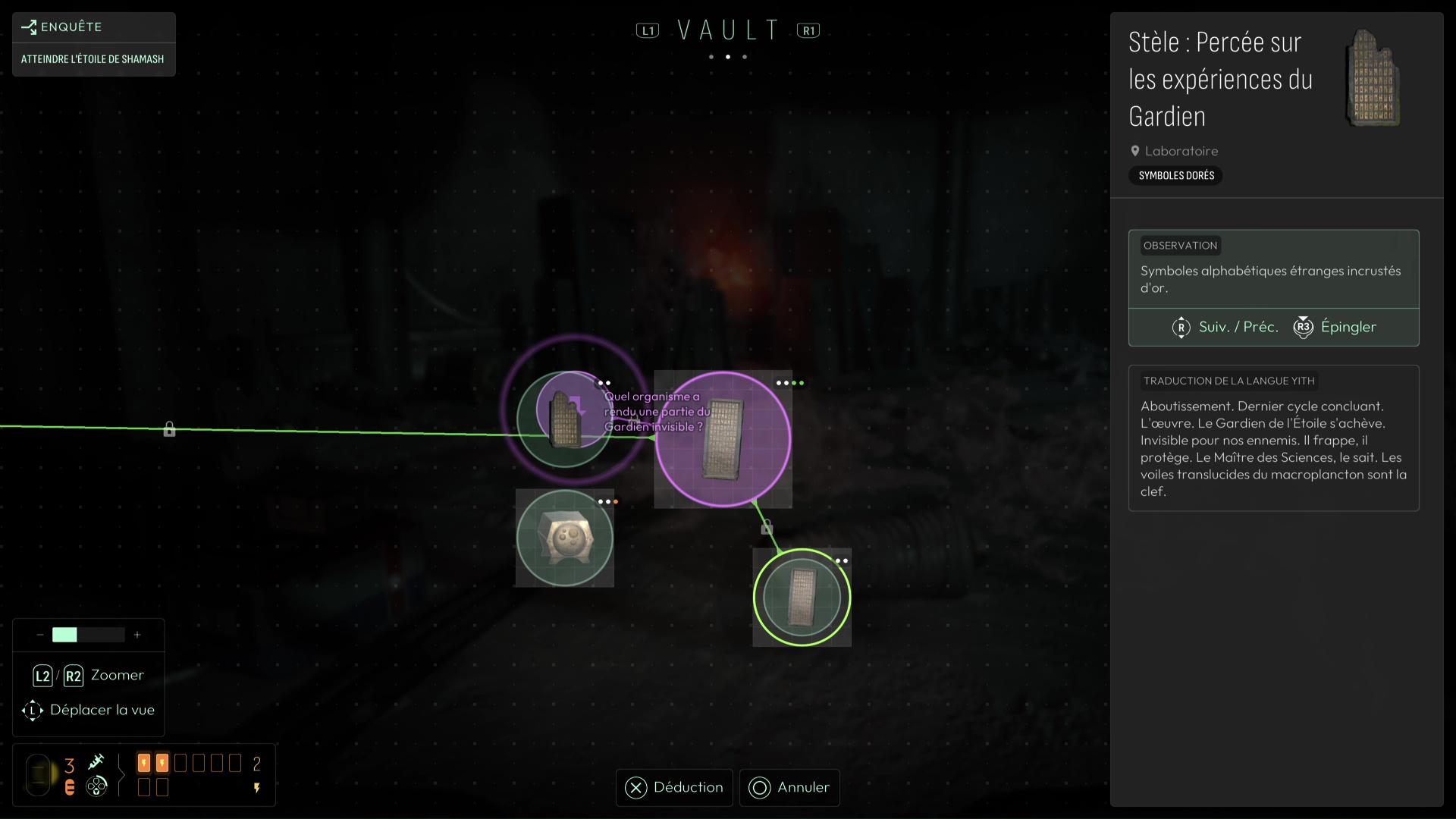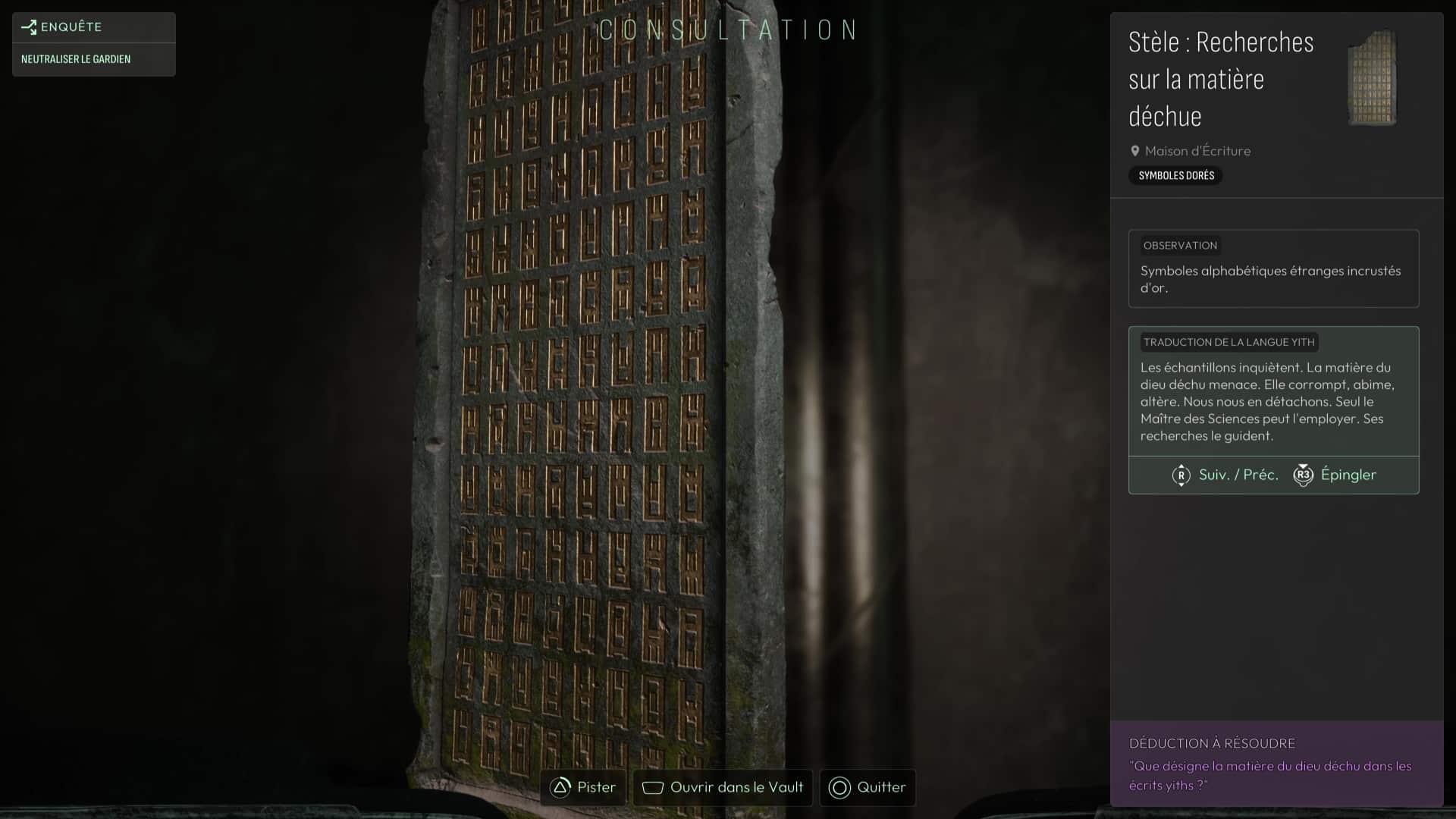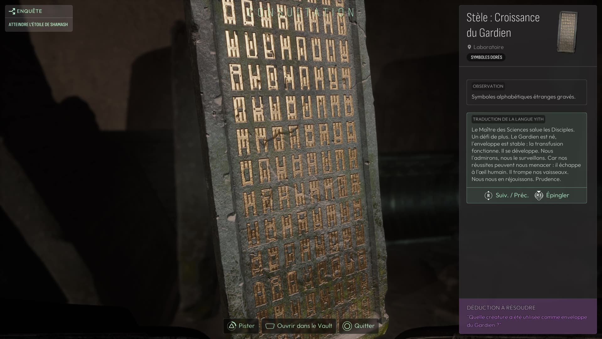 Montez à l’étage du laboratoire et analysez toutes les stèles présentes ici pour déclencher une nouvelle interrogation à résoudre dans votre inventaire.