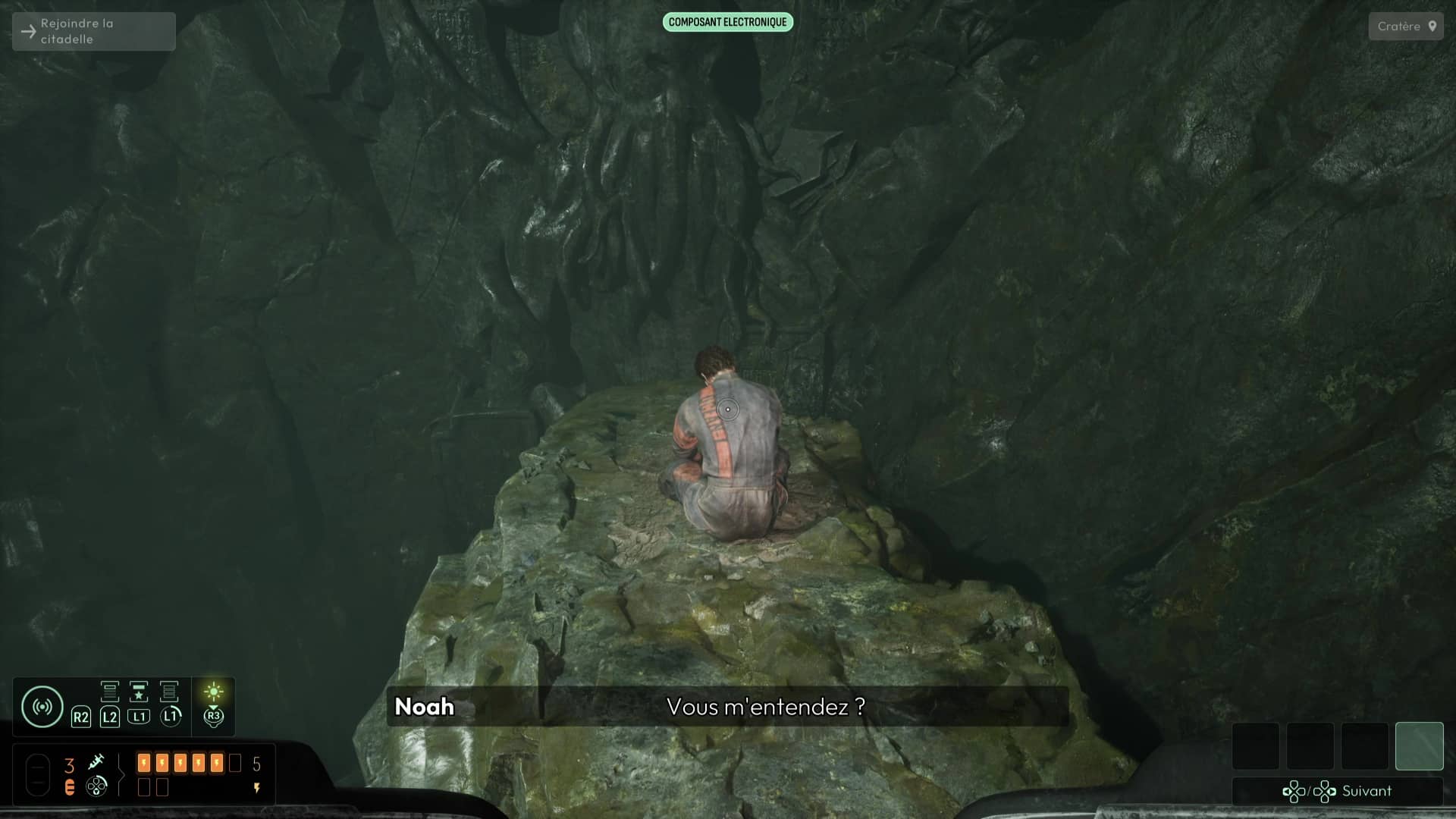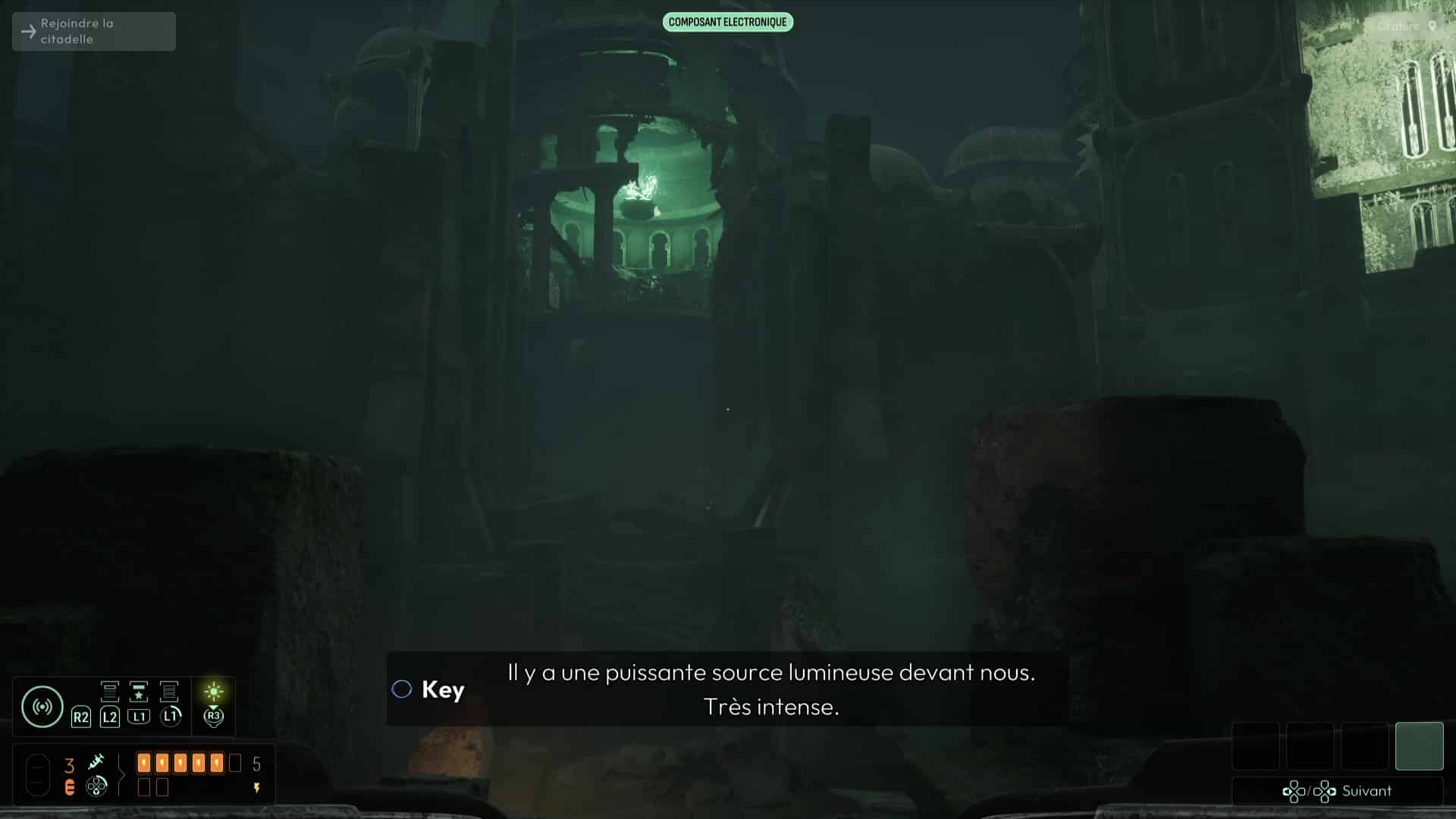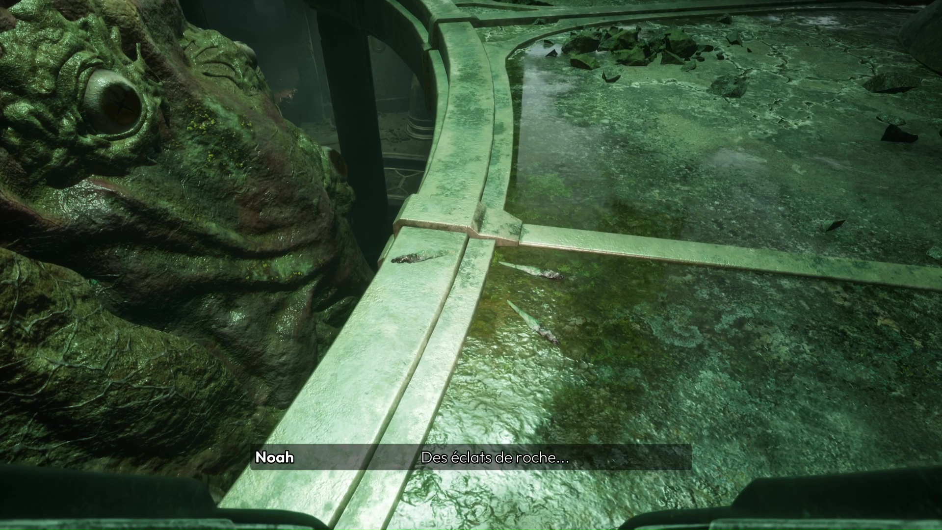 Combinez ces trois fréquences dans votre menu de sonar et retournez à l’étage supérieur du laboratoire pour l’utiliser et voir apparaître devant vos yeux ébahis les fameuses tentacules jusqu’alors invisibles. Vous pouvez donc traverser les zones inaccessibles auparavant, en circulant sur ces tentacules au centre de la pièce, en prenant garde à ne pas perdre de temps et ainsi éviter de vous faire… manger. De l’autre côté du laboratoire, empruntez le trou dans le mur pour grimper sur la tentacule et rejoindre l’étage supérieur de la tour centrale de la Citadelle. Avancez jusqu’à la cinématique et ramassez un morceau de pierre au sol pour le garder dans votre inventaire.