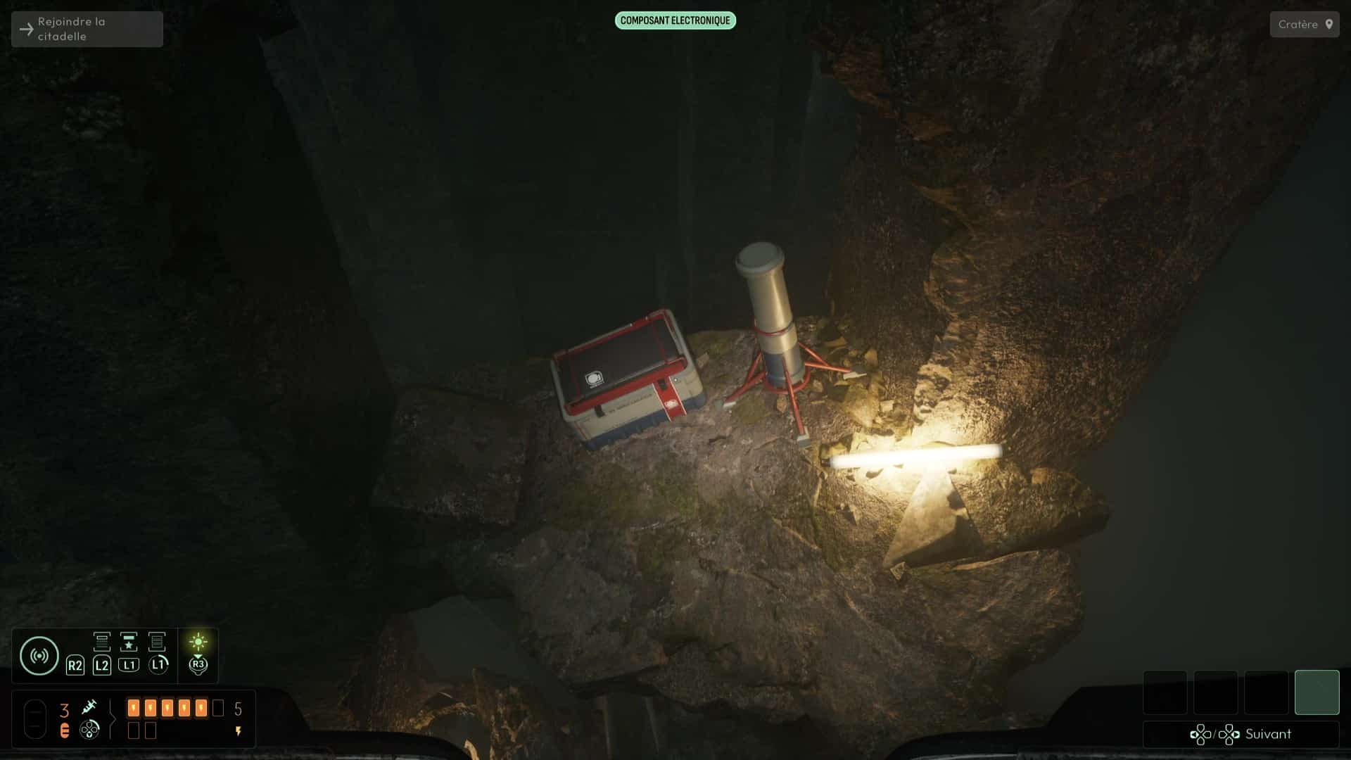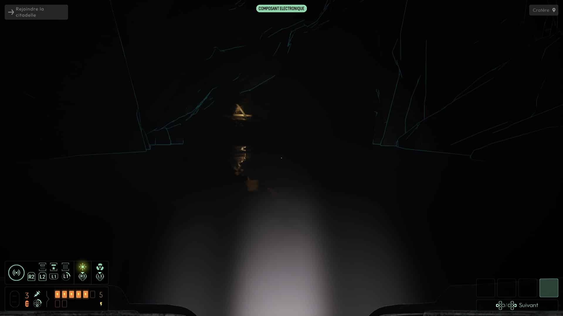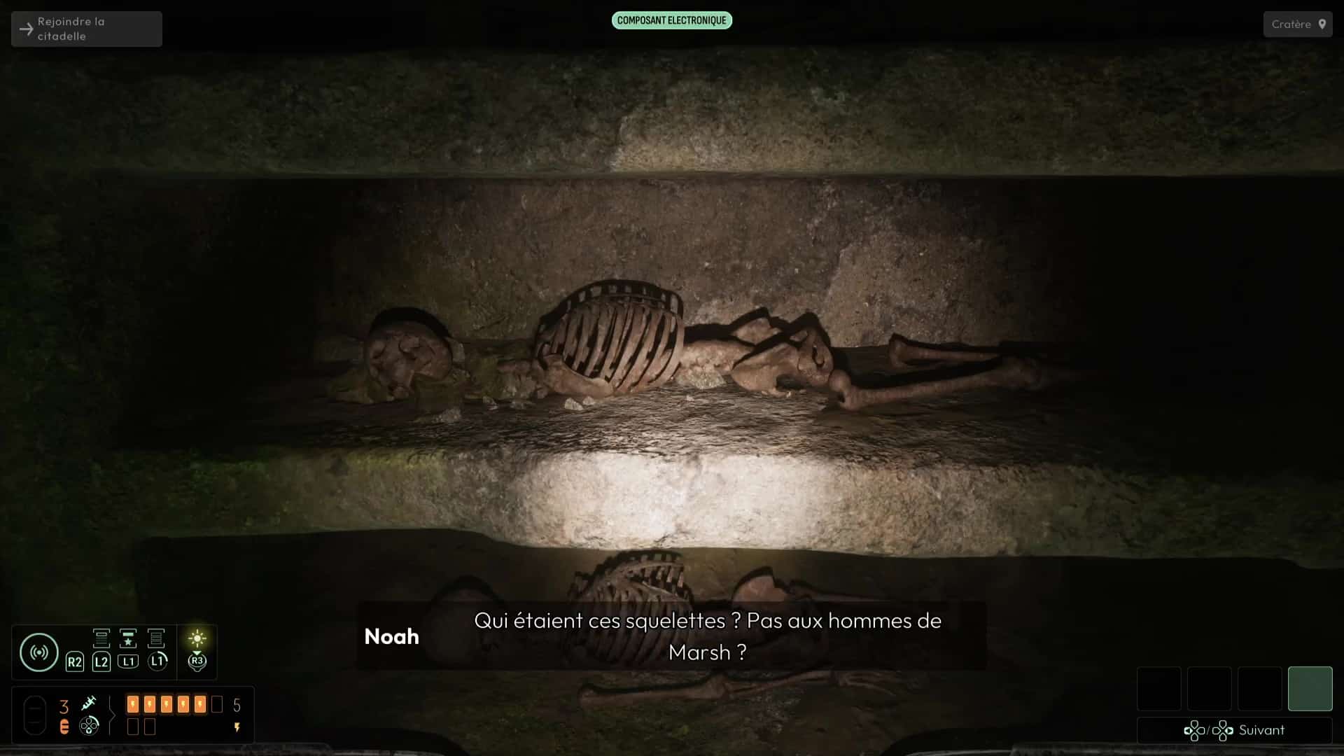 Combinez ces trois fréquences dans votre menu de sonar et retournez à l’étage supérieur du laboratoire pour l’utiliser et voir apparaître devant vos yeux ébahis les fameuses tentacules jusqu’alors invisibles. Vous pouvez donc traverser les zones inaccessibles auparavant, en circulant sur ces tentacules au centre de la pièce, en prenant garde à ne pas perdre de temps et ainsi éviter de vous faire… manger. De l’autre côté du laboratoire, empruntez le trou dans le mur pour grimper sur la tentacule et rejoindre l’étage supérieur de la tour centrale de la Citadelle. Avancez jusqu’à la cinématique et ramassez un morceau de pierre au sol pour le garder dans votre inventaire.