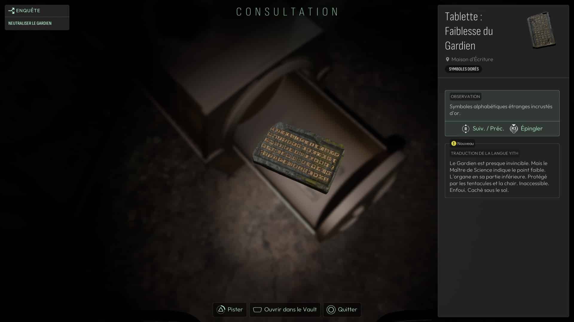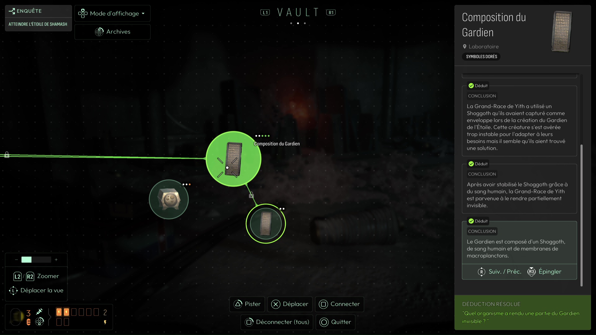 Vous déduisez de ce travail d’enquête la composition du Gardien, à savoir du Shoggoth, du sang humain et du macroplancton. Vous trouverez tous ces éléments à analyser obligatoirement, au rez-de-chaussée du laboratoire.