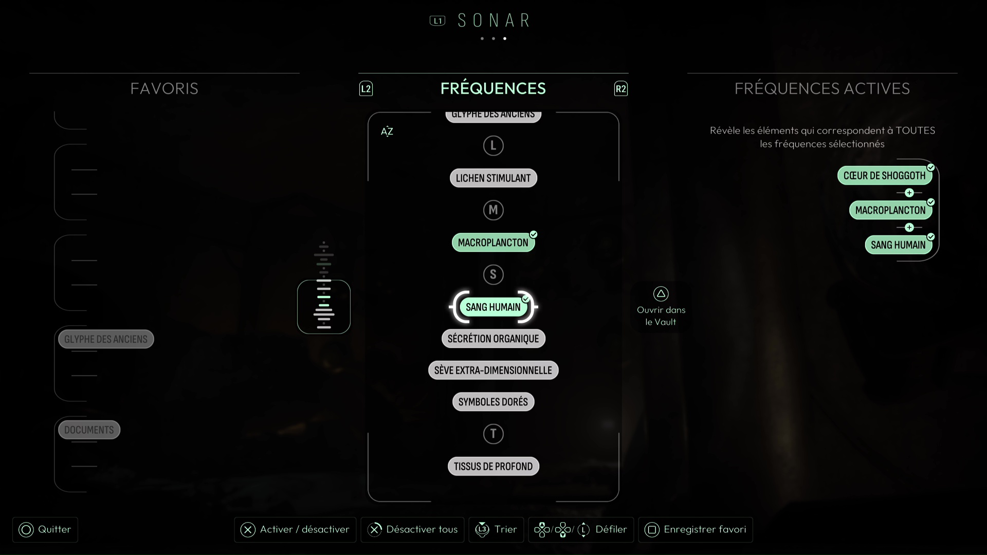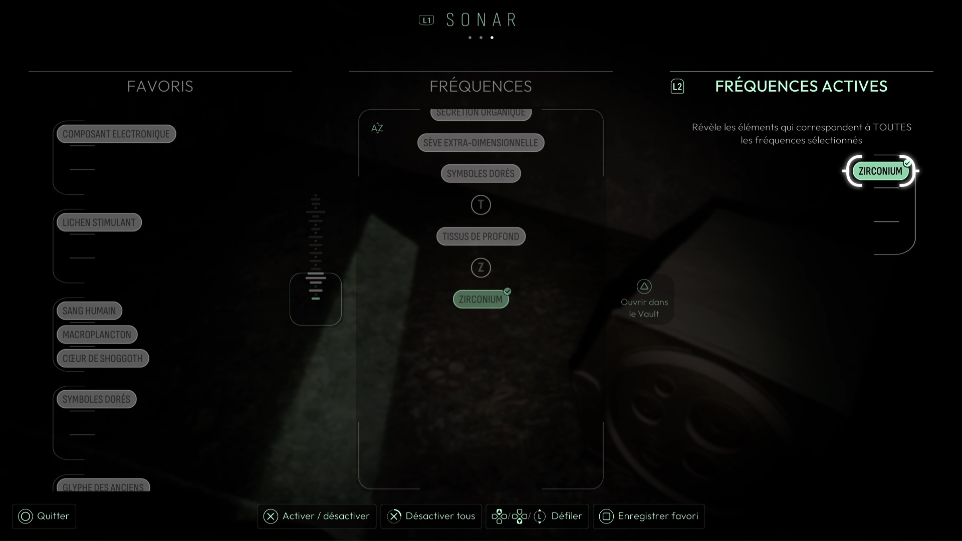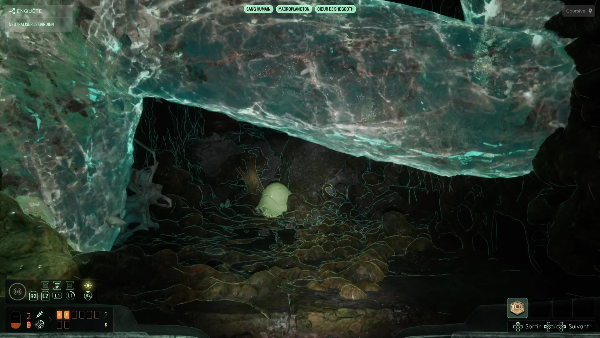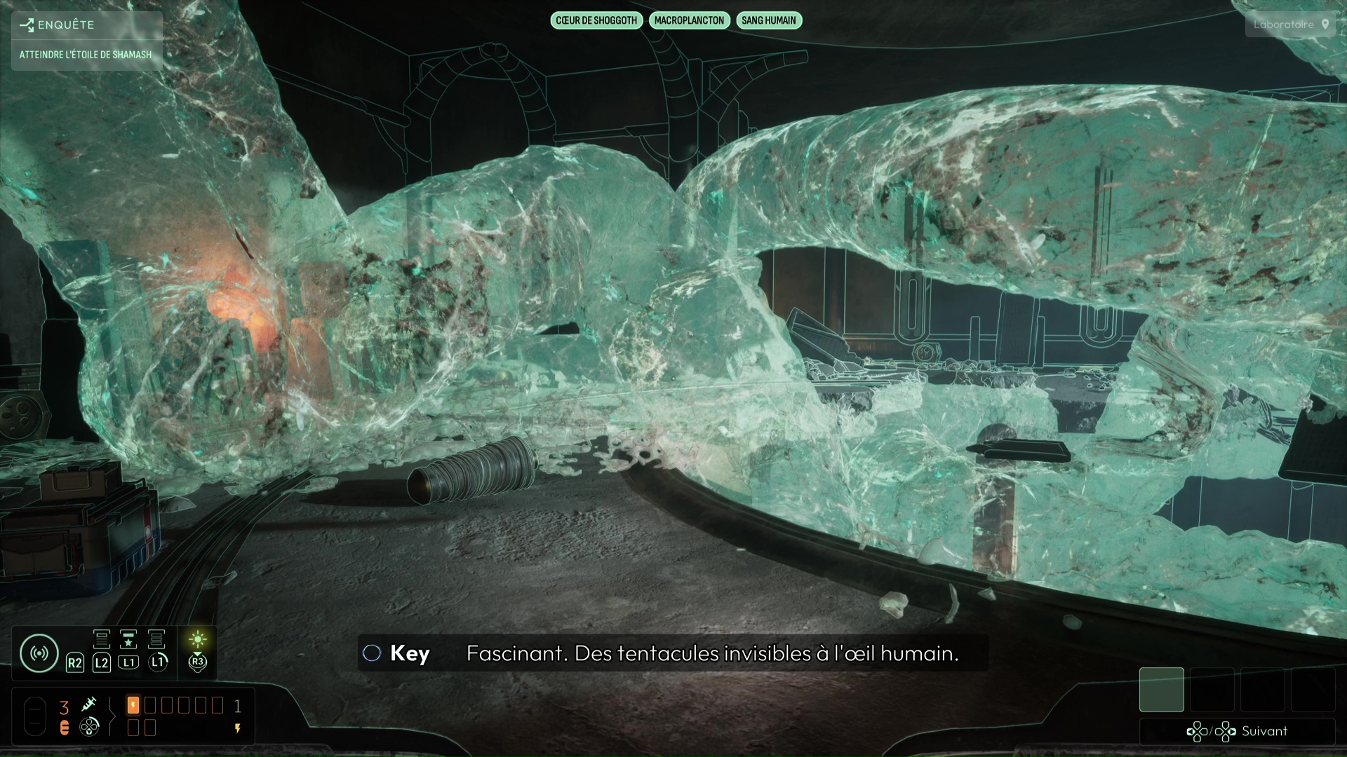 Vous allez devoir comprendre que pour circuler ici, vous aurez besoin d’apercevoir la trace de tentacules invisibles émanant du Gardien, qui s’en sert pour vous repérer et vous éliminer si besoin. Les membres d’Océan-I ayant laissé des documents et enregistrements mentionnant pouvant « marcher dans le vide », il n’en est finalement rien. Équipez-vous de la fréquence « Sécrétion organique » pour apercevoir grâce au sonar la présence de ces tentacules invisibles. Faites aussi vite que possible quand vous voulez les emprunter, puisqu’une trop grande exposition vous enverra vers une mort certaine.