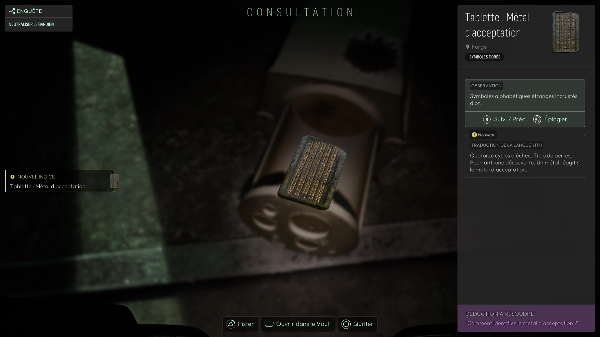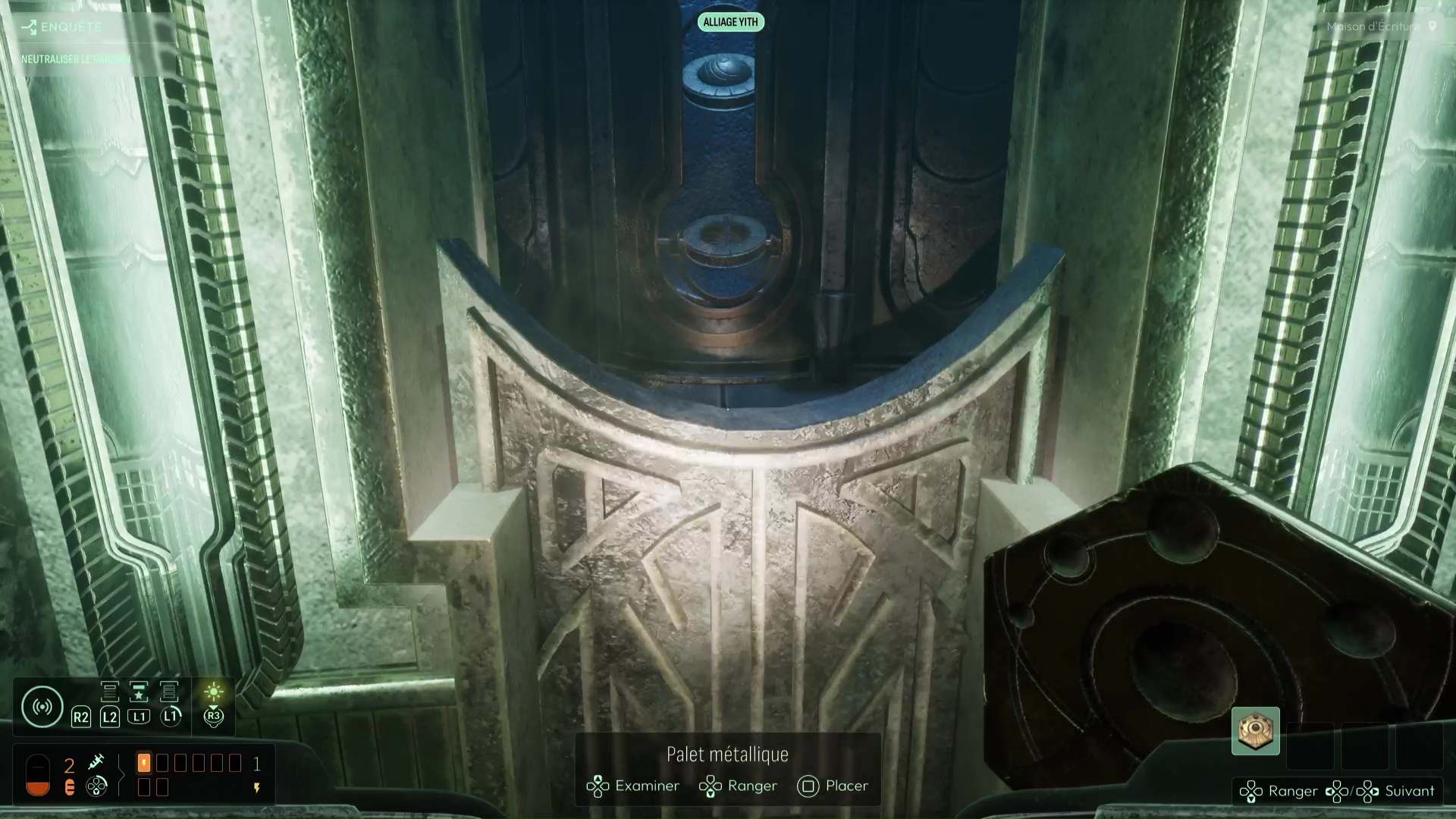 Utilisez la fréquence « Alliage Yith » pour trouver un troisième palet sur les étagères et ouvrez le coffret métallique juste à côté. En lisant la stèle, vous débloquez une nouvelle interrogation :