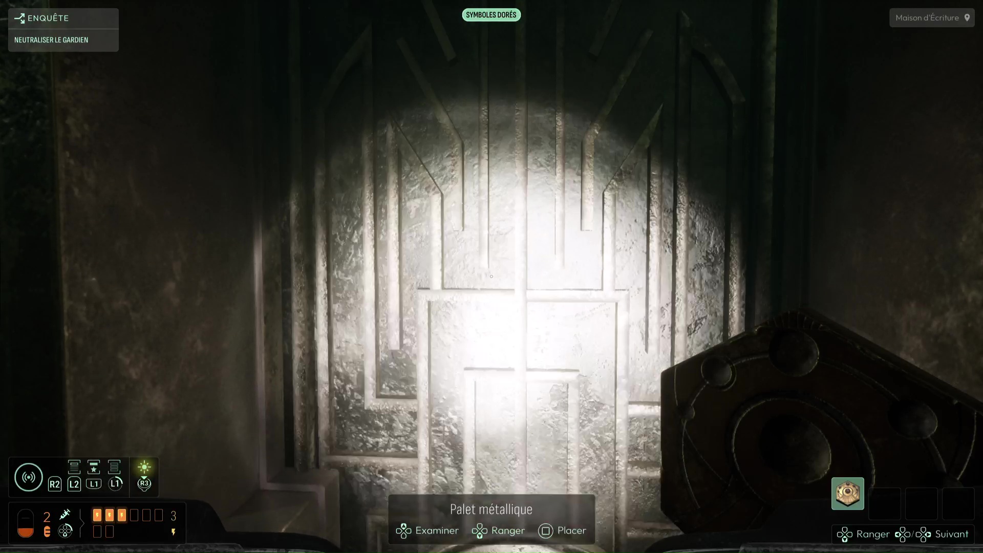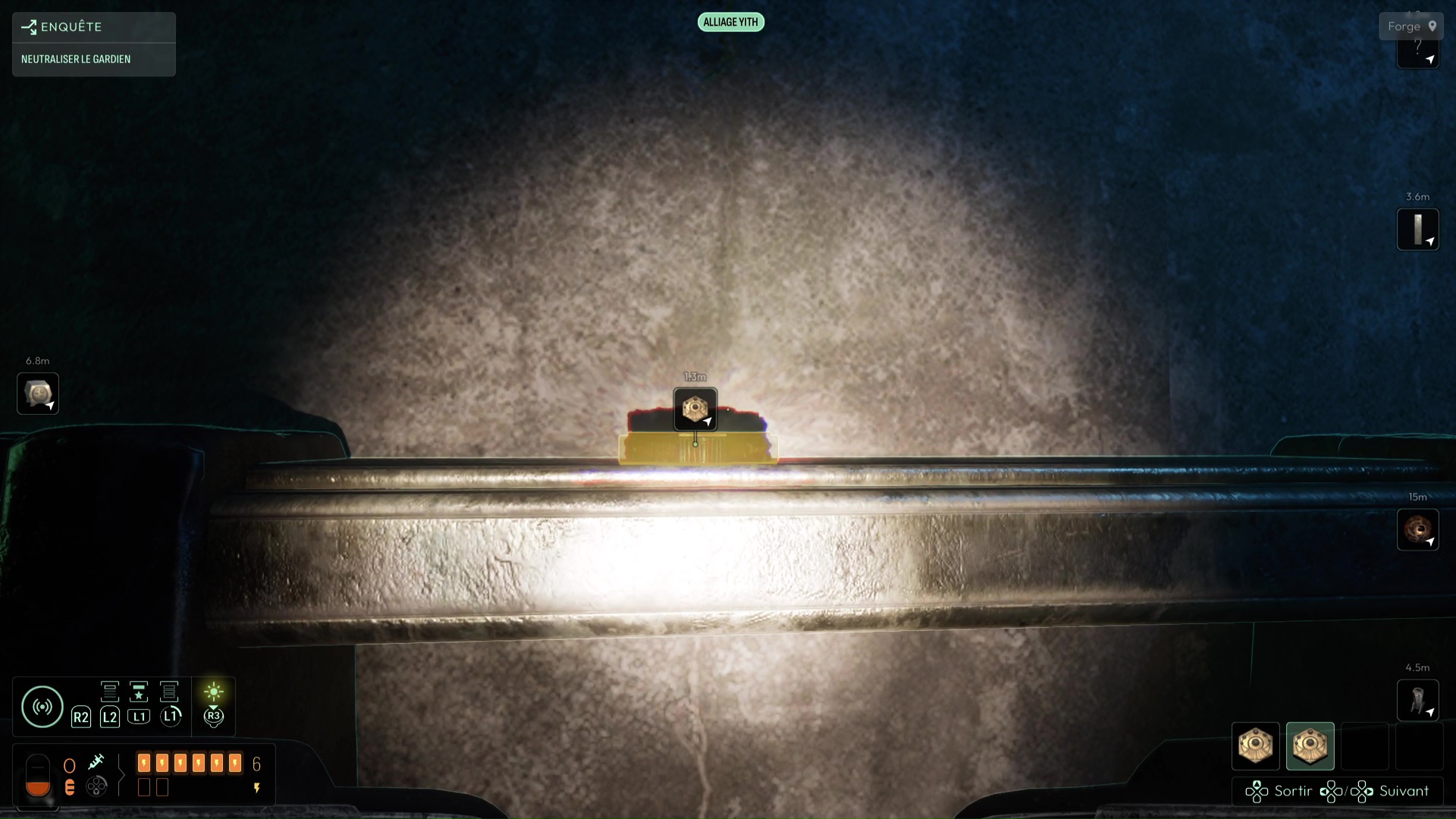 Regardez ensuite vers la droite et utilisez votre sonar (avec les trois fréquences précédentes) pour révéler des tentacules invisibles vous guidant jusqu’au prochain lieu, la Maison d’écriture. Analysez tous les indices présents dans ce lieu, dont les nouvelles stèles. L’une d’elles pourra être lue si vous parvenez à ouvrir le coffre métallique situé ici. En réalité, il faudra vous équiper d’une sorte de palet électromagnétique permettant l’ouverture de coffres et de portes à son approche. La stèle en question mentionnera l’existence d’une Forge, indice capital pour poursuivre sur la voie à basse corruption à venir. Reprenez le palet métallique et analysez-le pour débloquer la fréquence « Alliage Yith » si jamais vous ne l’avez pas encore débloquée et approchez des portes métalliques présentes dans cette maison.