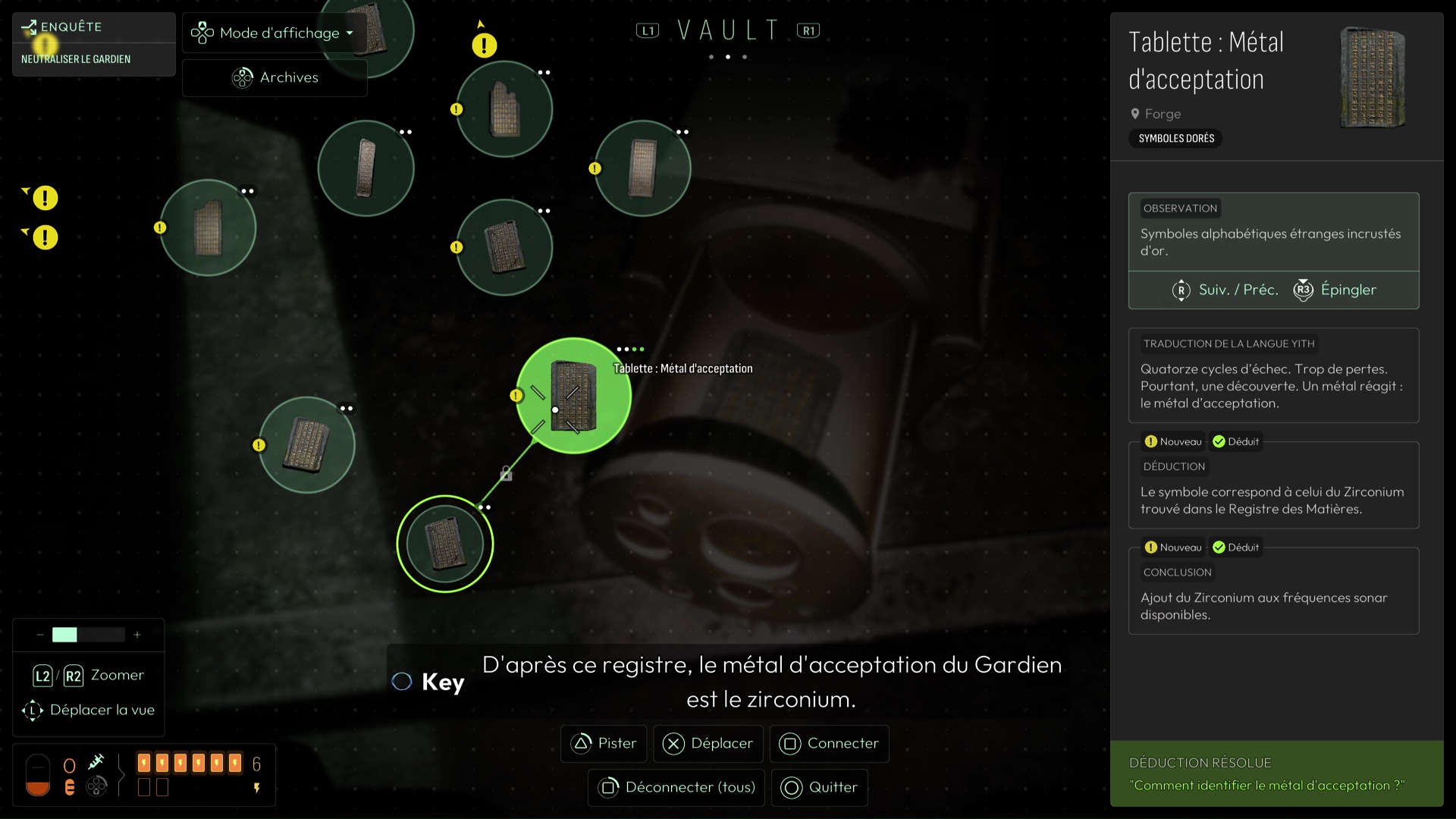 - Pour résoudre cette interrogation, faites glisser le sous-indice « Tablette : Registre des matières » sur celle-ci et ainsi en déduire le rôle central du Zirconium dans votre affaire.