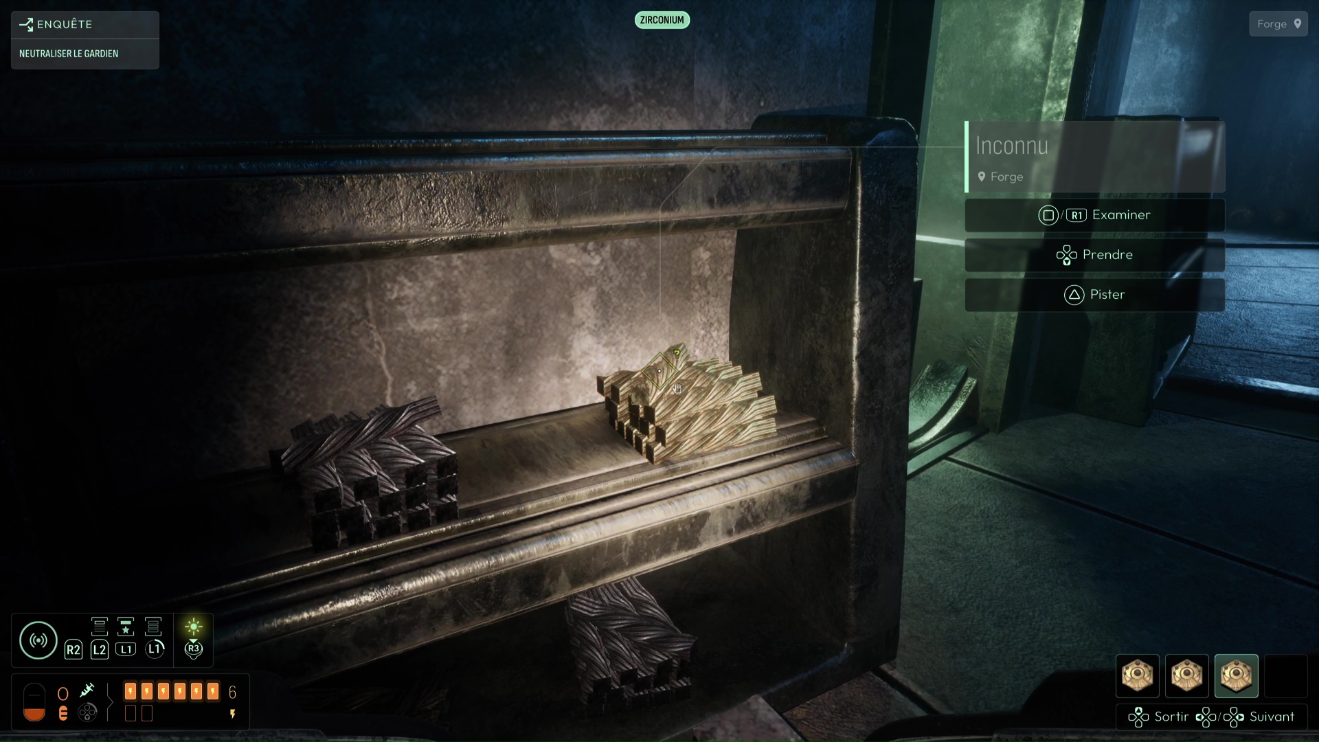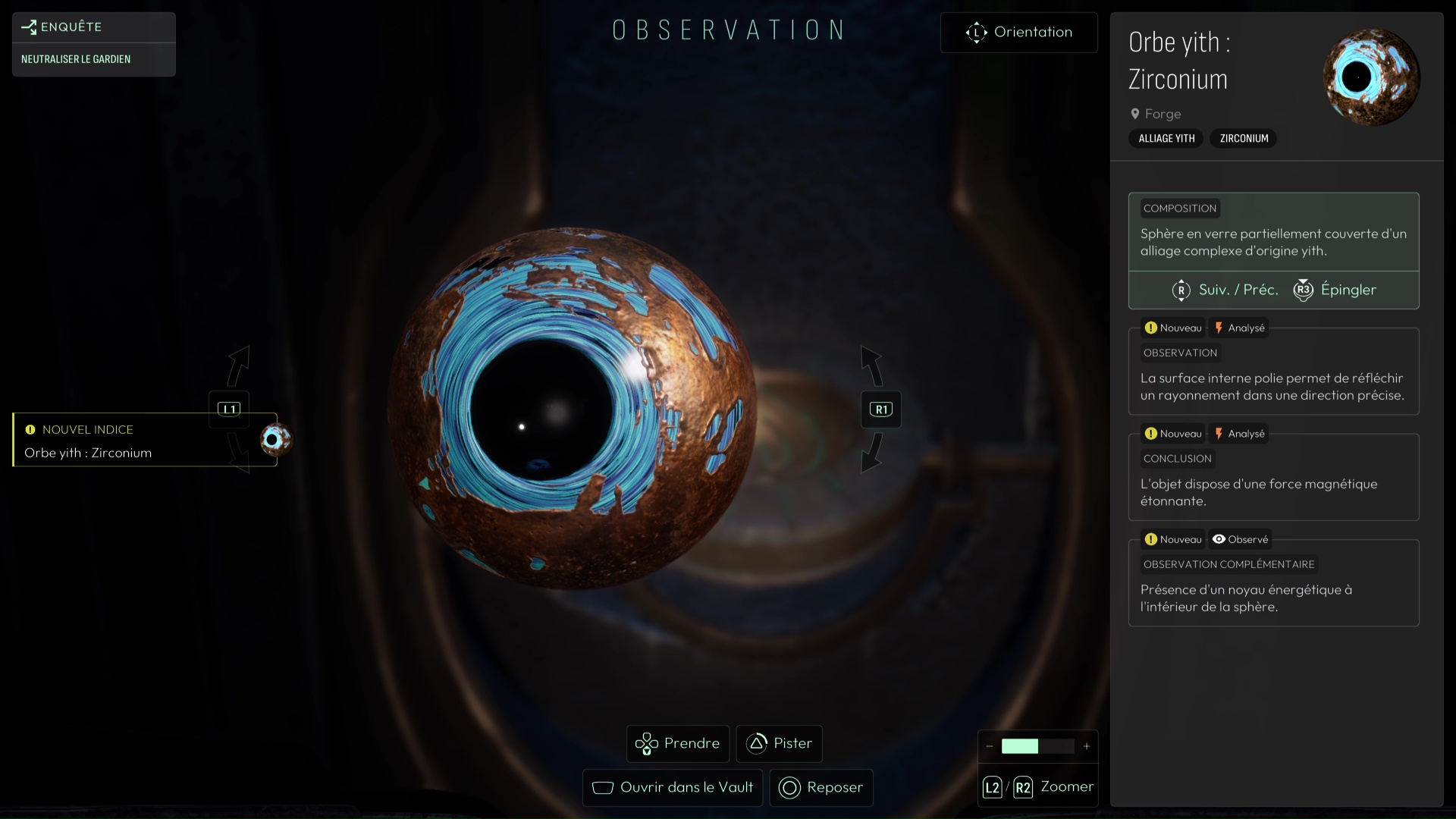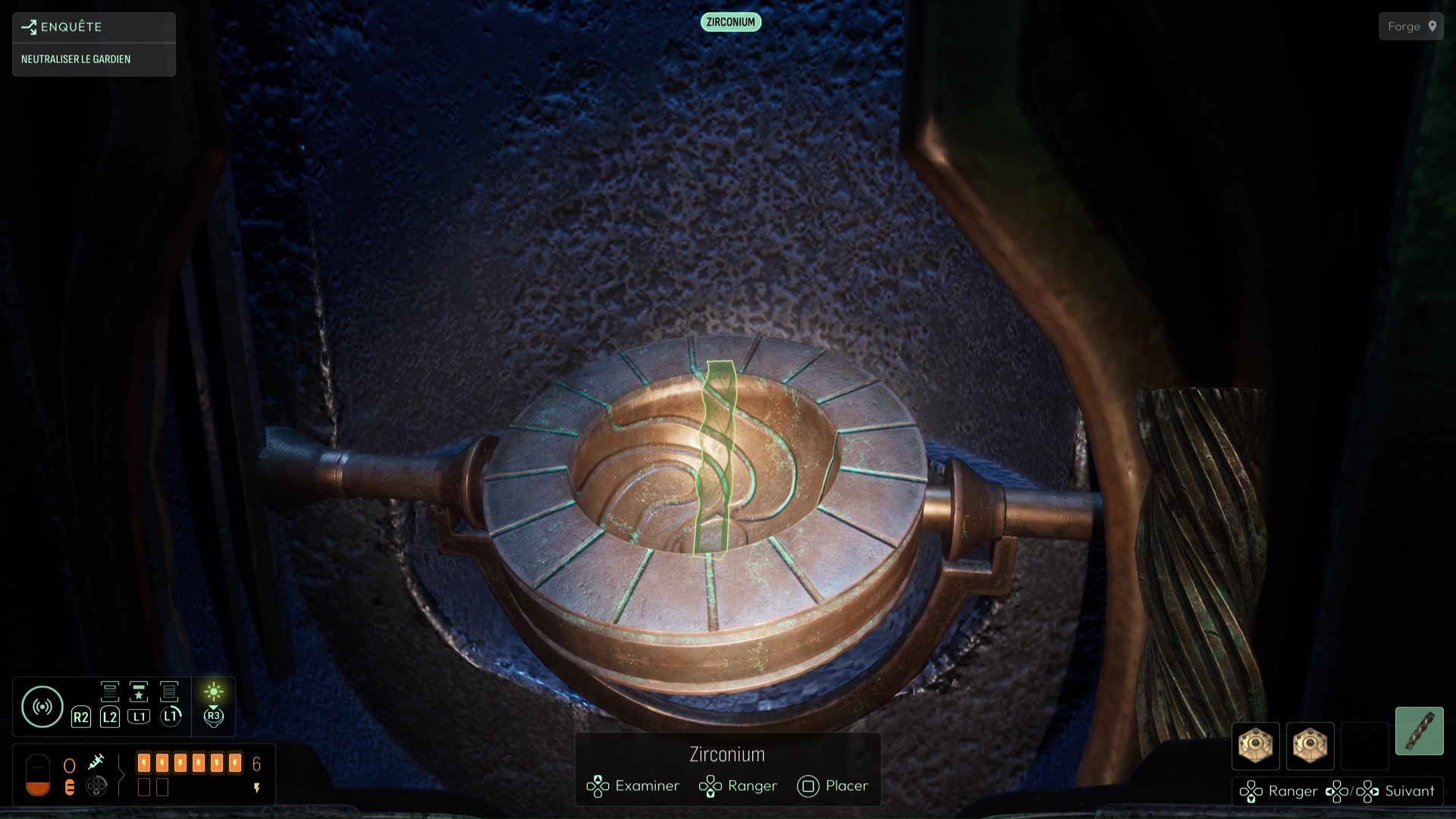Utilisez la fréquence « Zirconium » ainsi obtenue pour trouver une tige de ce matériau juste à côté dans la Forge. La suite est un peu plus difficile à comprendre soi-même. Il vous faudra placer cet élément de Zirconium dans la sphère de la Forge (crevasse rocheuse à l’entrée de la pièce) puis tenir un palet métallique dans votre main pour activer la Forge et produire une Sphère Yith en Zirconium, objet nécessaire à l’hypnose du Gardien. Il vous faudra trouver des plaques au sol faisant office d’intermédiaire pour lancer cette hypnose. L’une d’elles se trouve à l’étage de la tour de la Citadelle de laquelle vous avez emprunté le chemin menant à la Maison d’écriture.