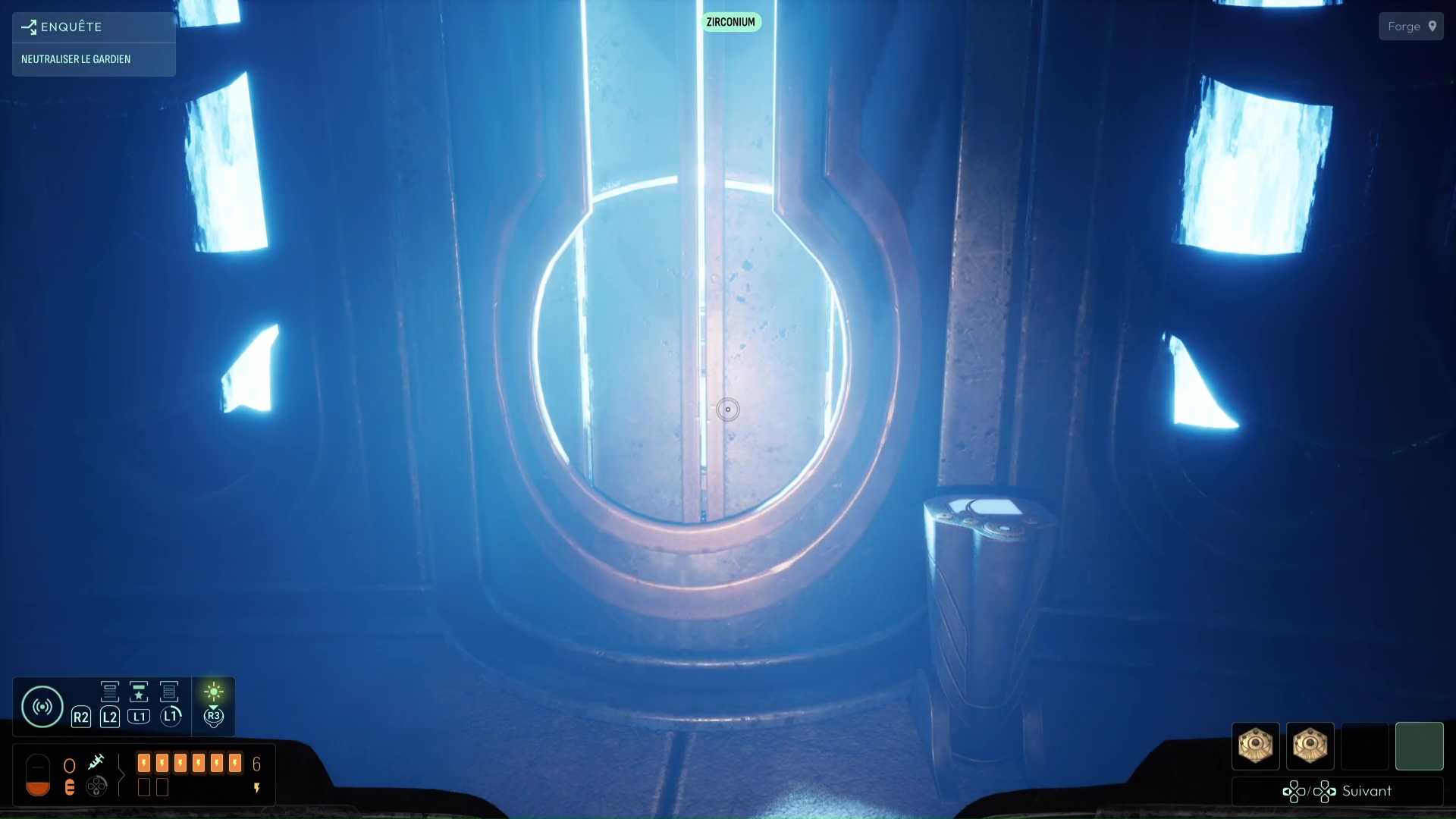Derrière une caisse, vous trouverez le palet que vous avez pu louper en rencontrant pour la première fois le Gardien. Si vous voulez y aller plus vite, descendez l’escalier et trouvez une porte magnétique s’ouvrant avec un seul palet. Tournez à droite dans la coursive, et poursuivez tout droit jusqu’à traverser les tentacules au sol à gauche pour rejoindre votre point de départ dans cette Citadelle. Le palet en poche, revenez à la porte de la Forge (précédemment bloquée) et présentez les deux palets (par exemple un au sol et un dans vos mains) pour ouvrir l’accès et pénétrer dans la Forge.