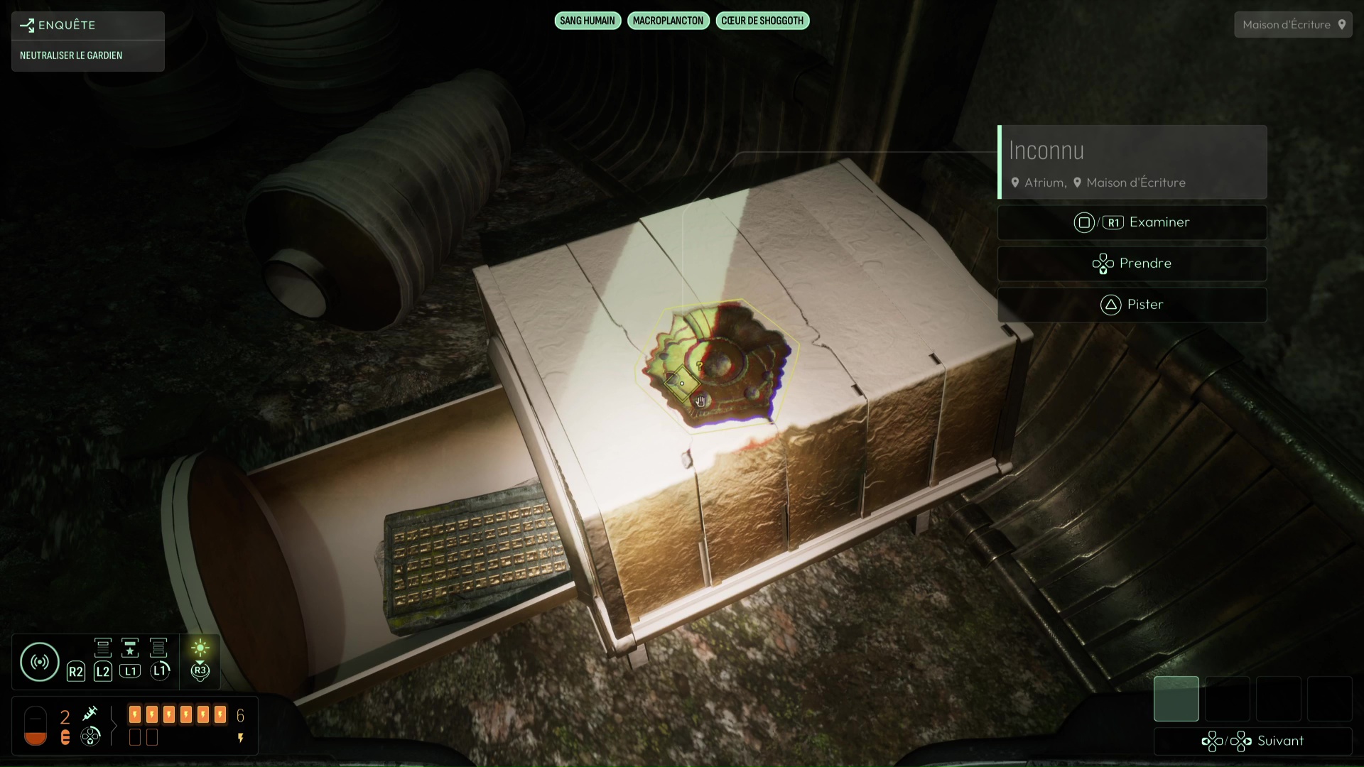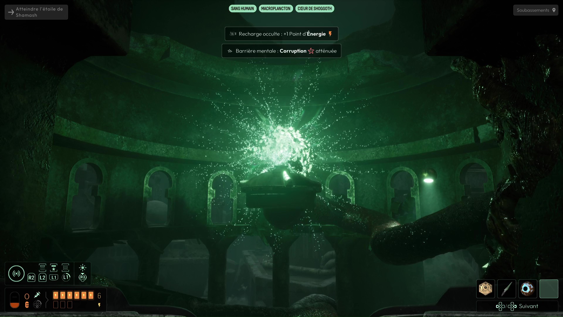 - Un cœur de Shoggoth se situe sur l’étagère au-dessus du premier coffre magnétique que vous rencontrez ici (examinez les plaques dorées pour le repérer si jamais)