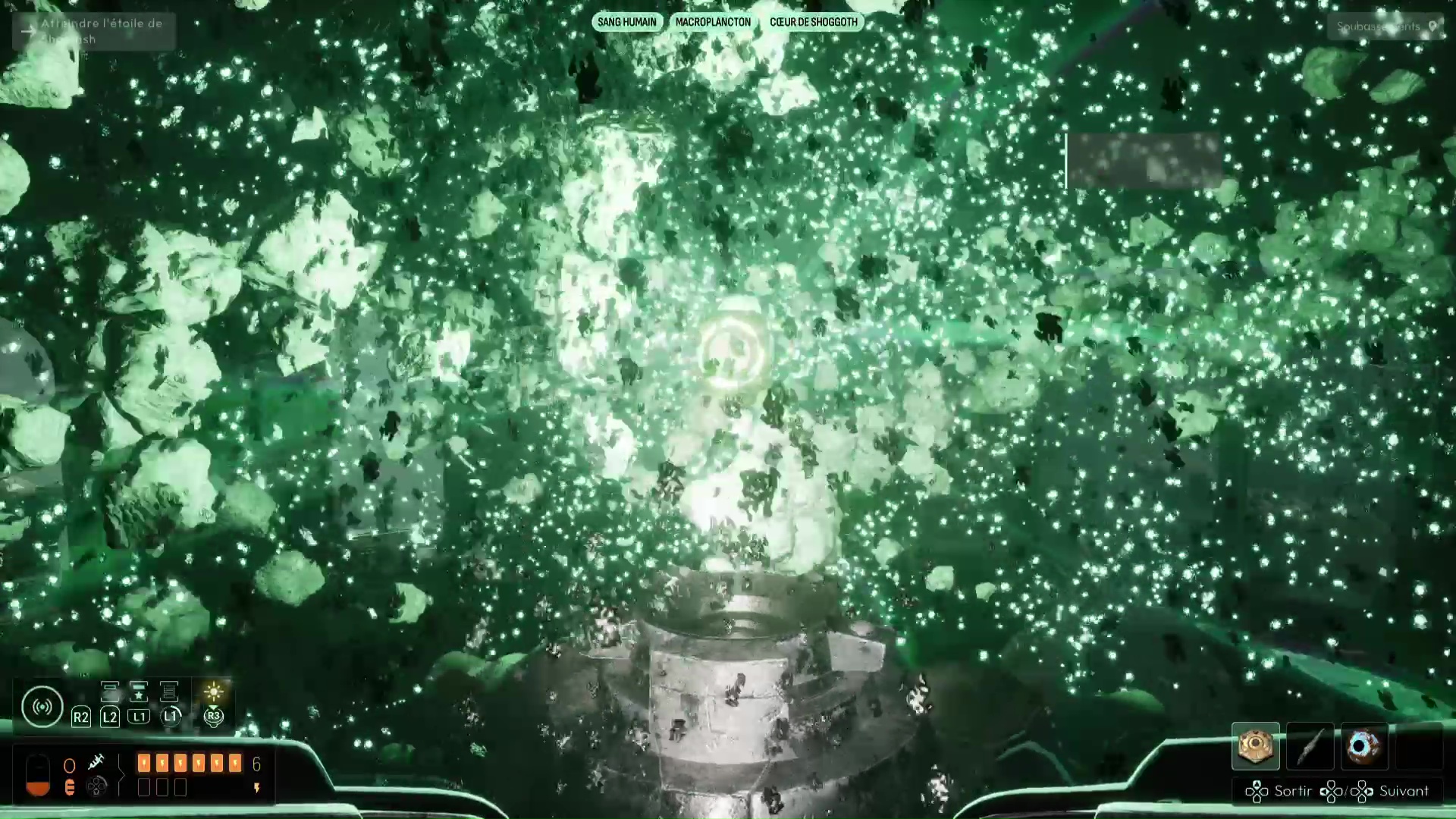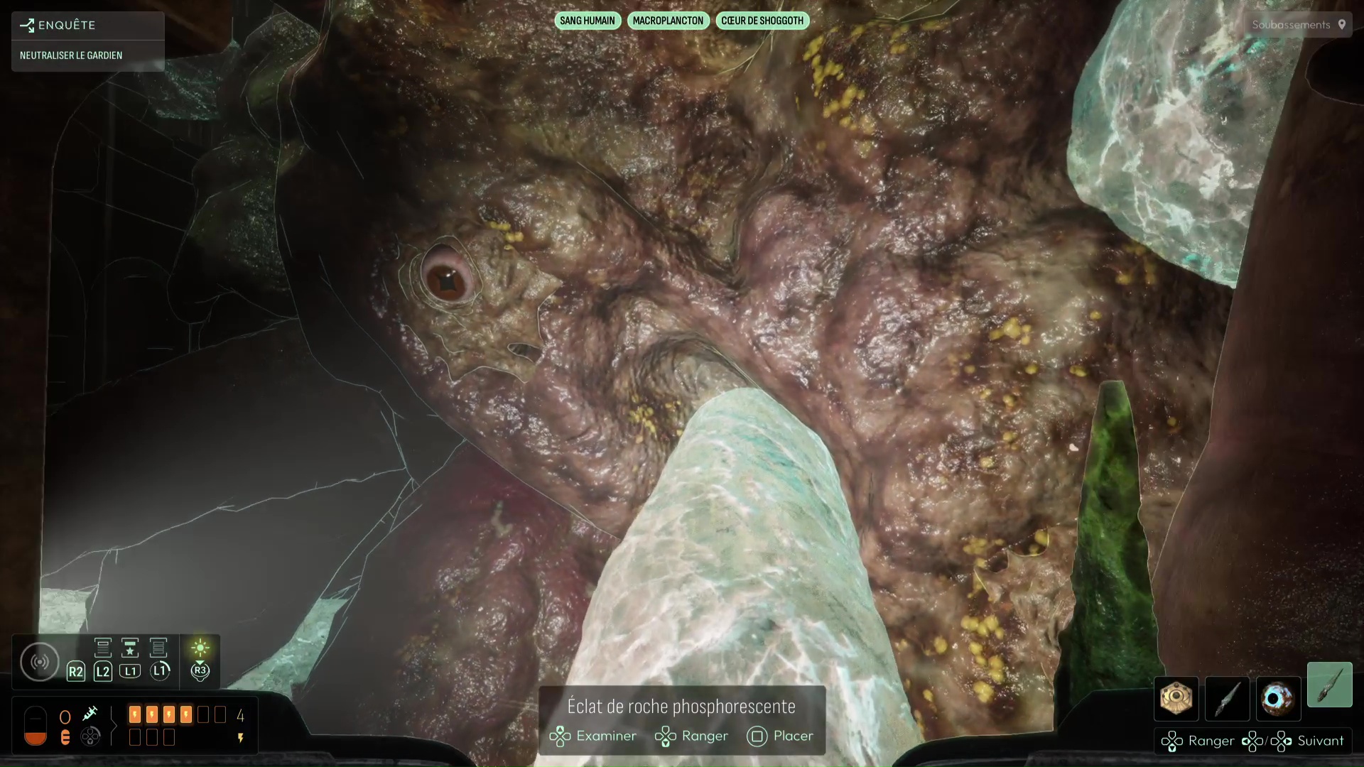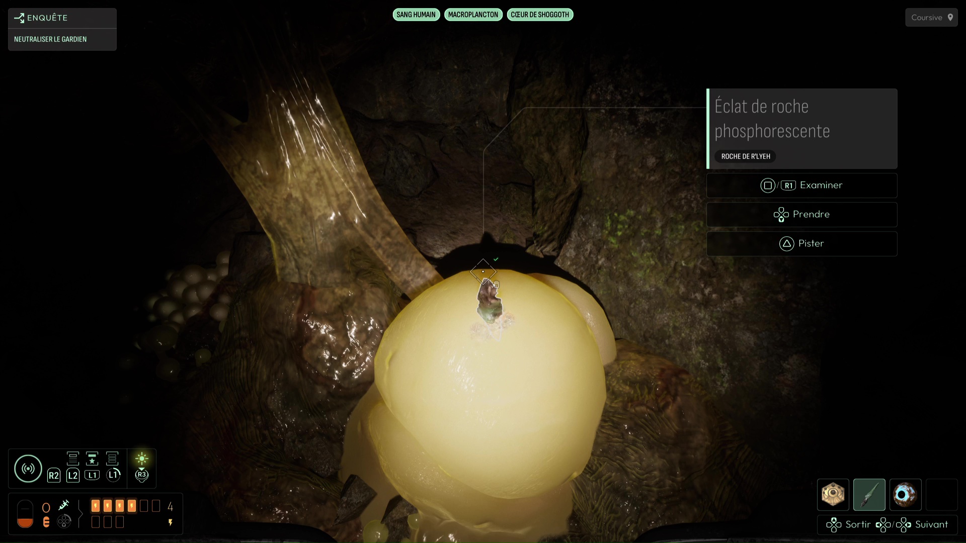 Vous avez deux possibilités : rejoindre la coursive de la Maison d’écriture où se trouve de la sève extradimensionnelle (accroupissez-vous en prenant garde aux tentacules invisibles), ou rejoindre le laboratoire pour en trouver. Dans tous les cas, plantez votre pierre dans la sève pour voir la réaction chimique et ainsi espérer détruire la créature. Récupérez votre pierre désormais « active » (éclat de roche phosphorescent) pour vous lancer dans l’ultime partie de cette quête.