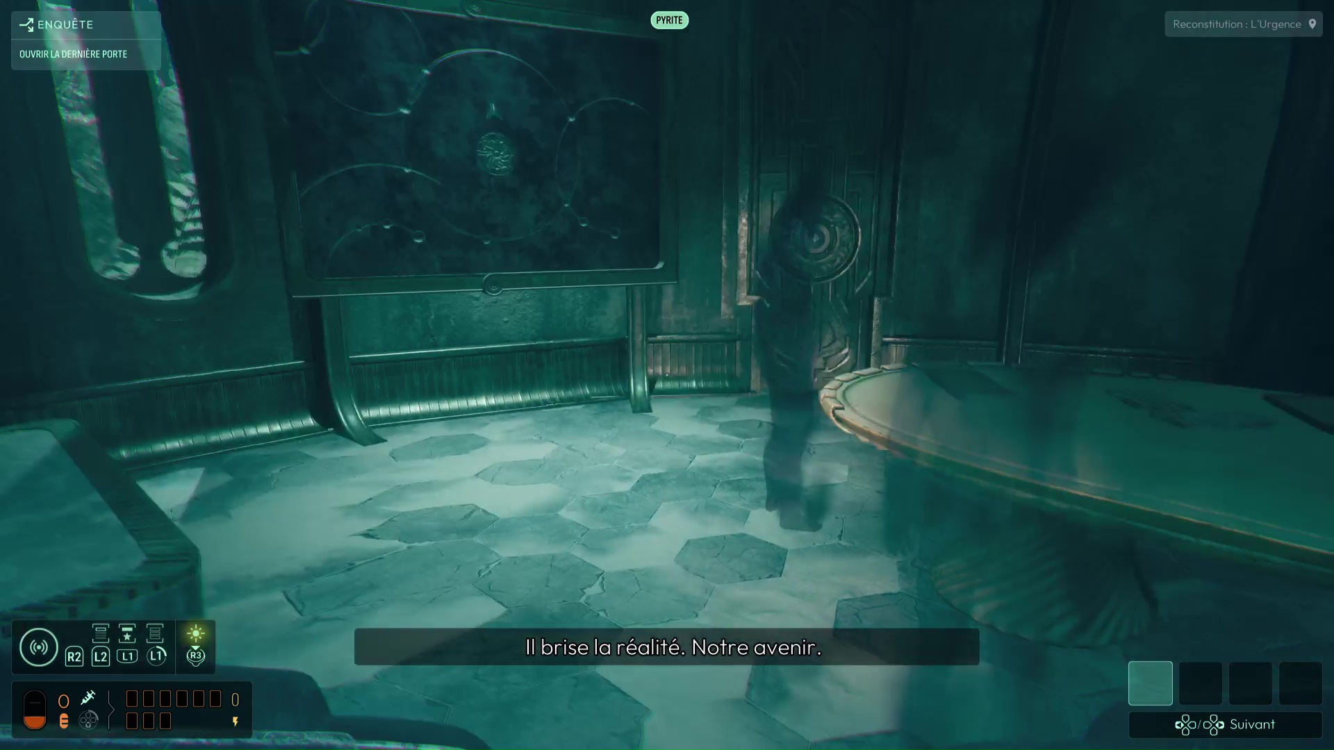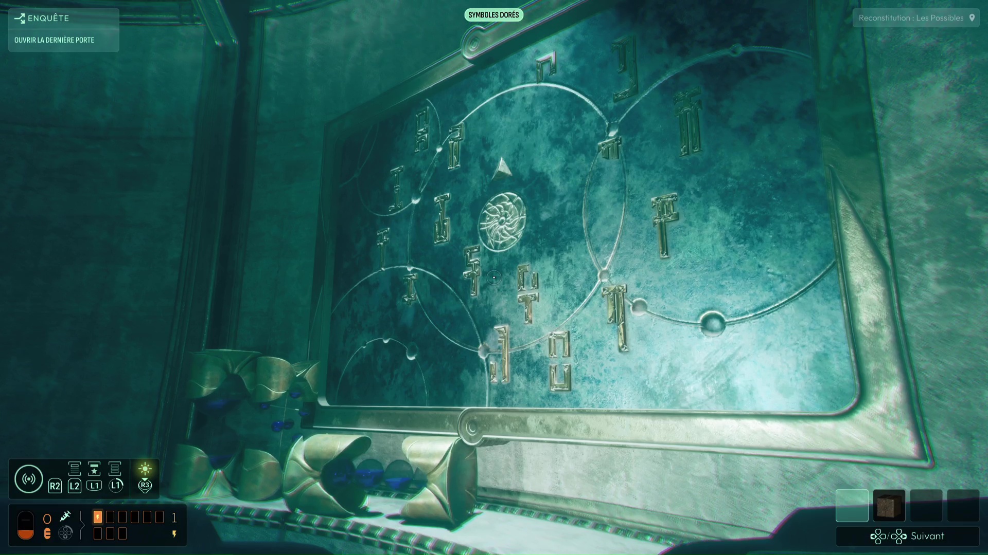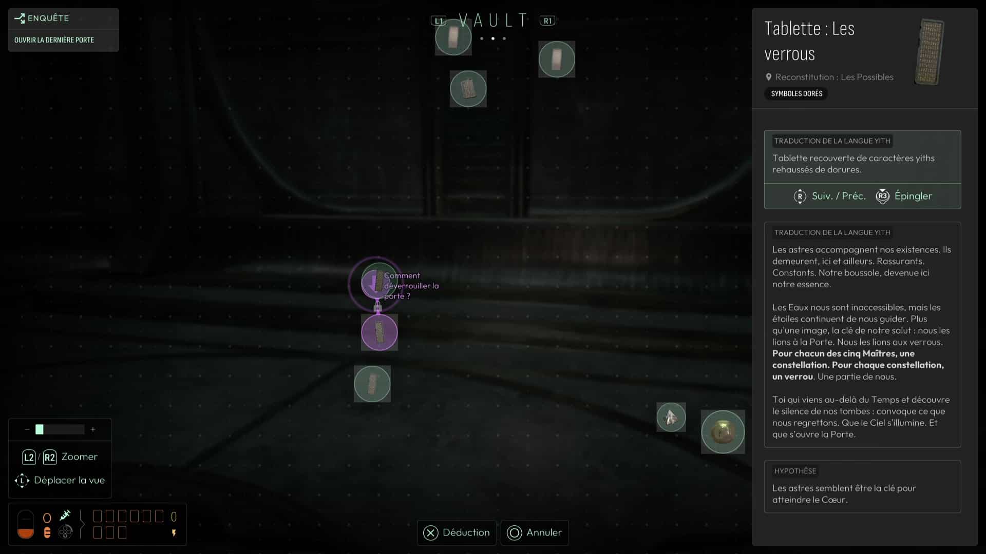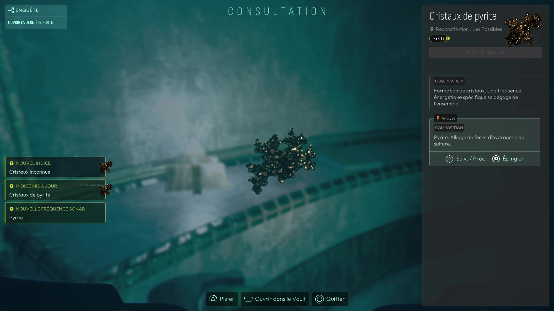 Dans cette vision « Reconstitution : Les Possibles », analysez tous les indices de la pièce, dont surtout la Carte céleste et les cristaux présents. En analysant ces derniers, vous débloquerez la fréquence « Pyrite » pour votre sonar, pouvant modifier la forme de matériaux métalliques. D’autres indices sont présents dans cette vision, comme les « serrures » permettant de faire avancer votre interrogation sur l’ouverture de la porte, vous permettant d’en conclure que chaque serrure de la porte correspond à une constellation. Une nouvelle interrogation s’ouvre donc.