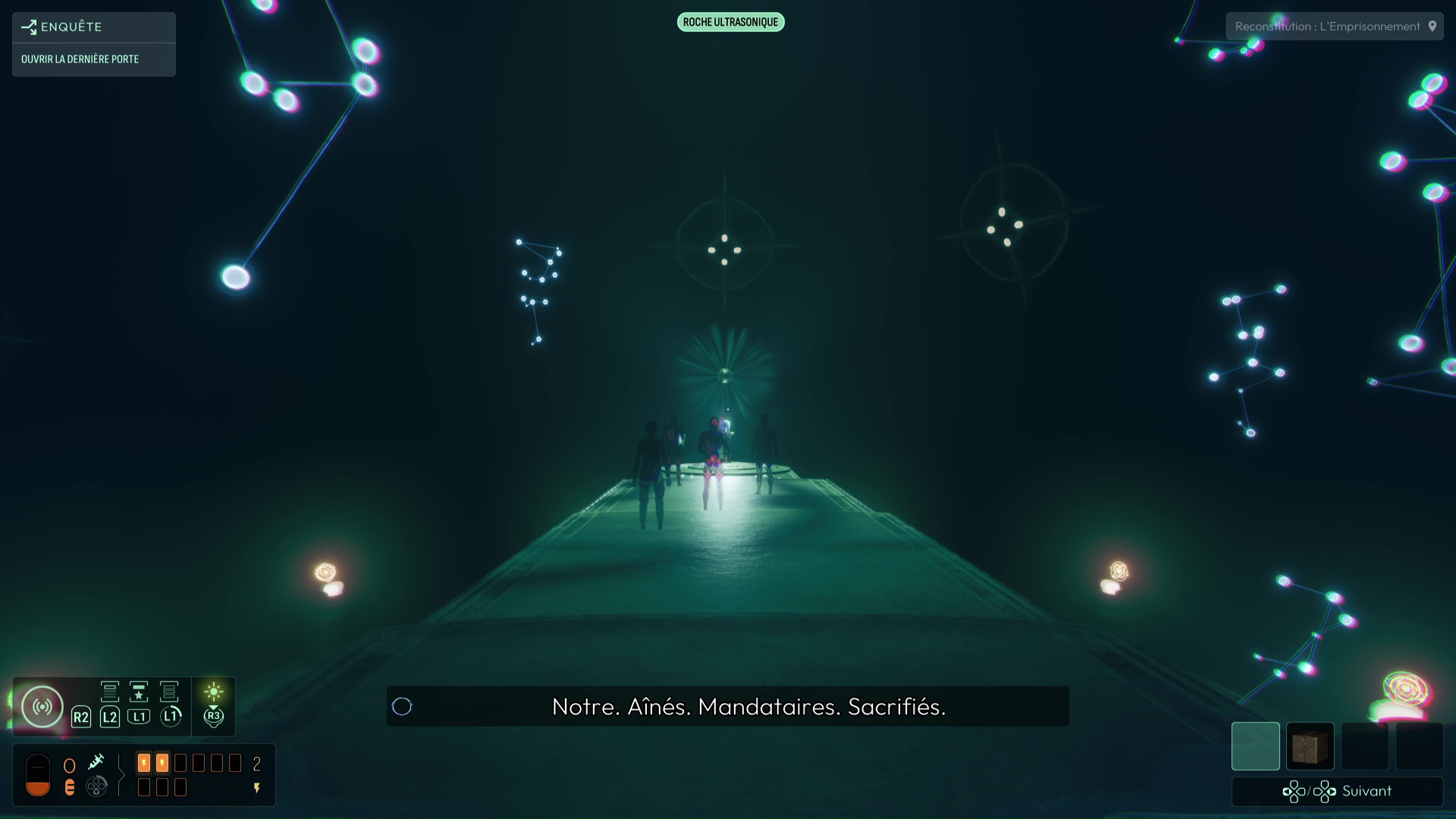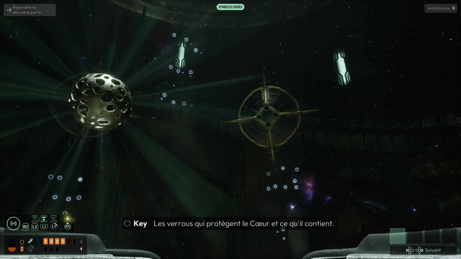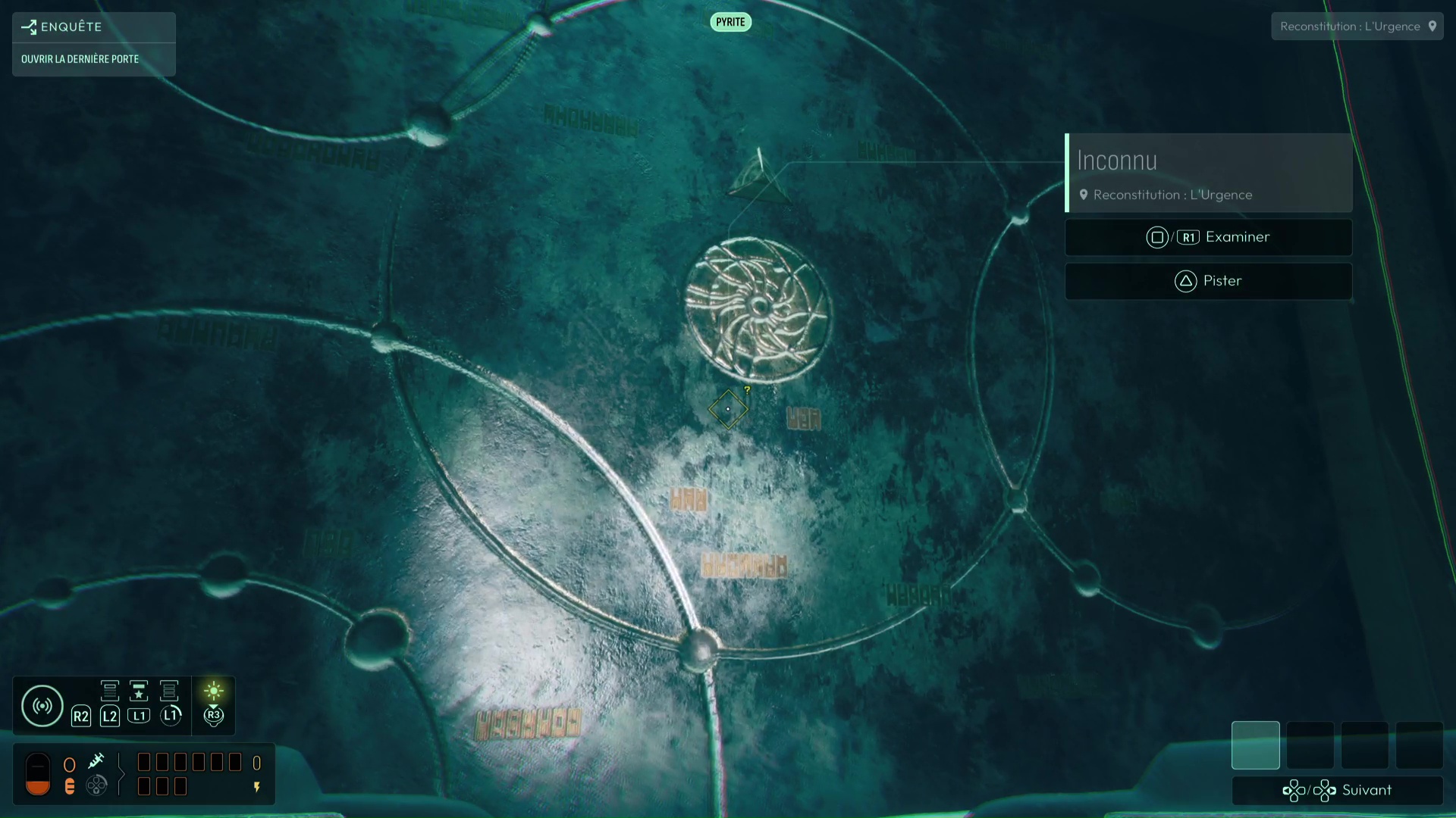 Dans cette vision « Reconstitution : Les Possibles », analysez tous les indices de la pièce, dont surtout la Carte céleste et les cristaux présents. En analysant ces derniers, vous débloquerez la fréquence « Pyrite » pour votre sonar, pouvant modifier la forme de matériaux métalliques. D’autres indices sont présents dans cette vision, comme les « serrures » permettant de faire avancer votre interrogation sur l’ouverture de la porte, vous permettant d’en conclure que chaque serrure de la porte correspond à une constellation. Une nouvelle interrogation s’ouvre donc.