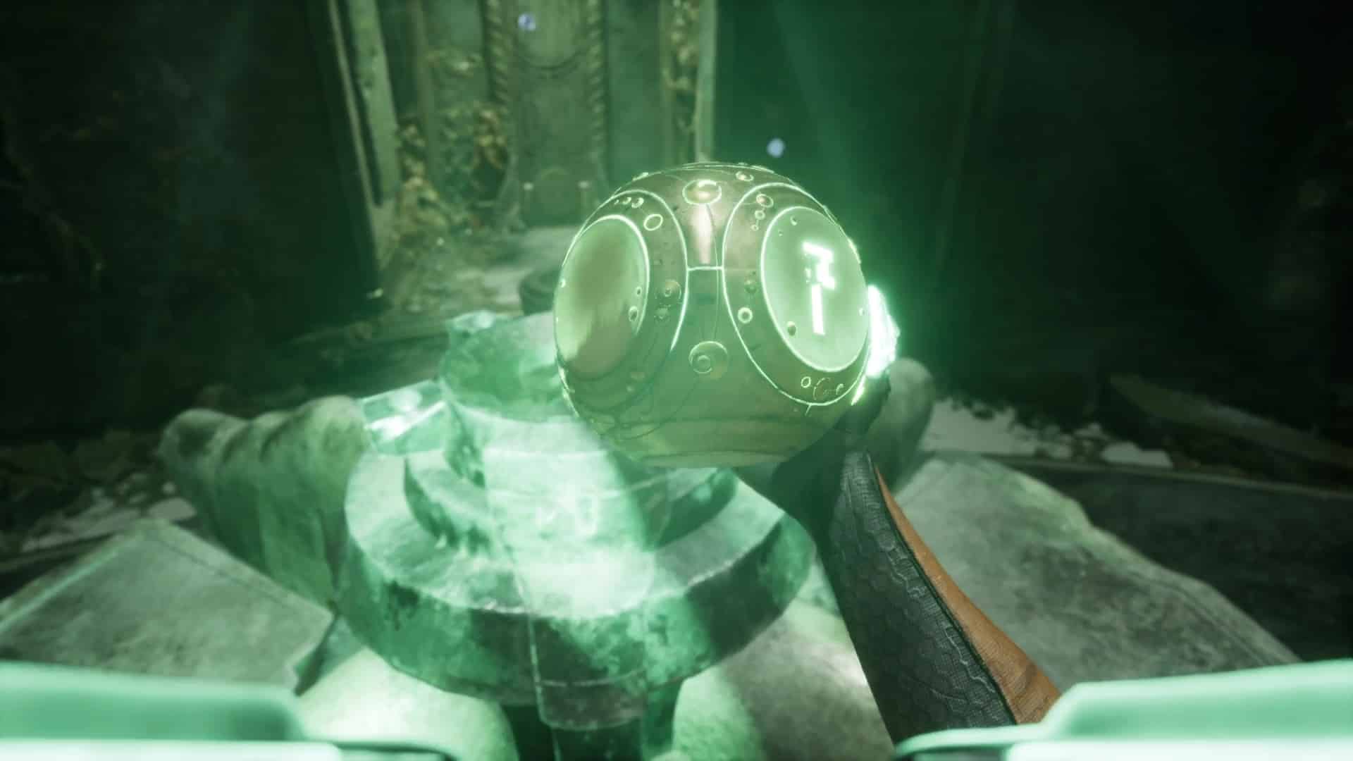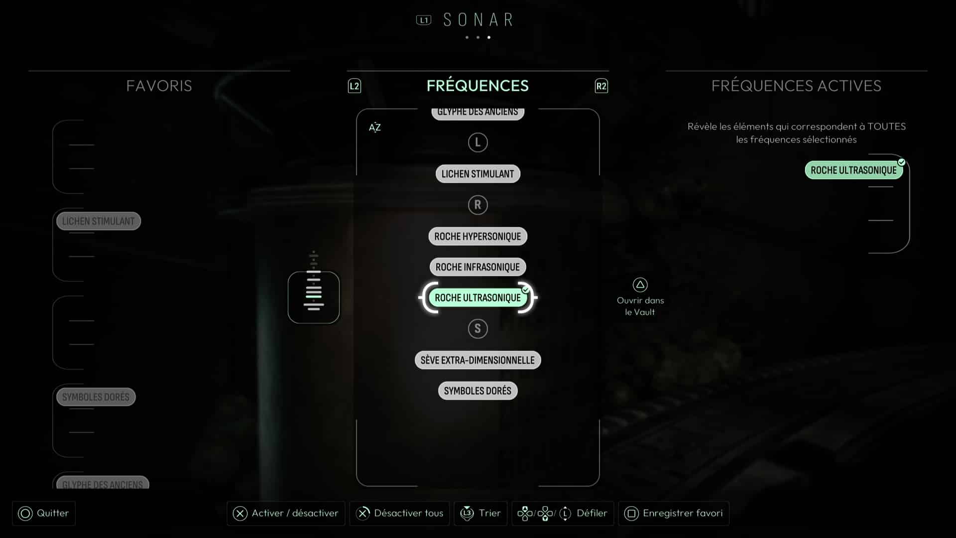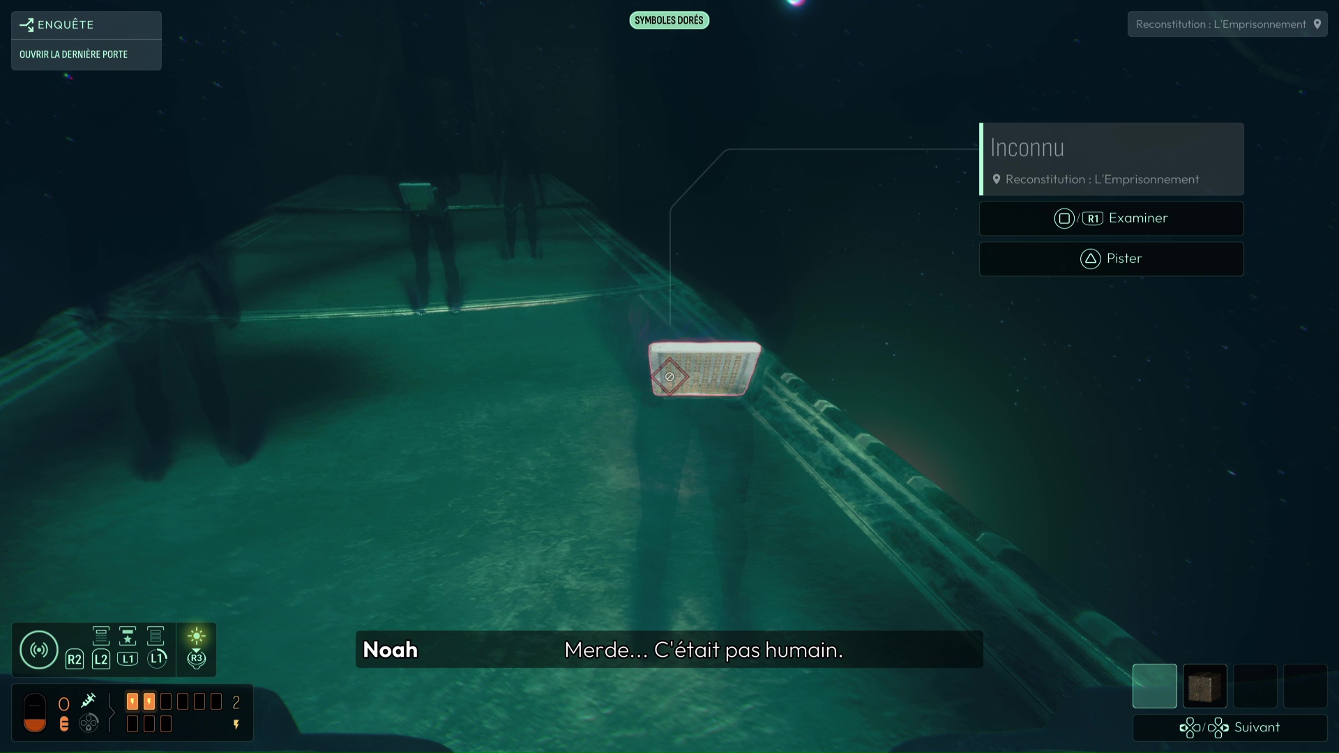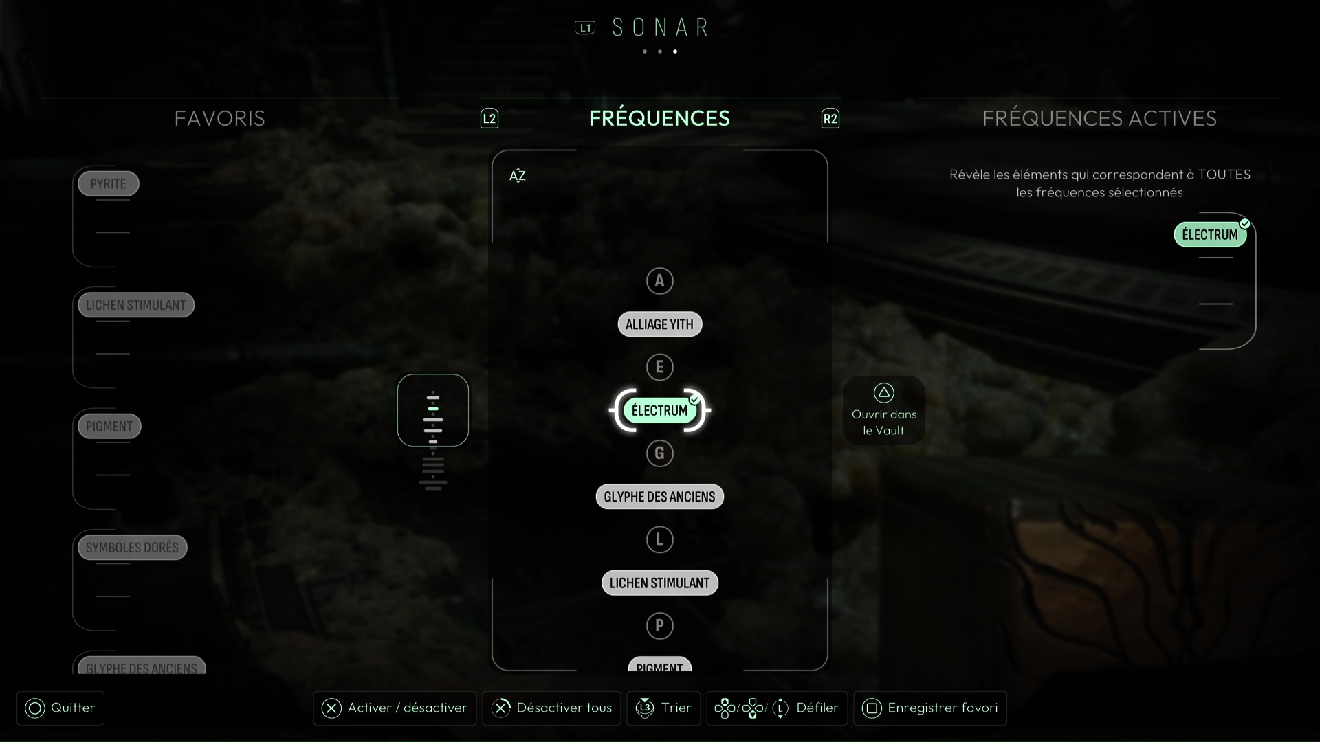 Dans cette vision « Reconstitution : Les Possibles », analysez tous les indices de la pièce, dont surtout la Carte céleste et les cristaux présents. En analysant ces derniers, vous débloquerez la fréquence « Pyrite » pour votre sonar, pouvant modifier la forme de matériaux métalliques. D’autres indices sont présents dans cette vision, comme les « serrures » permettant de faire avancer votre interrogation sur l’ouverture de la porte, vous permettant d’en conclure que chaque serrure de la porte correspond à une constellation. Une nouvelle interrogation s’ouvre donc.
