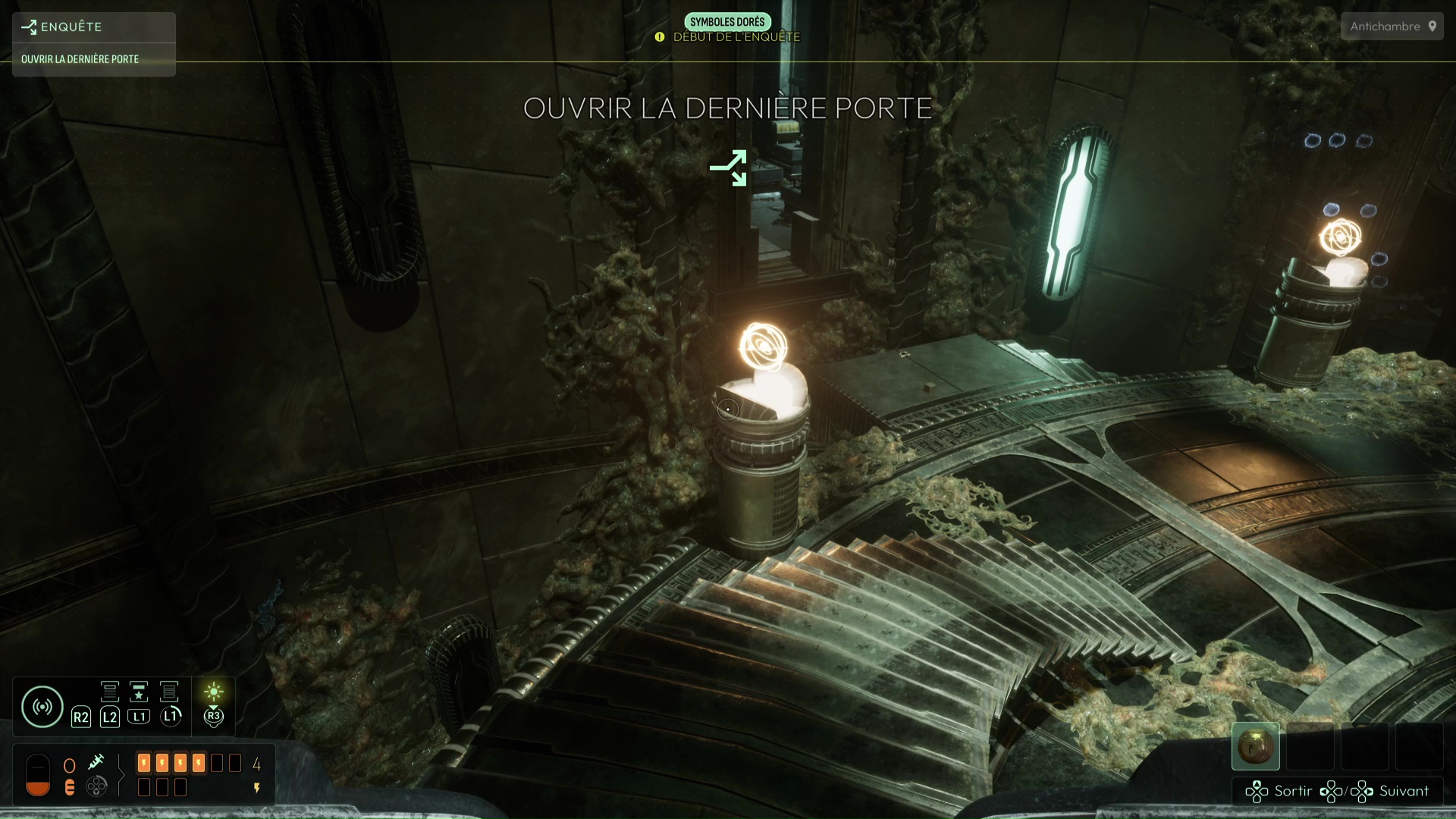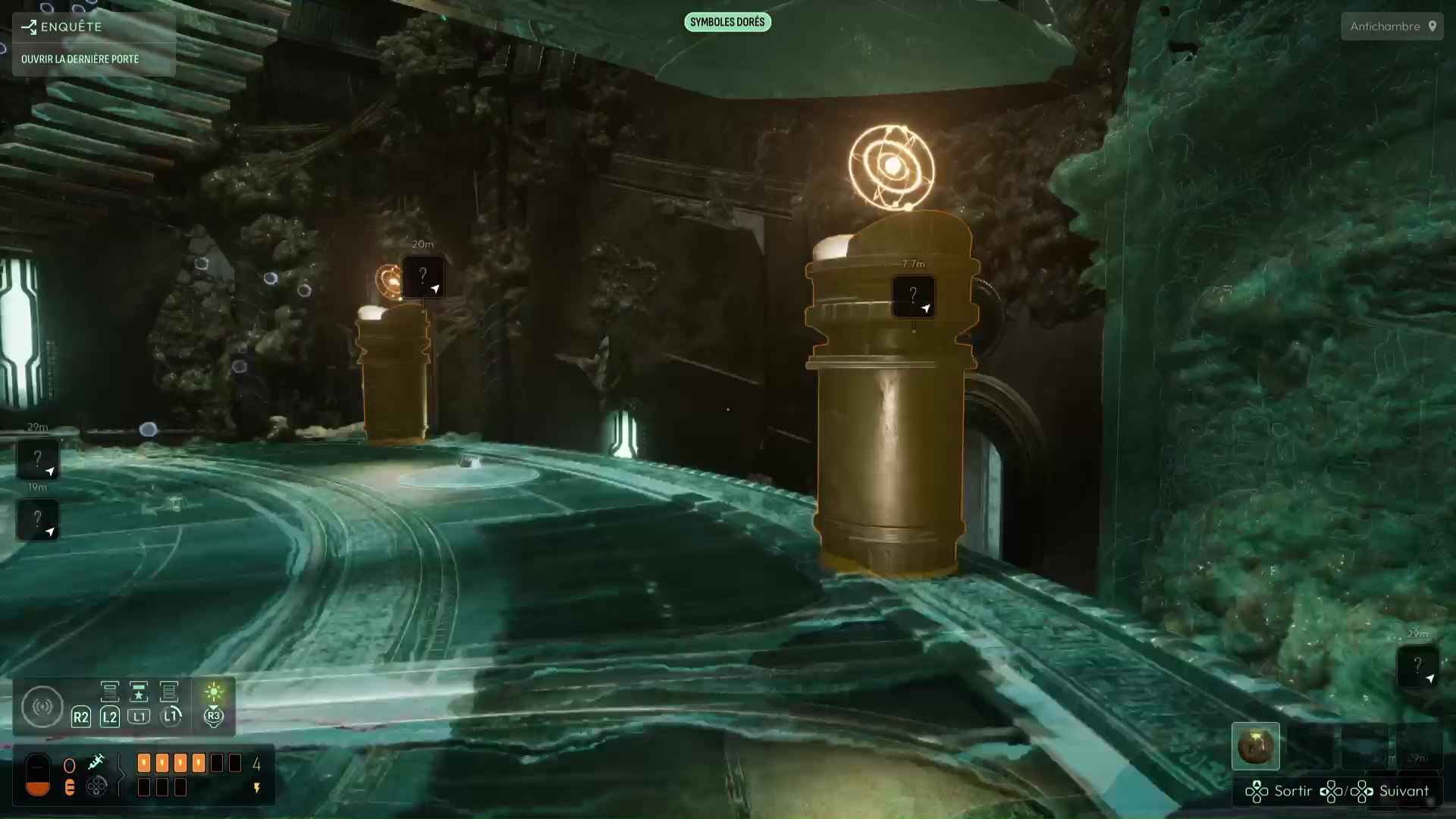 Placez l’Étoile de Shamash sur le piédestal devant vous, puis reprenez-la pour que la salle se mette en place de haut en bas, y compris les escaliers vous permettant de descendre juste au niveau inférieur pour commencer. Analysez l’intégralité des piliers (appelés Prières dans cette partie du jeu) et récupérez aussi le lichen attenant à l’un d’eux. Tout autour de cette salle circulaire se trouvent des salles contenant d’autres piliers. La plupart de ces salles sont inaccessibles pour l’instant, mais vous pourrez en trouver une qui l’est en bas de l’un des deux escaliers descendant une nouvelle fois au niveau inférieur.