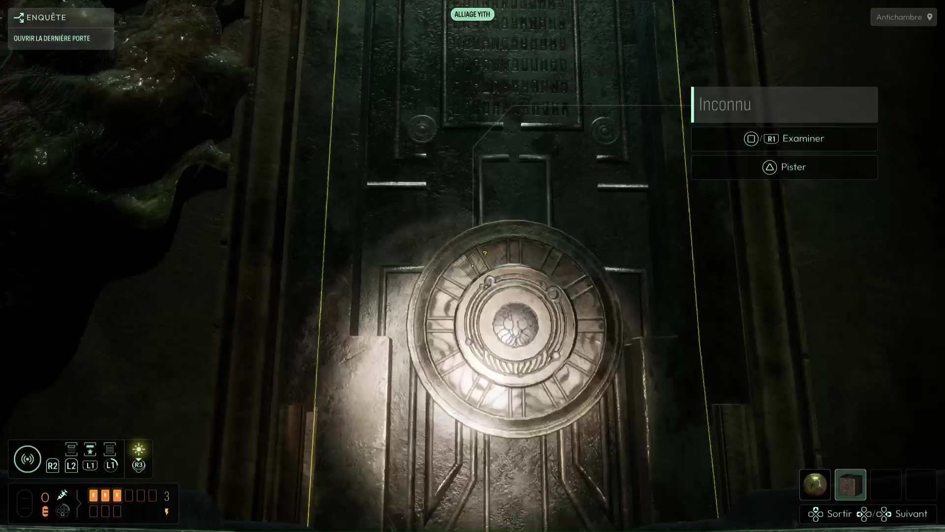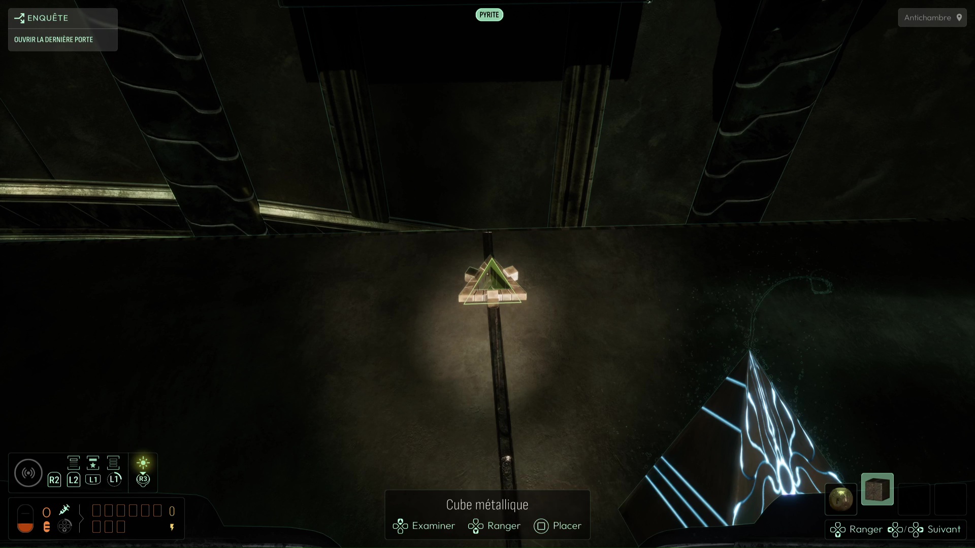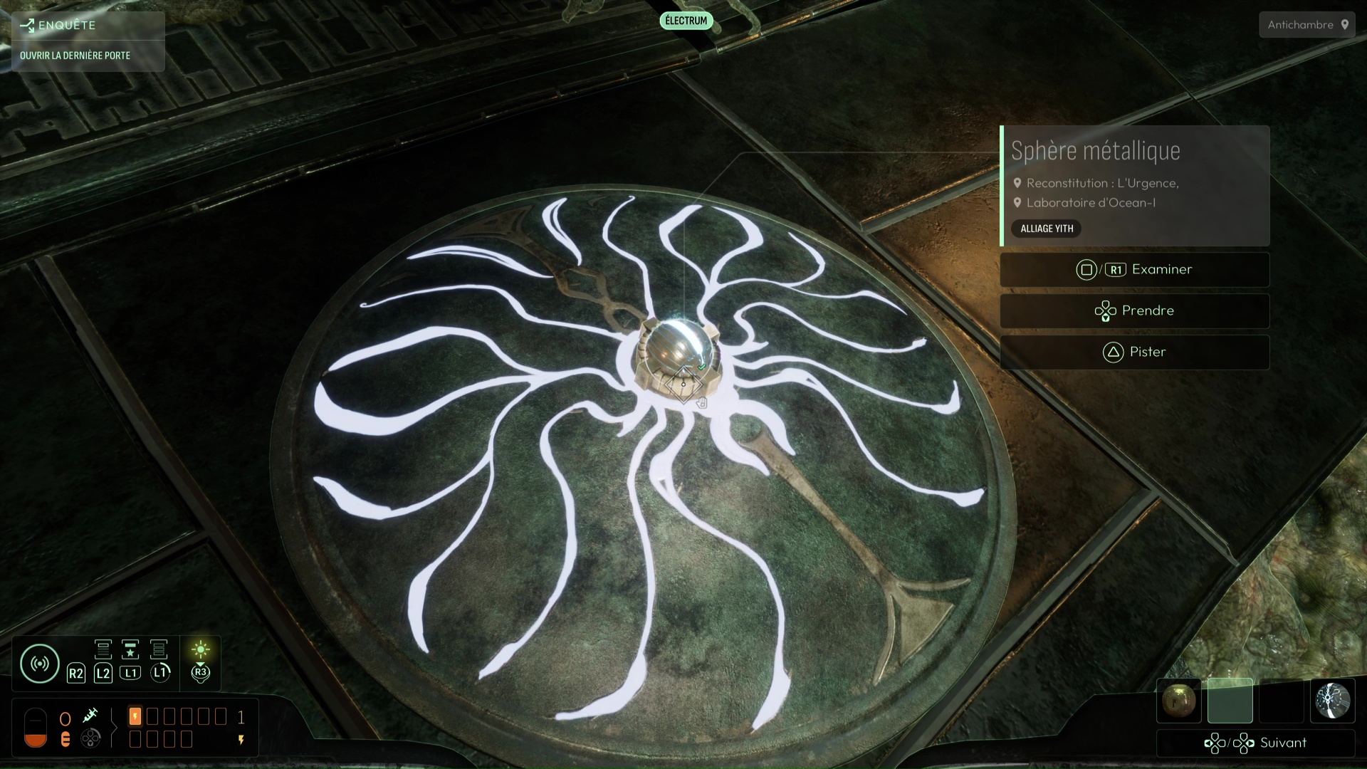 Si vous voulez opter pour la voie à basse corruption, il vous faudra préalablement vous munir de cinq cubes métalliques à retrouver notamment dans le Mémorial du Bâtisseur. Utilisez votre fréquence « Electrum » pour transformer vos cubes métalliques en sphères métalliques et ainsi les positionner dans les cinq plaques métalliques aperçues en début de chapitre. C’est la seule manière de vous protéger de l’influence néfaste de Cthulhu en ouvrant la Dernière Porte.
